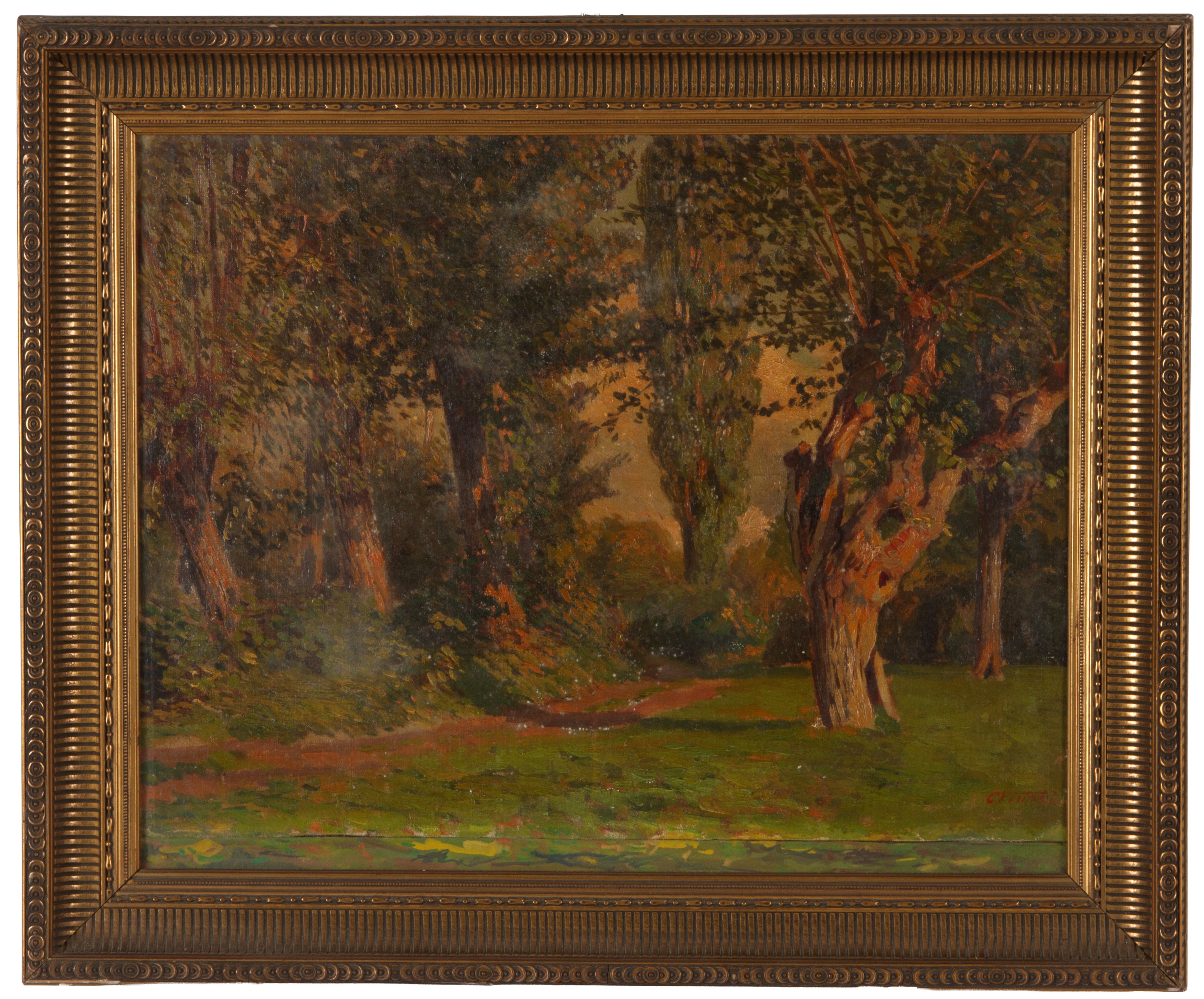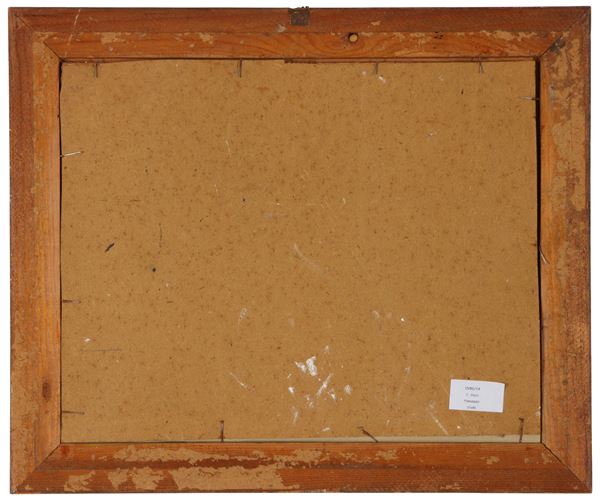 Dipinto olio su cartoncino raffigurante “PASSAGGIO BOSCHIVO”. Firmato in basso a destra. In cornice. Difetti.
