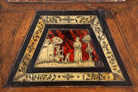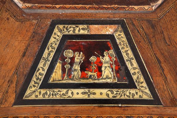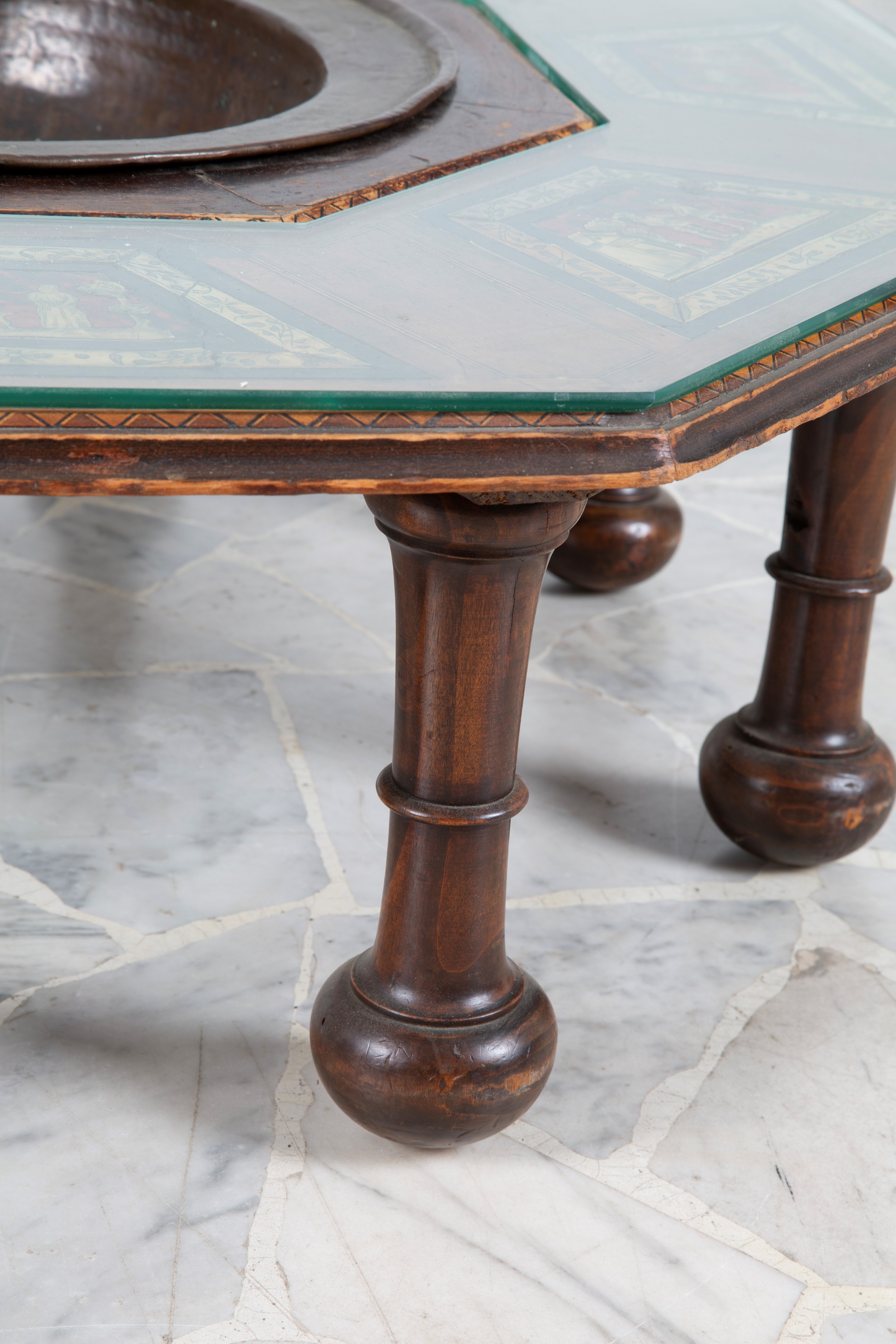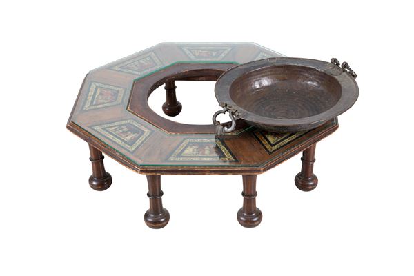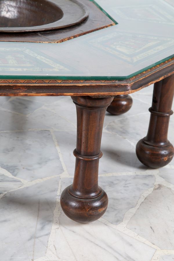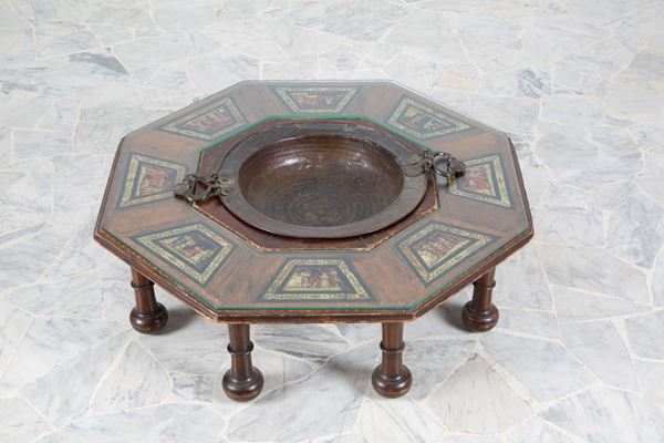 Antico braciere ottagonale in legno e rame intarsiato con scene di vita. Difetti e mancanze.