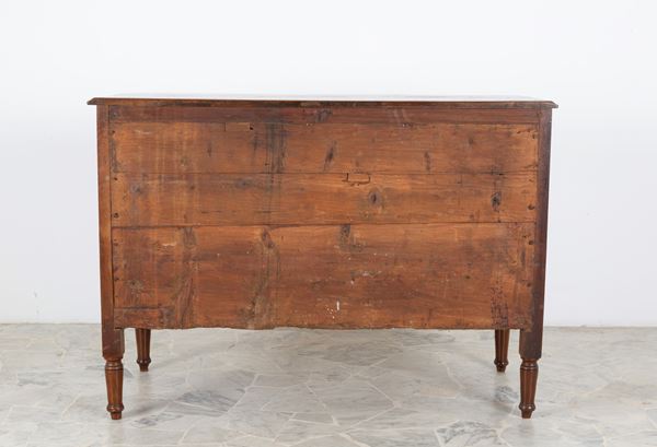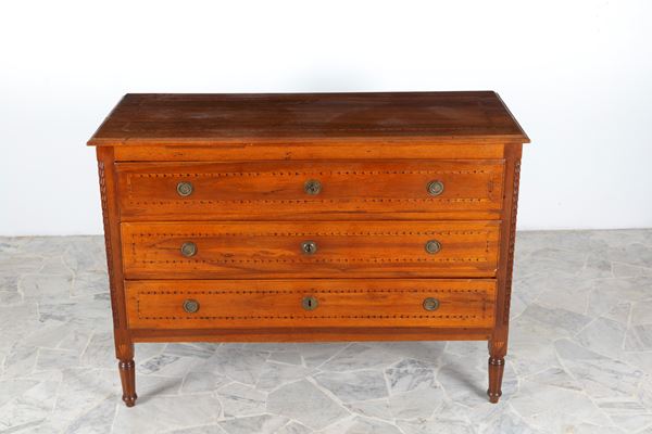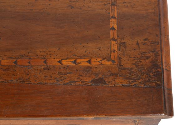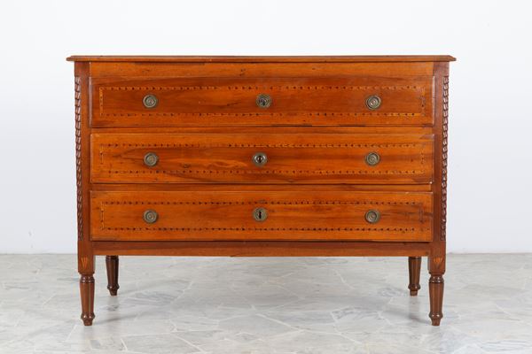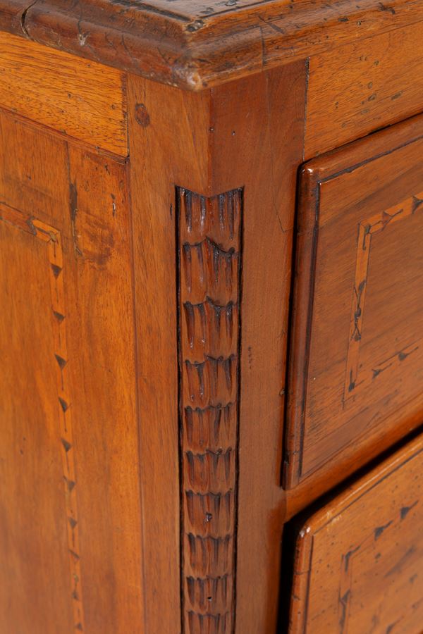 Cassettone in legno di noce filettato con intagli sugli angolari. Alto Veneto. Fine XVIII secolo. Lievi difetti e qualche restauro.