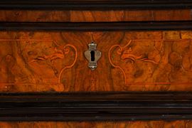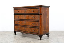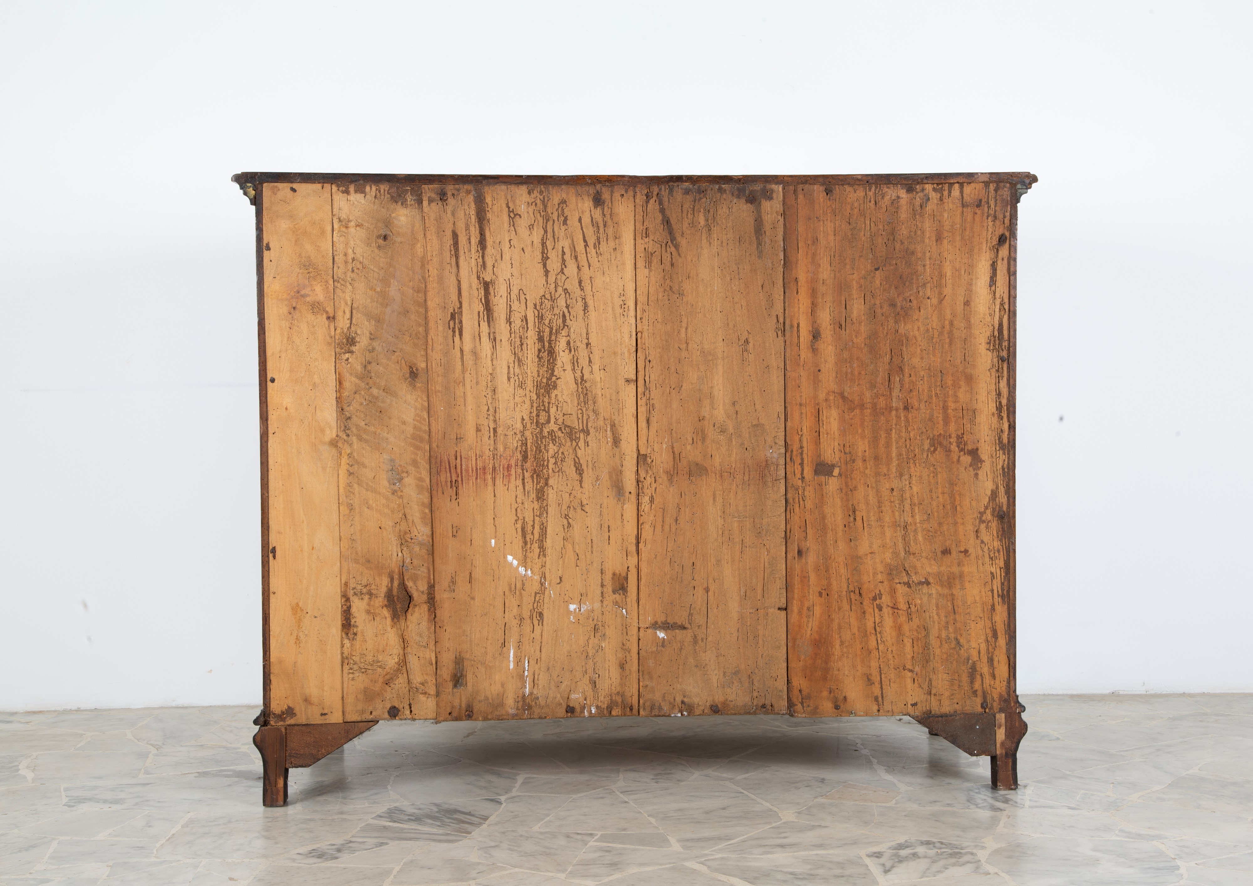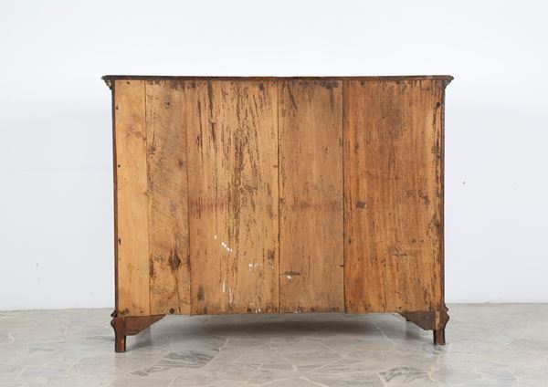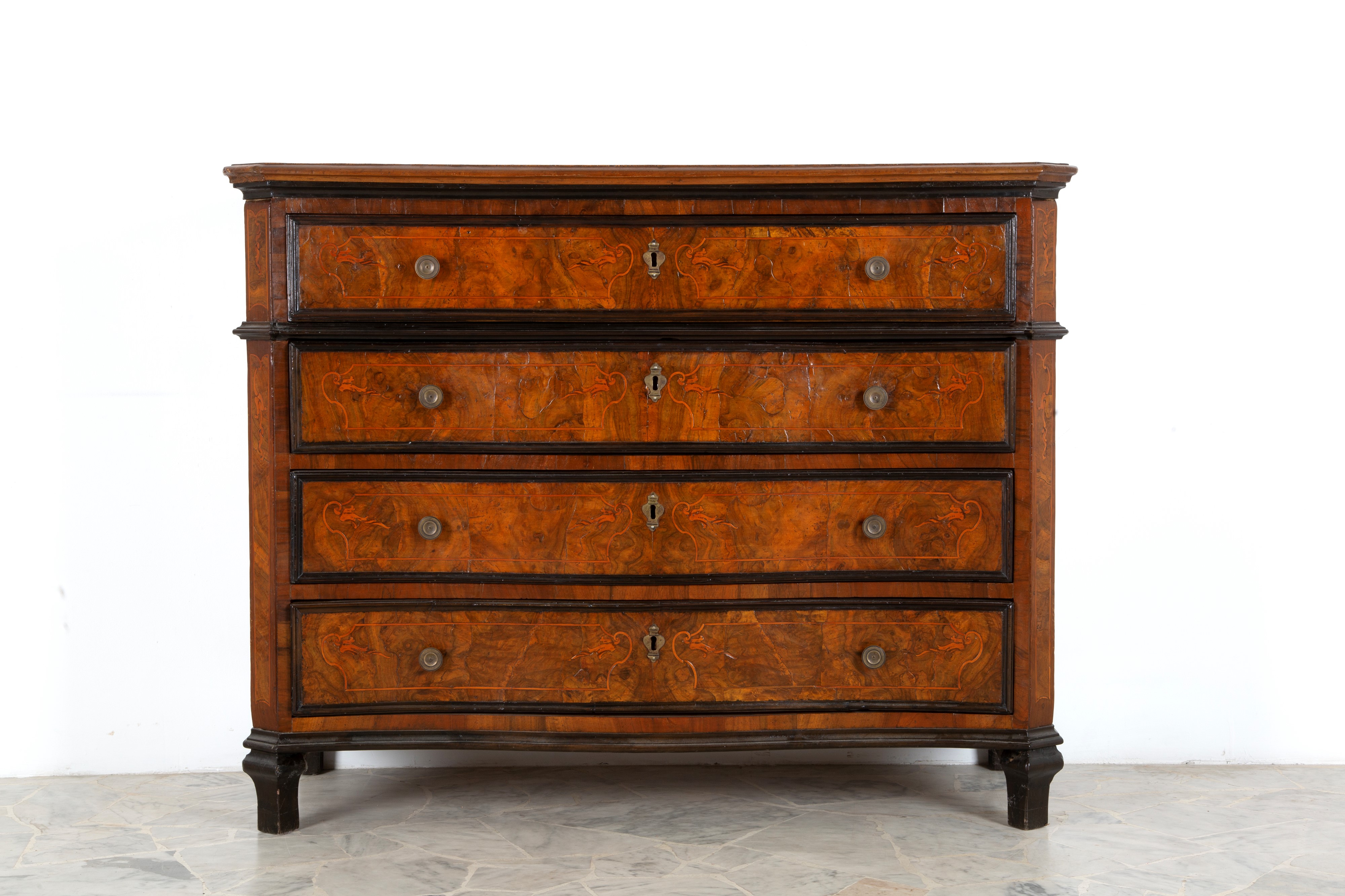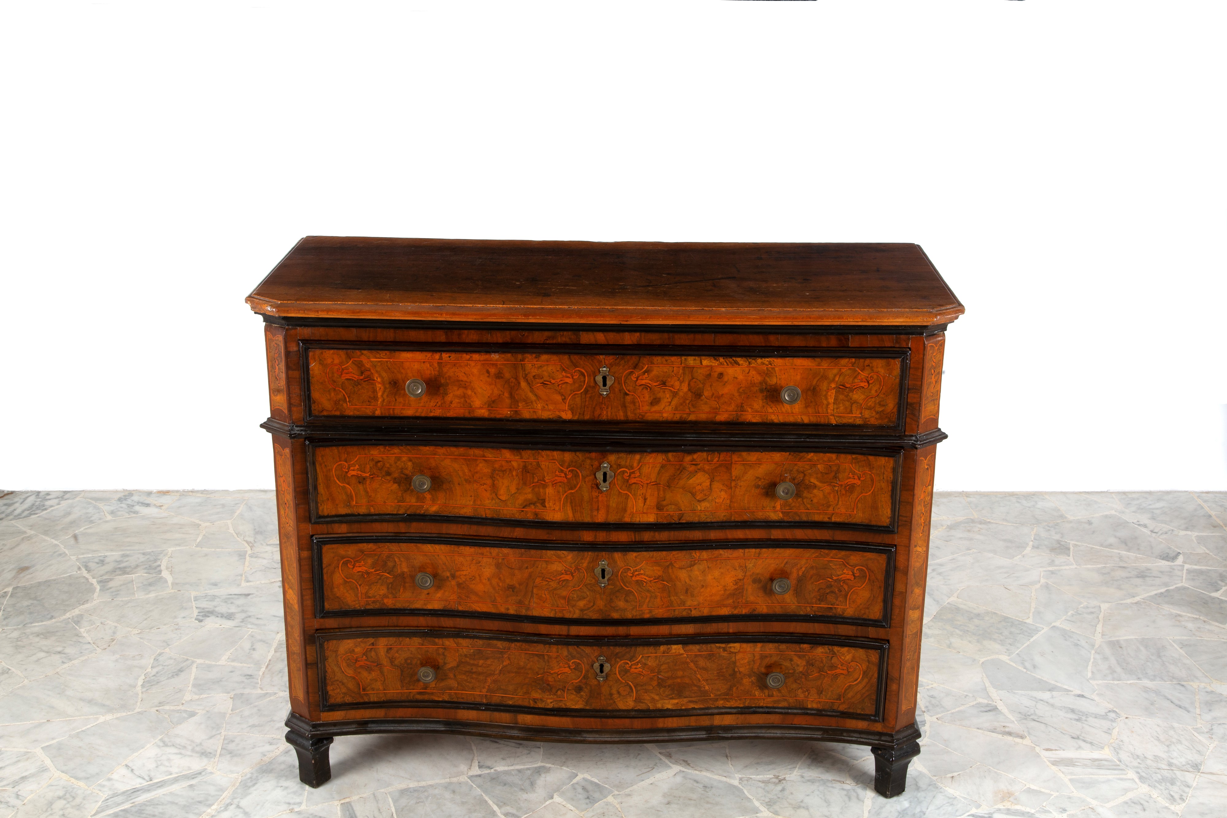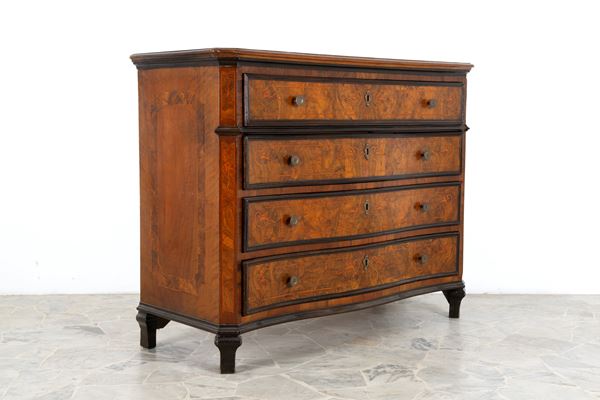 Cassettone mosso sul fronte lastronato in legno di noce con filetti ebanizzati e intarsi. Lombardia. XVII secolo. Lievi difetti.