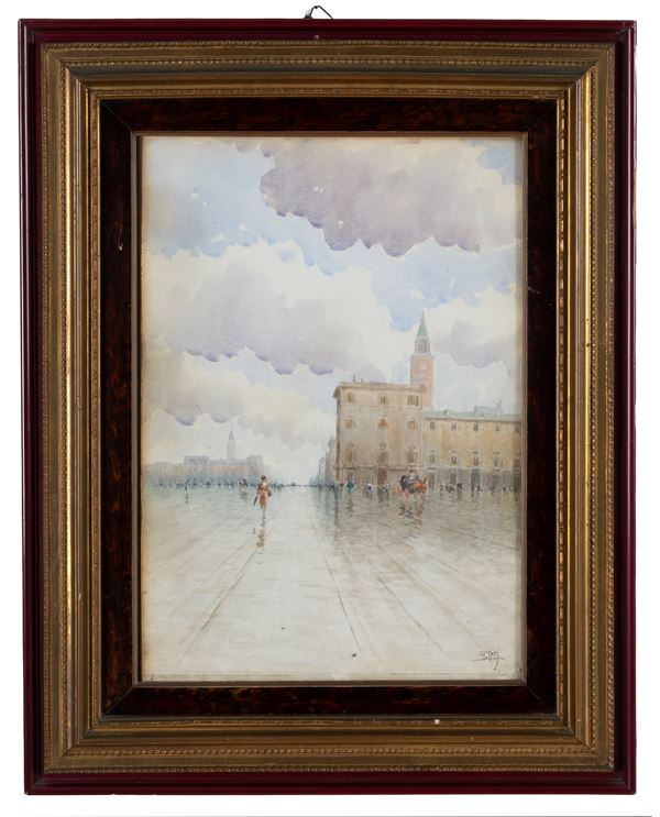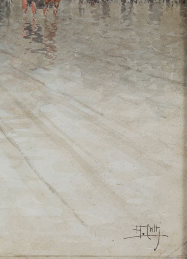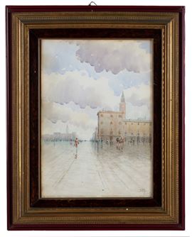 Acquarello su carta raffigurante "PIAZZA CON SCENA DI VITA CITTADINA". Firmato in basso a destra. In cornice.