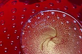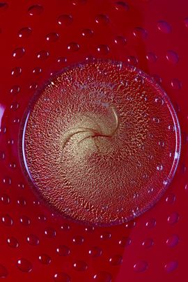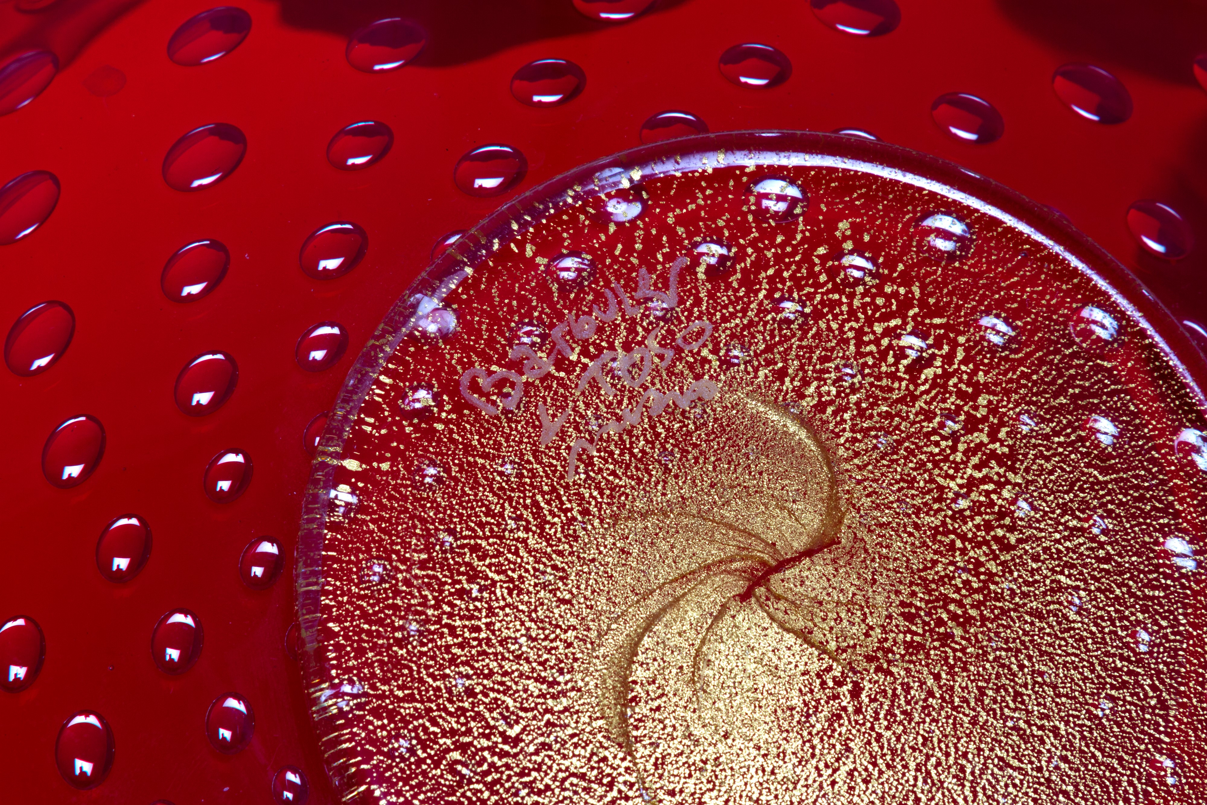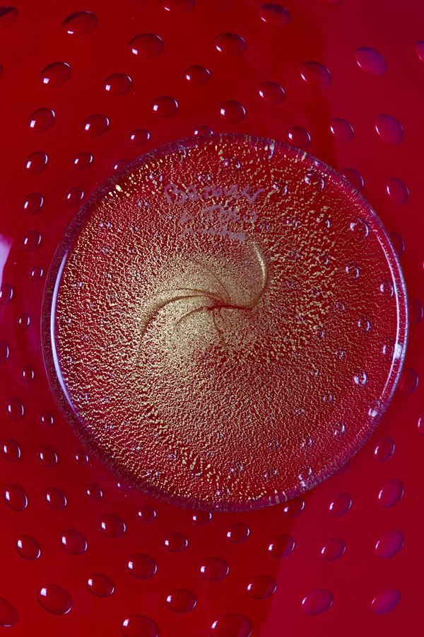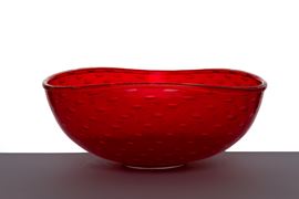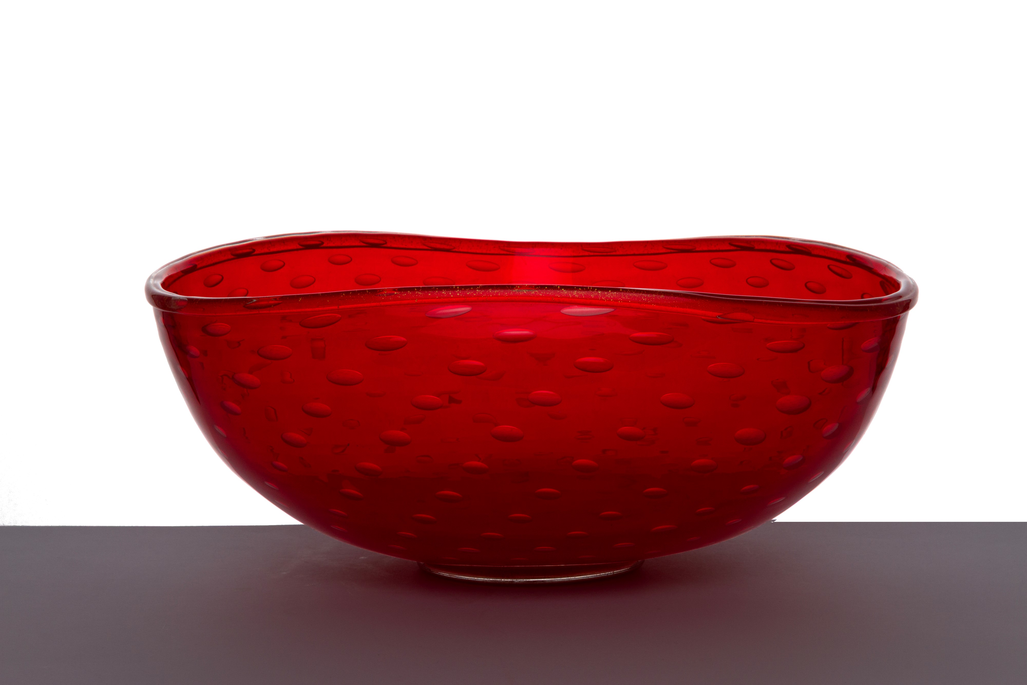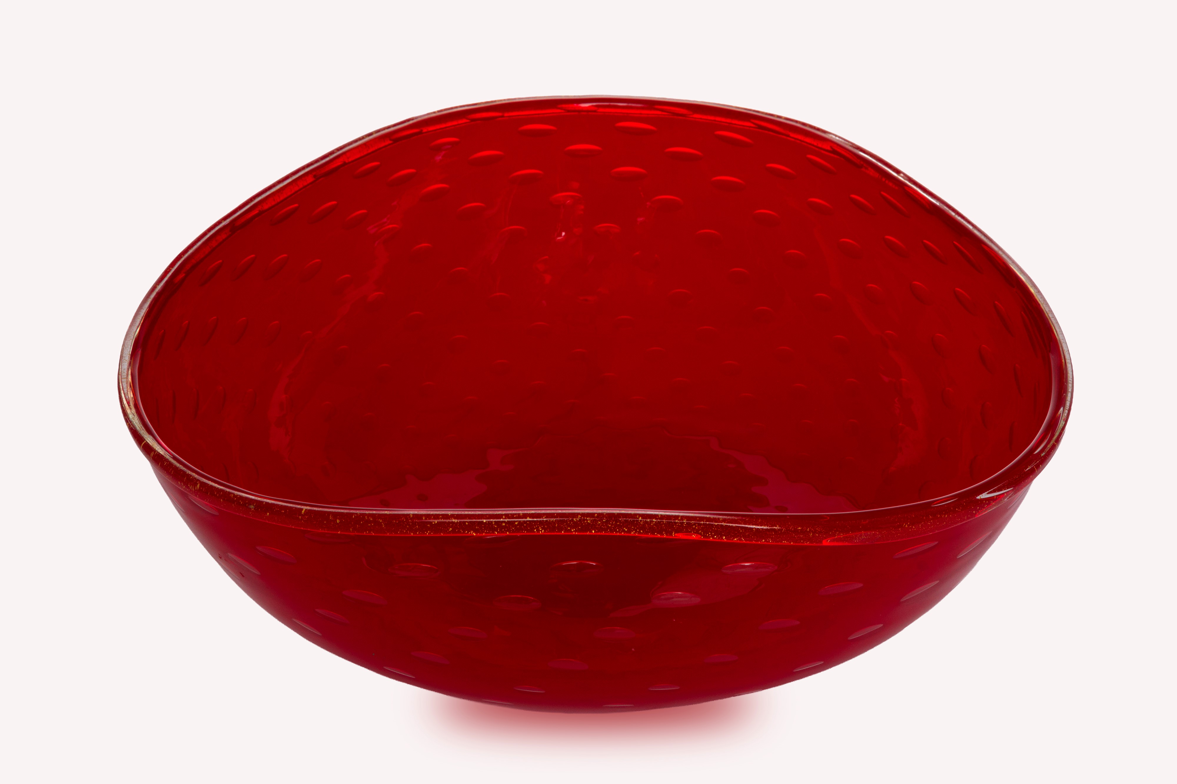 Ciotola in vetro soffiato rosso a bolle e lumeggiato in oro. BAROVIER & TOSO, Murano. Marcato sul fondo.