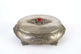 Cofanetto ovale in argento 800 finemente cesellato con cabochon in corniola sul coperchio, gr. 700 ca. Con punzoni sul fondo. XIX secolo.