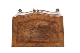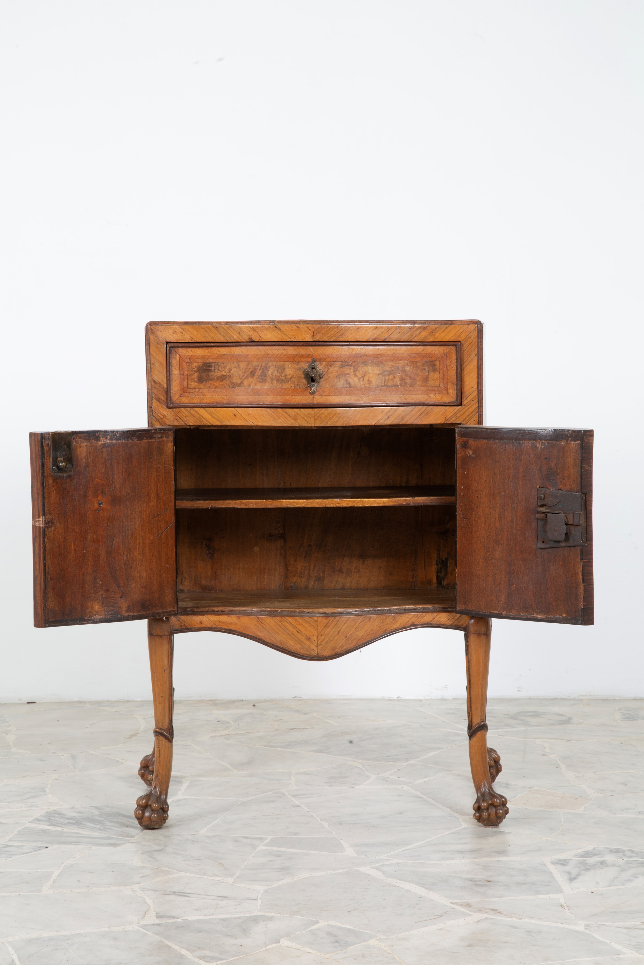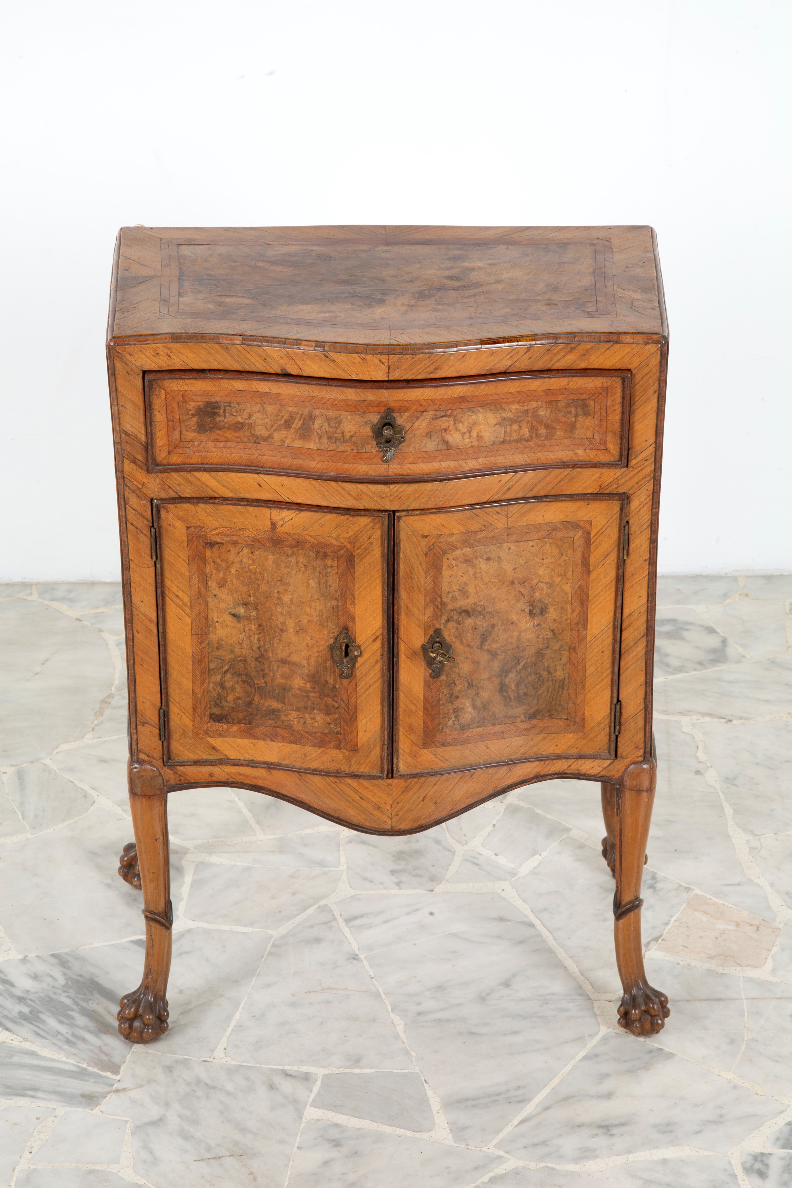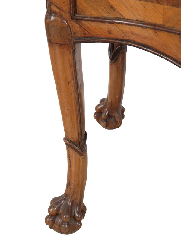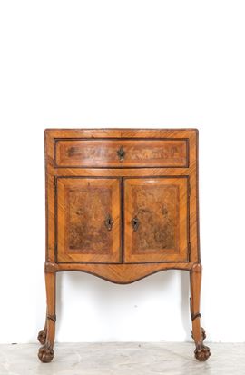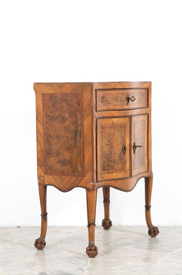 Comodino a due ante e un cassetto mosso sul fronte, lastronato in legno di noce e filetto in bois de rose con piedi ferini. Sicilia. XVIII secolo.