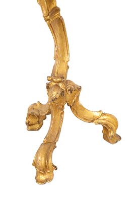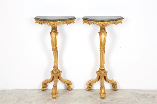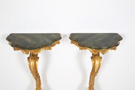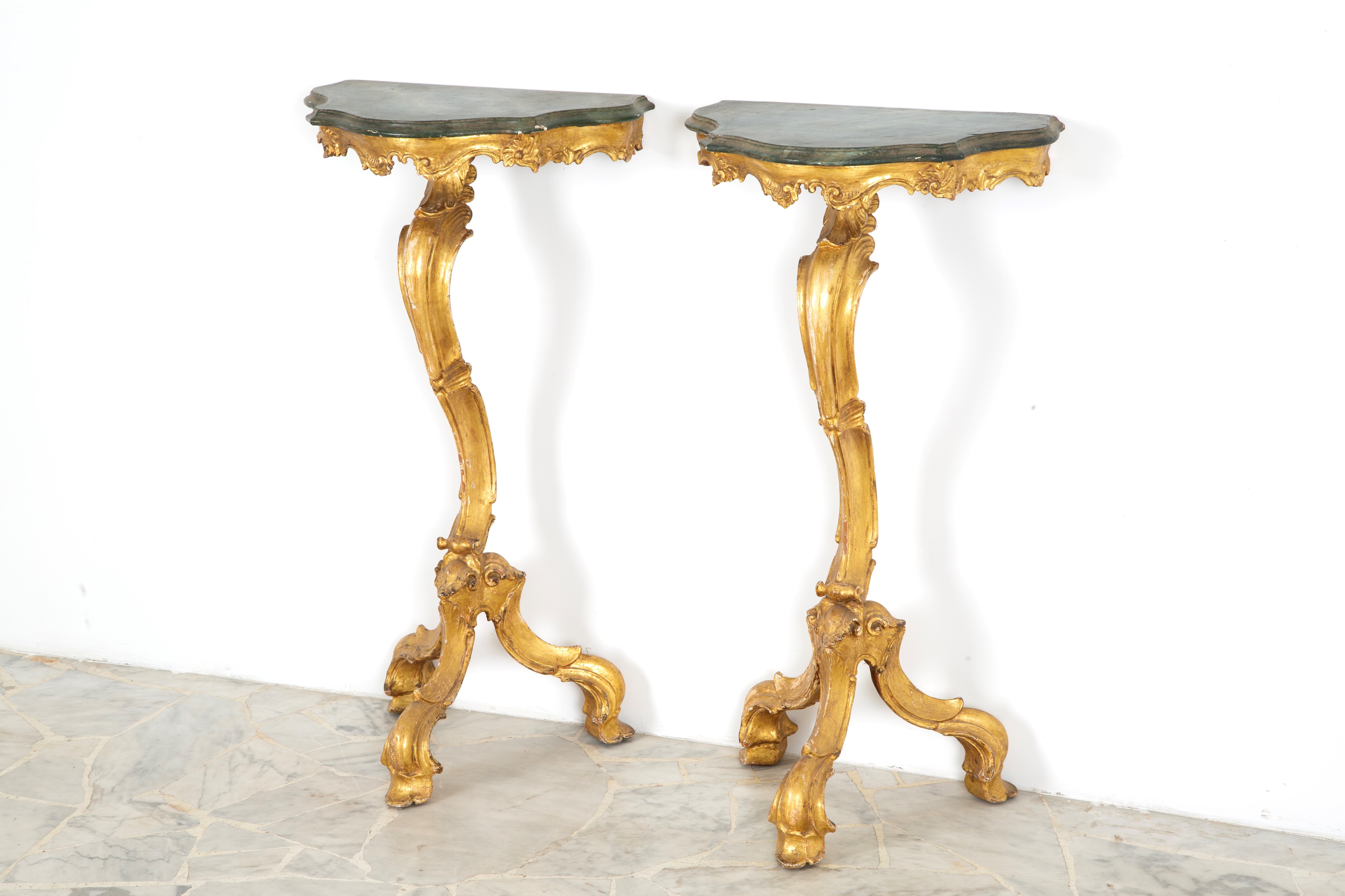 Coppia di gueridon in legno finemente intagliato e dorato con piano sagomato in finto marmo. Venezia. Fine XIX-inizi XX. Lievi difetti