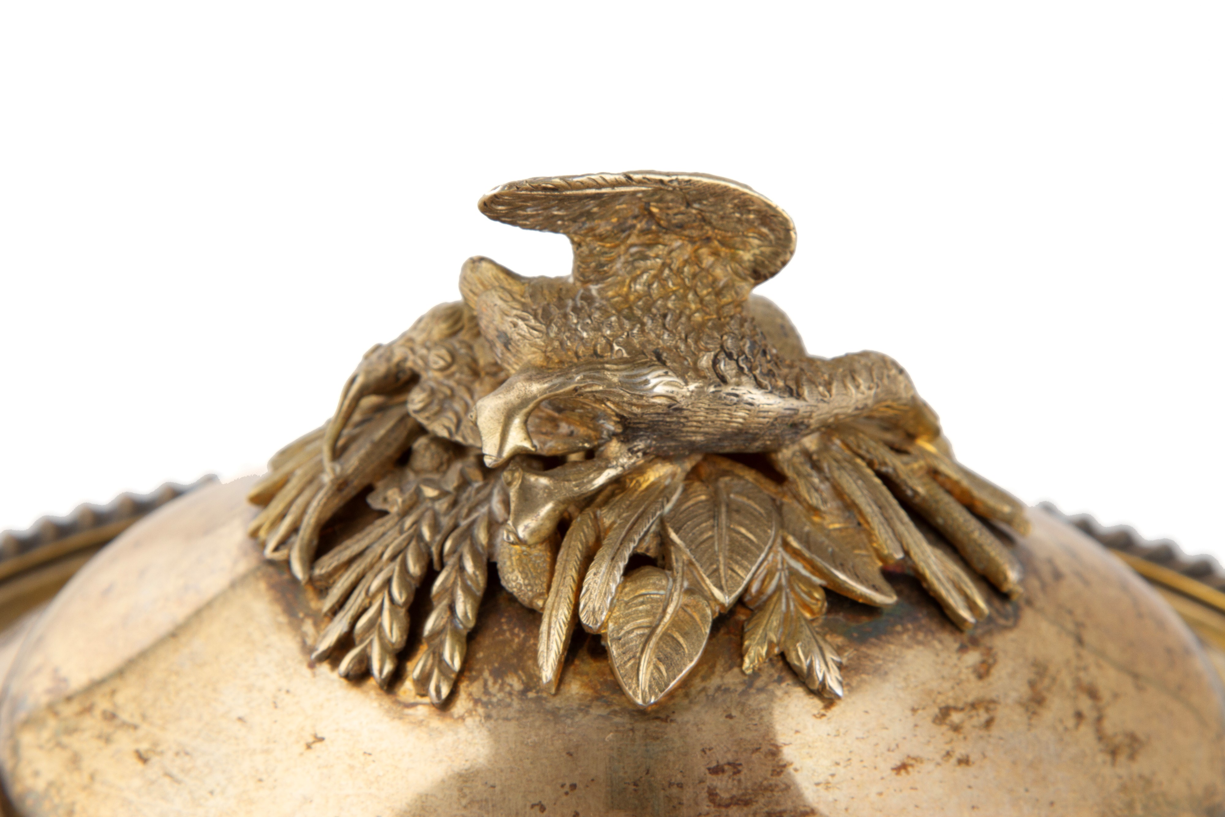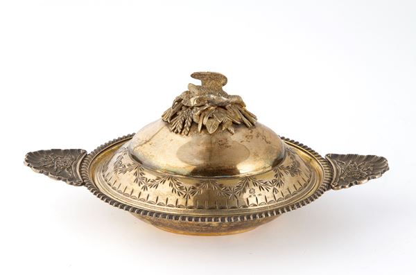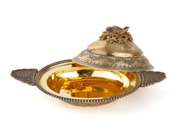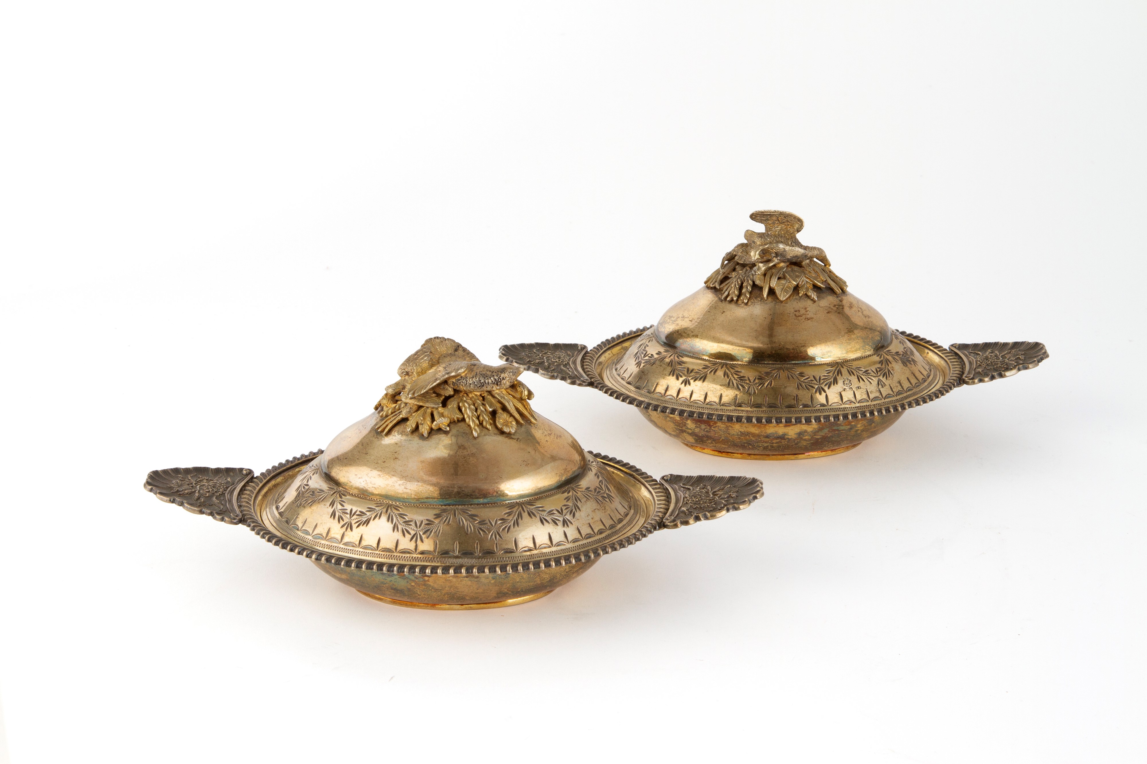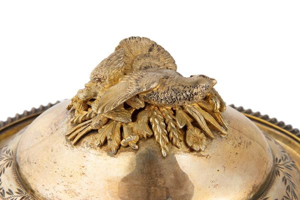 Coppia di legumiere in argento cesellato con selvaggina sui coperchi, gr. 1400 ca. complessivi. Russia. Punzoni sul fondo.