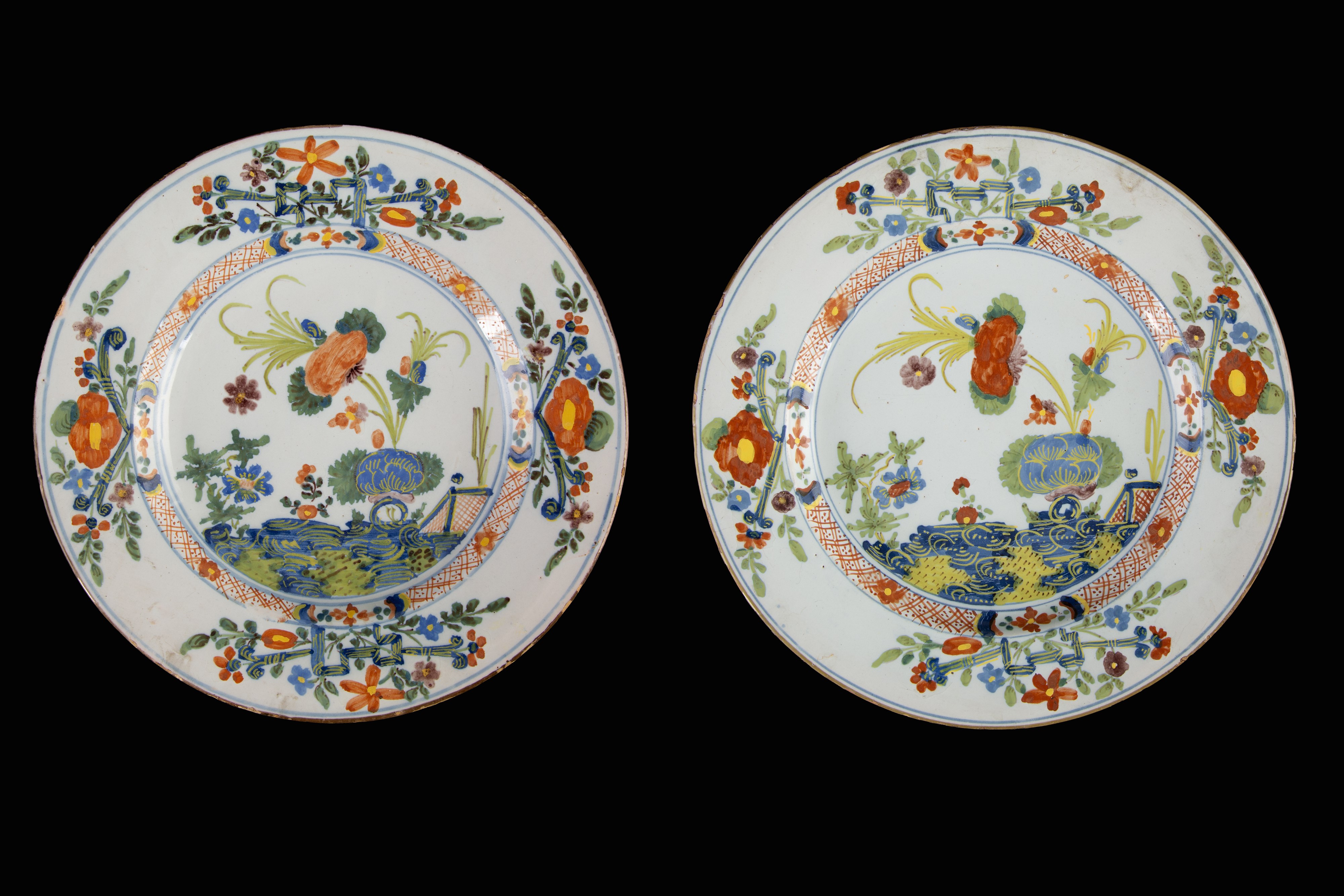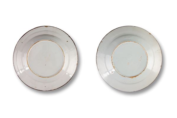 Coppia di piatti in ceramica dipinta con decoro al garofano. Manifattura FERNIANI, Faenza. XVIII secolo. Difetti.