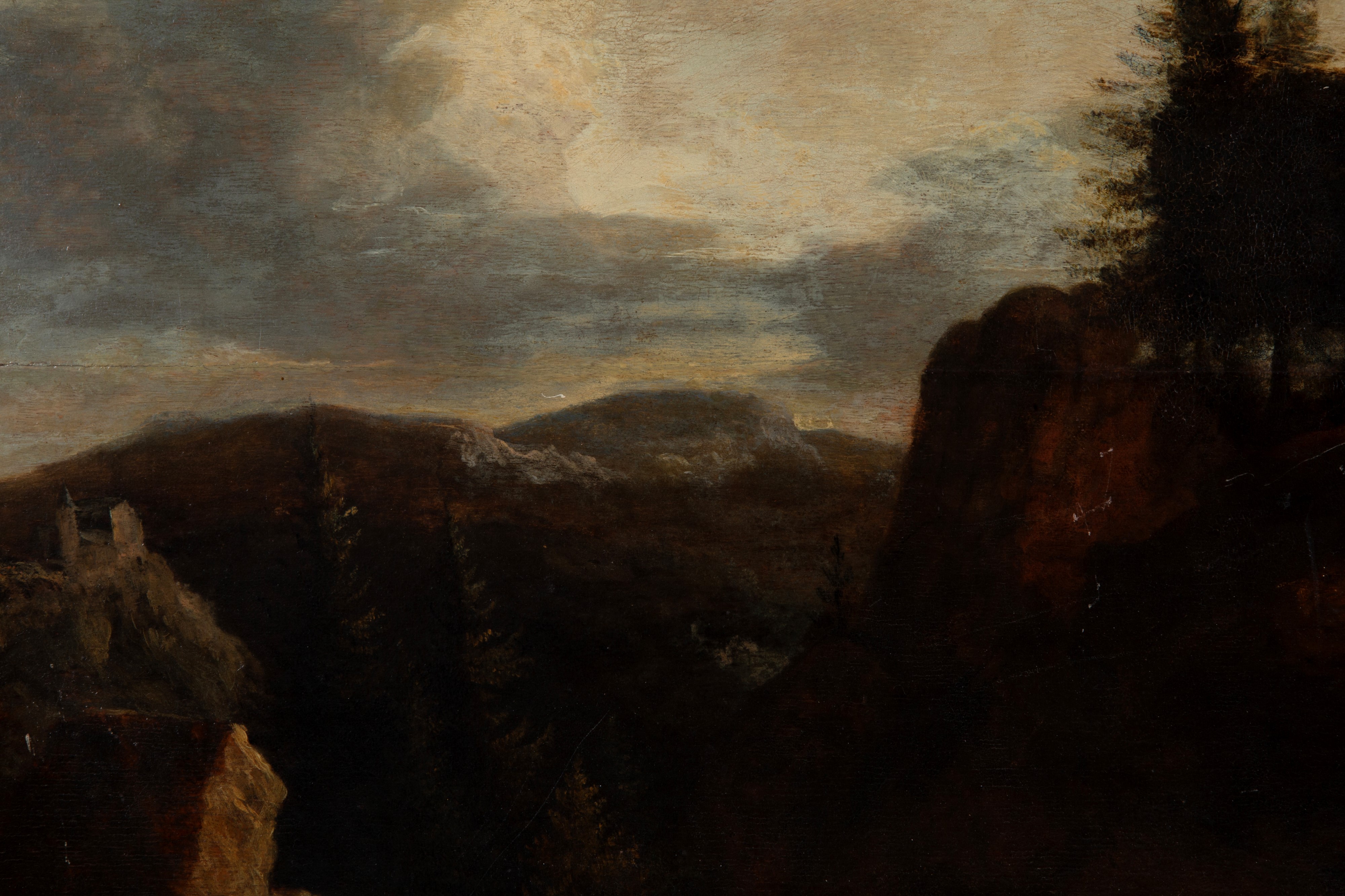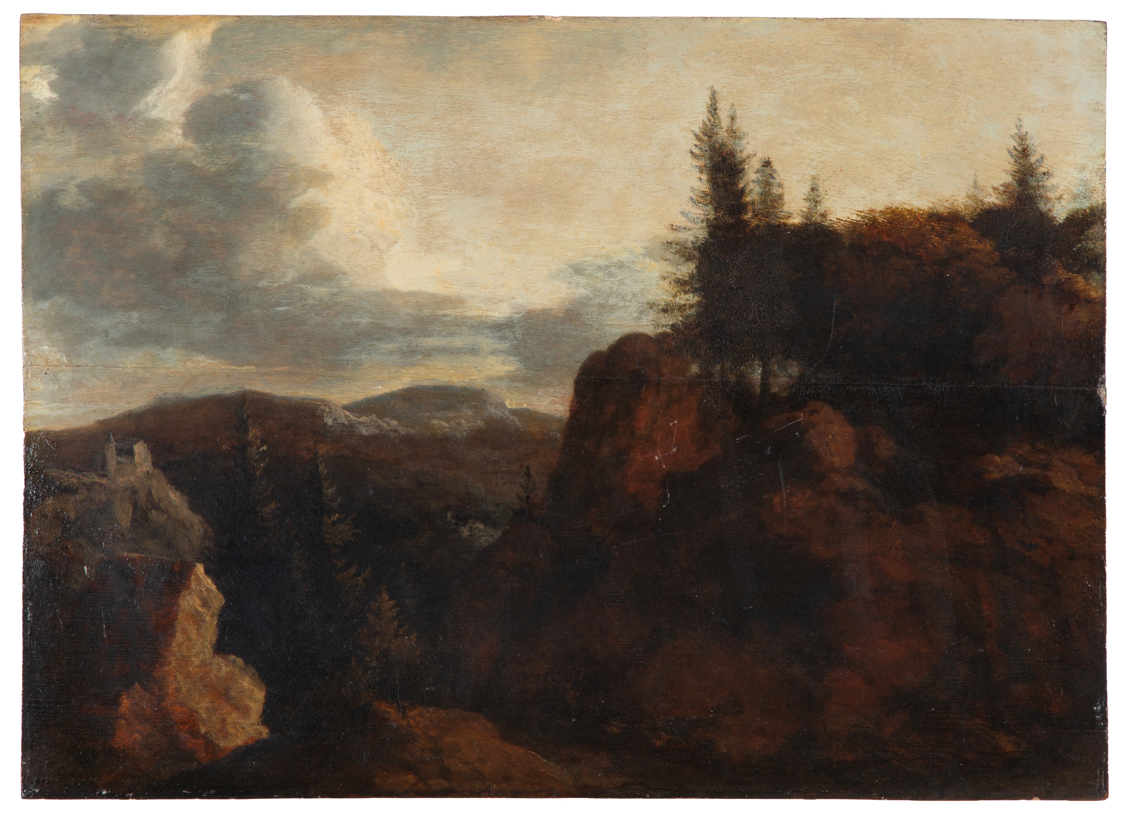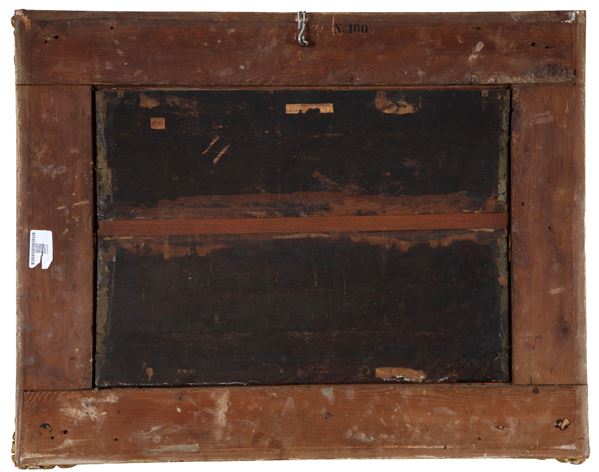 Dipinto olio su tavola raffigurante "PAESAGGIO MONTANO". XIX secolo. Lievi restauri.