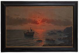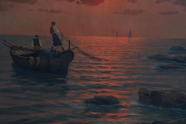 Dipinto olio su tela raffigurante "PESCATORI AL RIENTRO". Inizi XX secolo. In cornice guilloché.