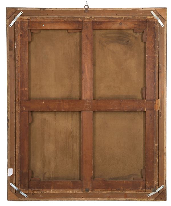 Dipinto olio su tela raffigurante "SCENA GALANTE". XIX secolo. In cornice. Restauri. Già rintelato.