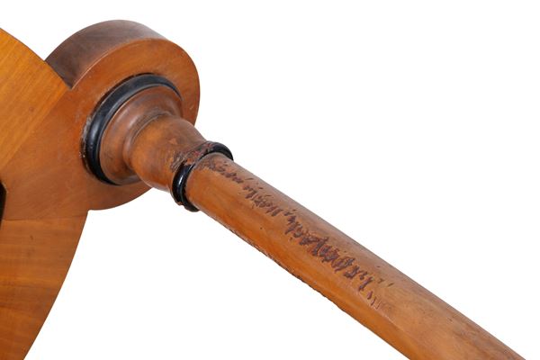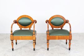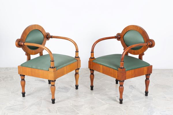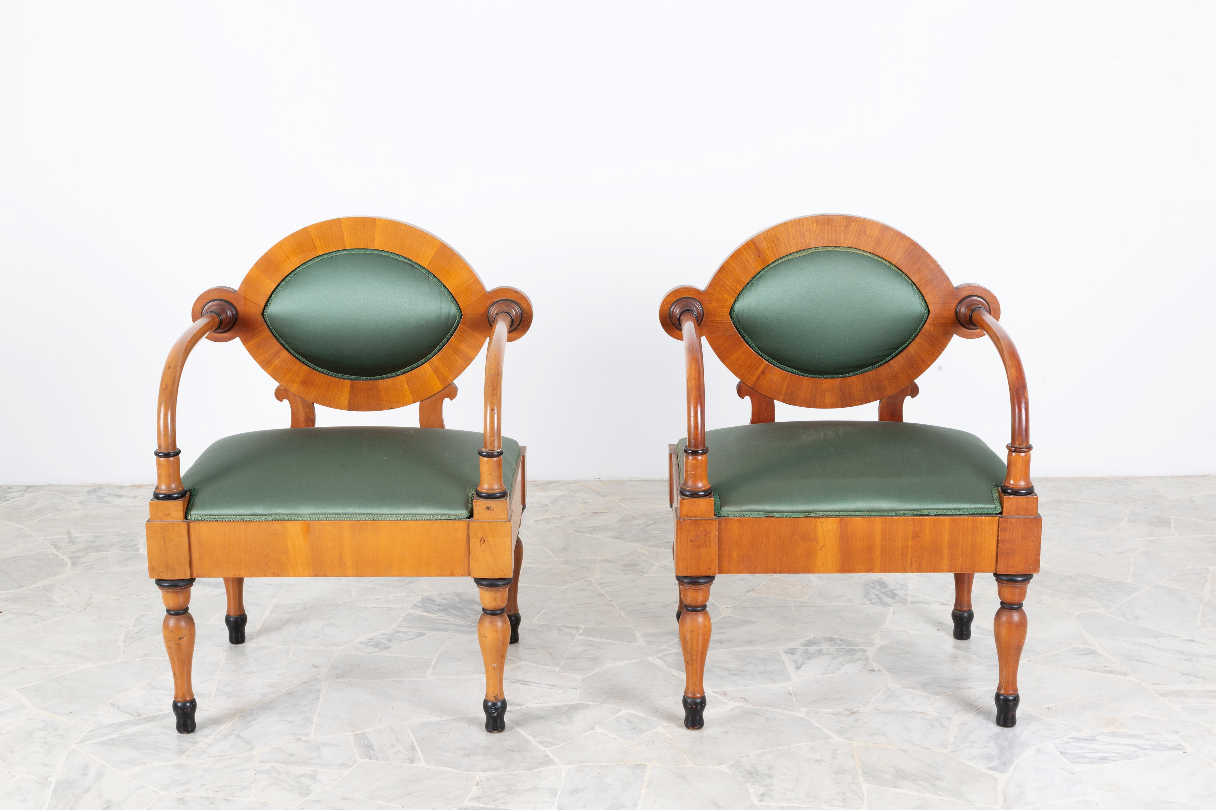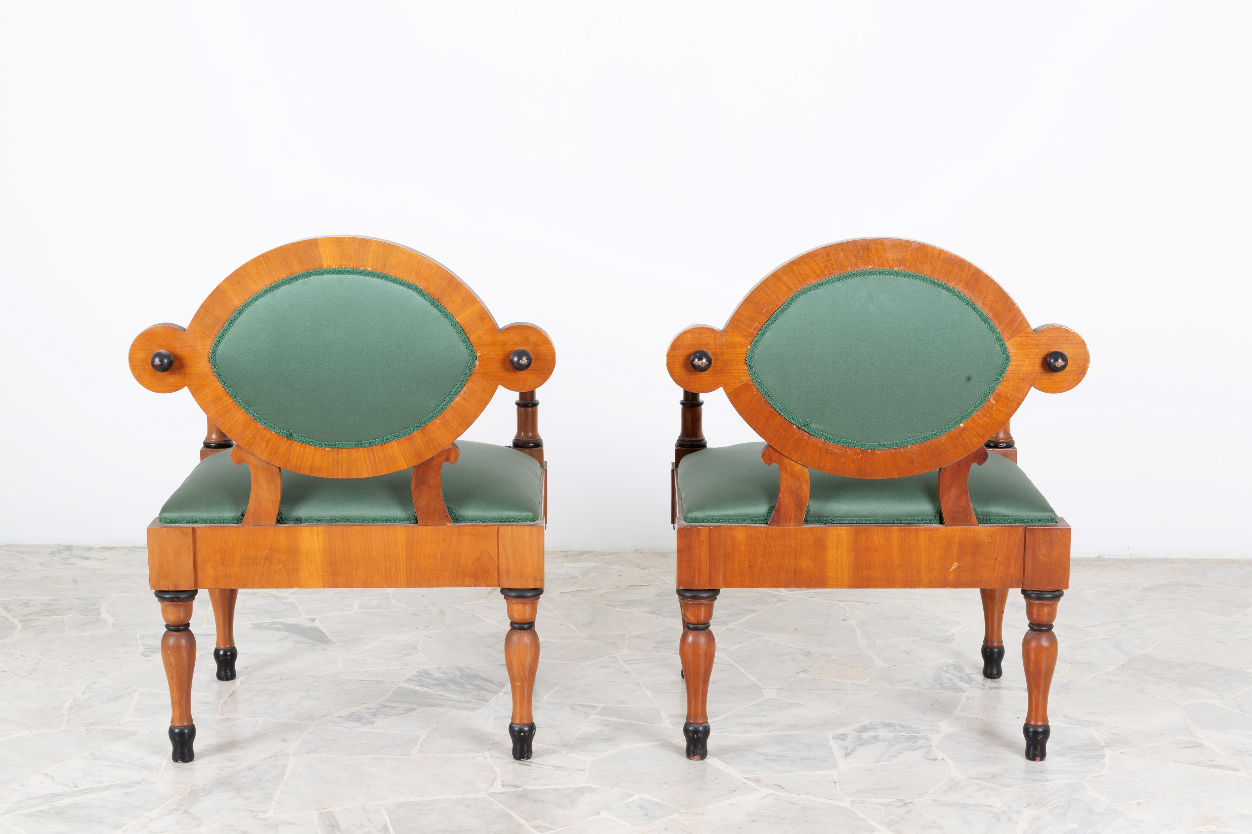 Due poltrone in legno di ciliegio con seduta e schienale in tessuto verde. XIX secolo. Difetti.