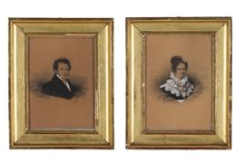 Due tecniche miste su carta raffiguranti "RITRATTI". Firma non identificata e datati 1823 in basso a destra. In cornice.