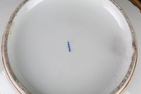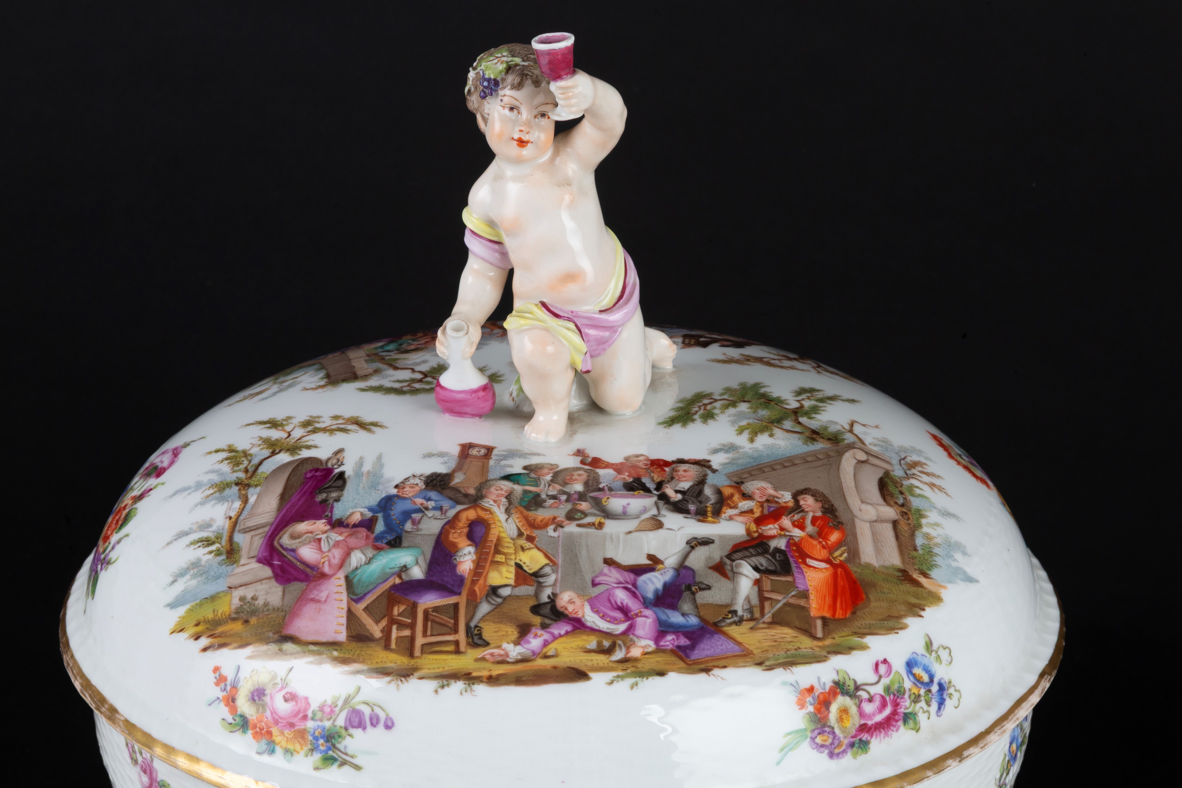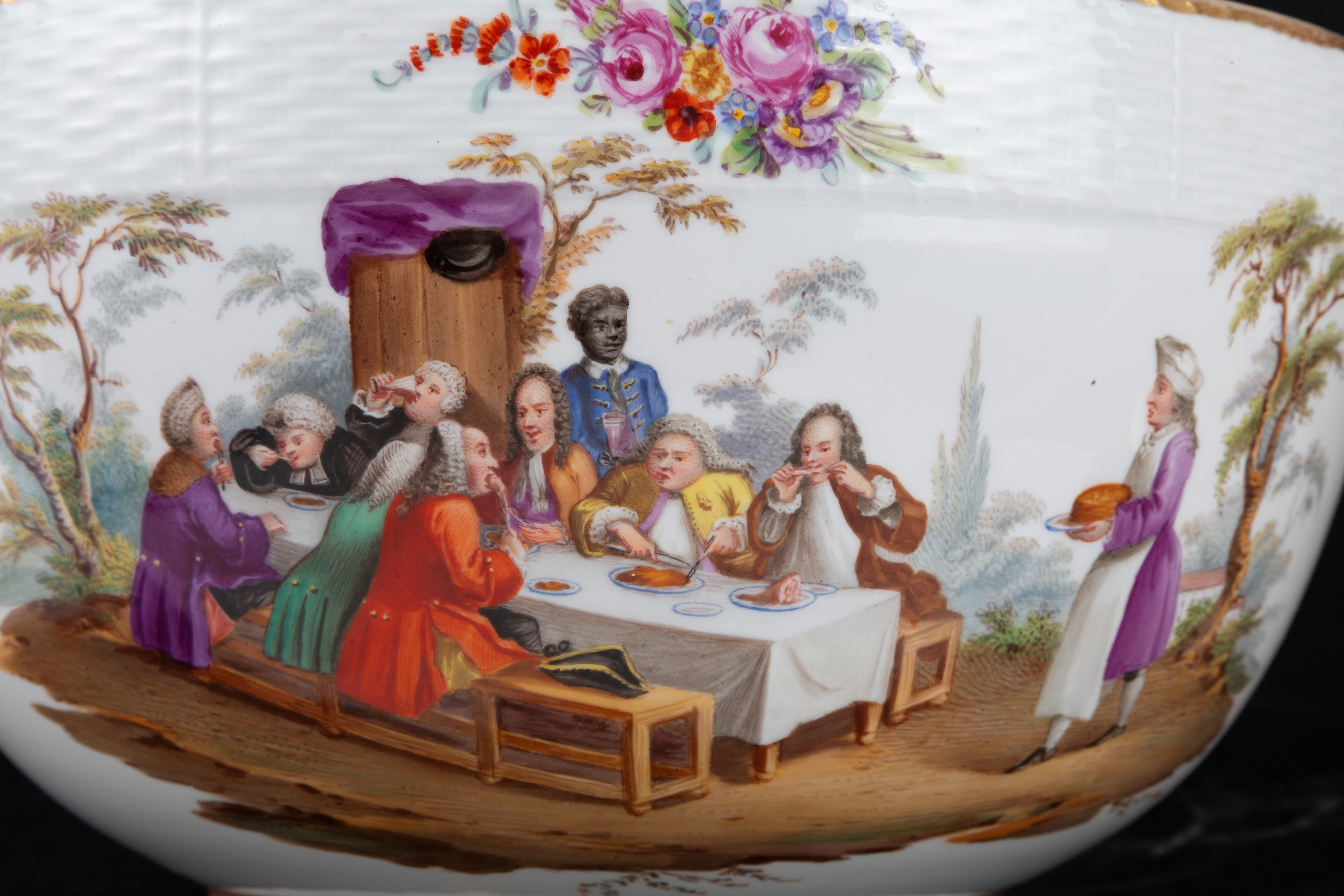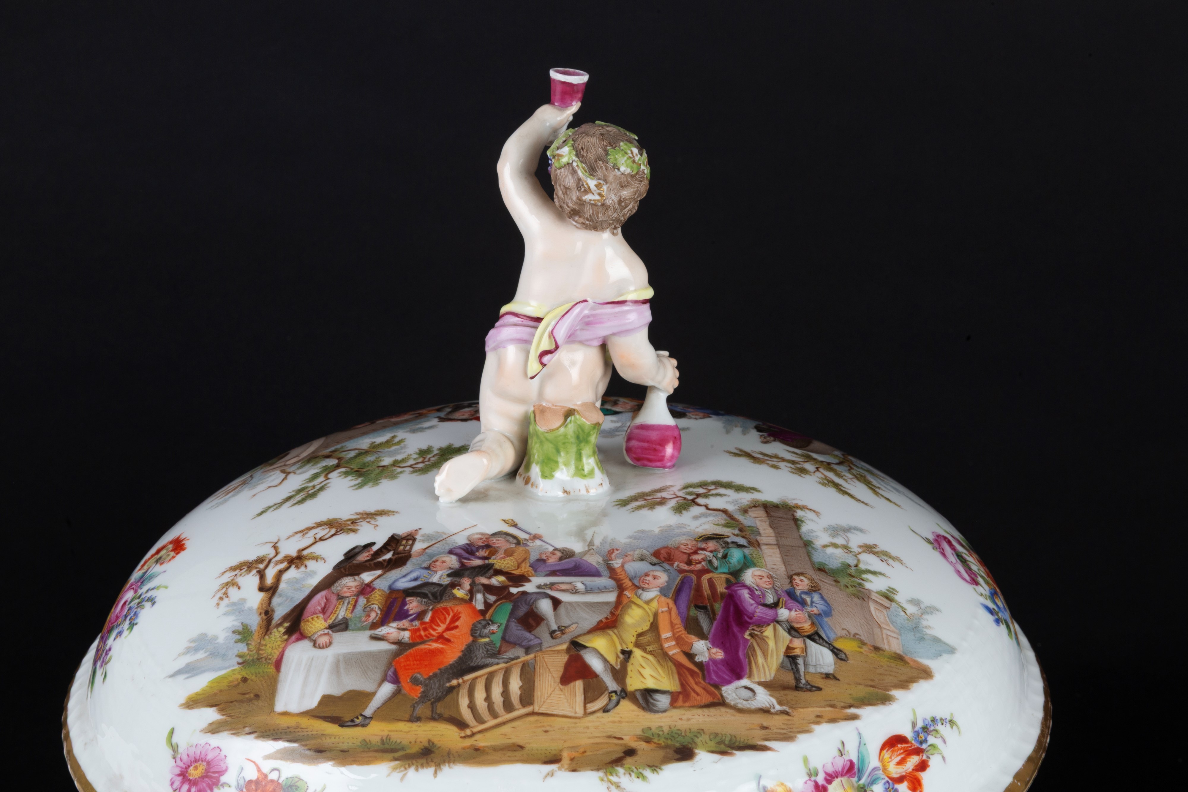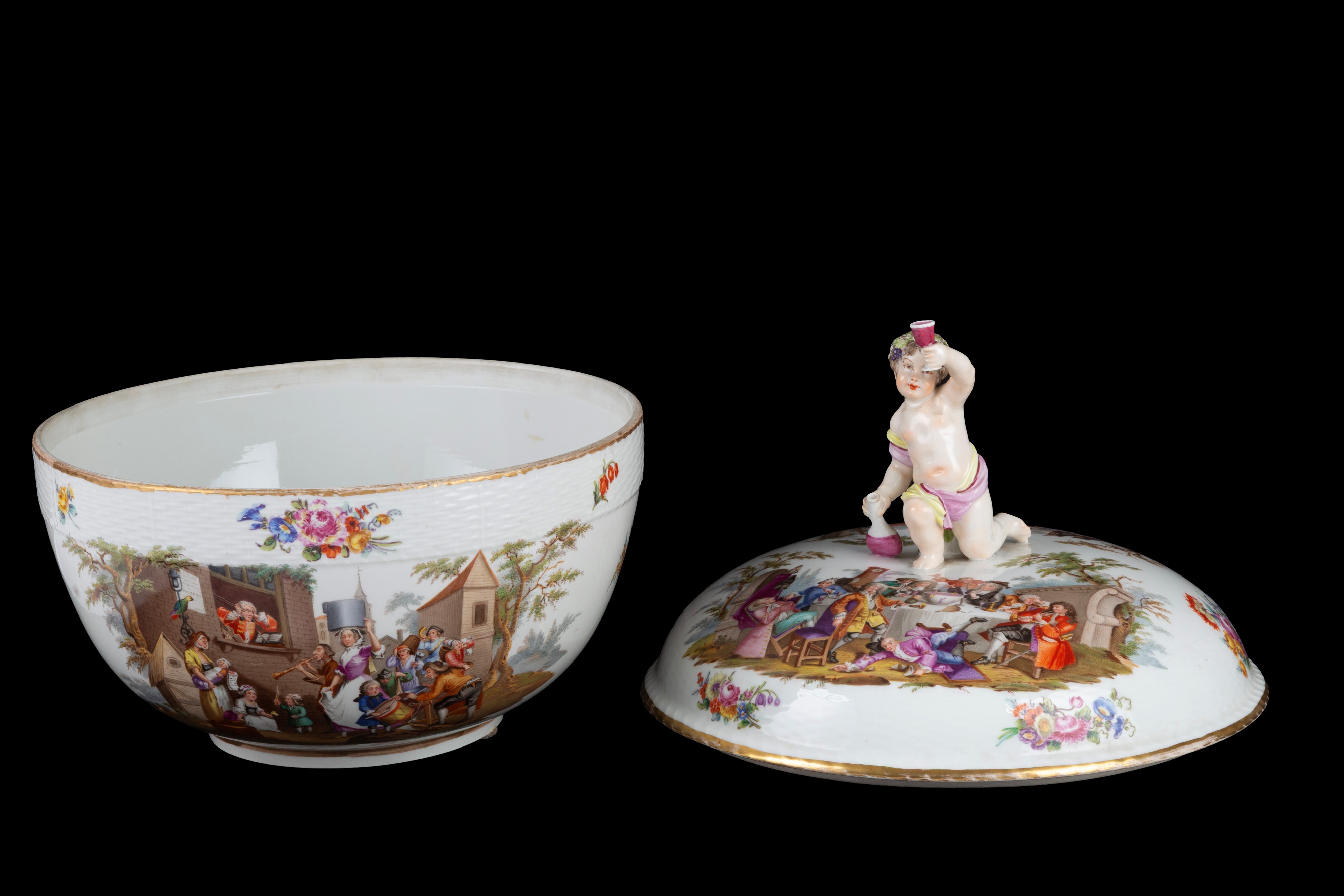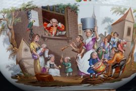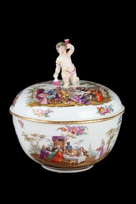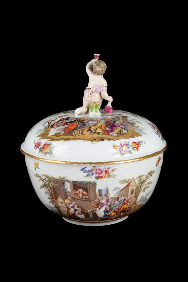 Grande zuppiera in porcellana decorata con feste di paese e decori floreali. Marcata sul fondo. Berlino. XIX secolo.