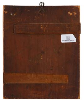 Icona in legno quadripartita raffigurante al centro la crocefissione, Madre di Dio di Kazan, San Nicola, San Michele Arcangelo e San Giorgio. Russia. XIX secolo. Difetti.