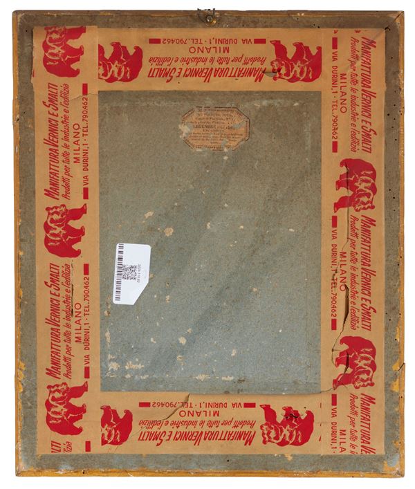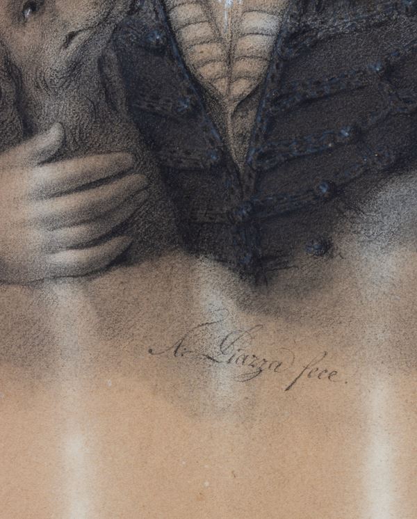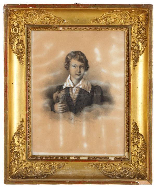 Incisione acquarellata su carta raffigurante "RITRATTO DI GIOVANE CON CANE". Firmato A. PIAZZA in basso. XIX secolo. In cornice in legno dorato.