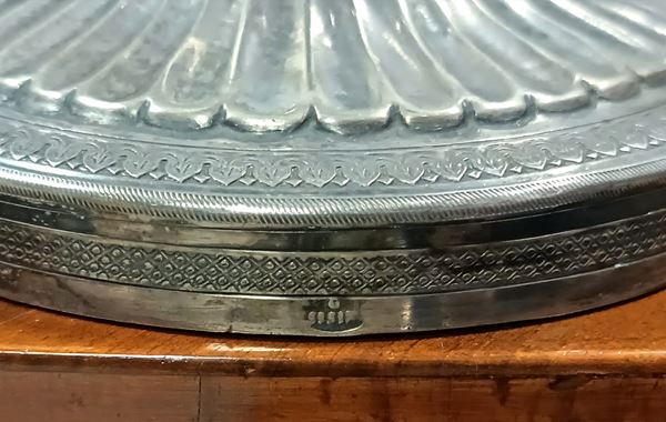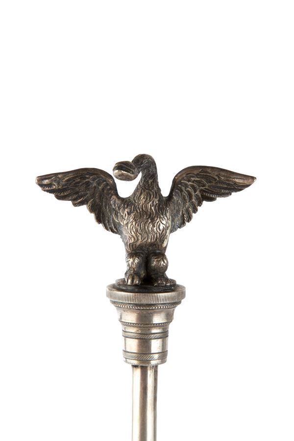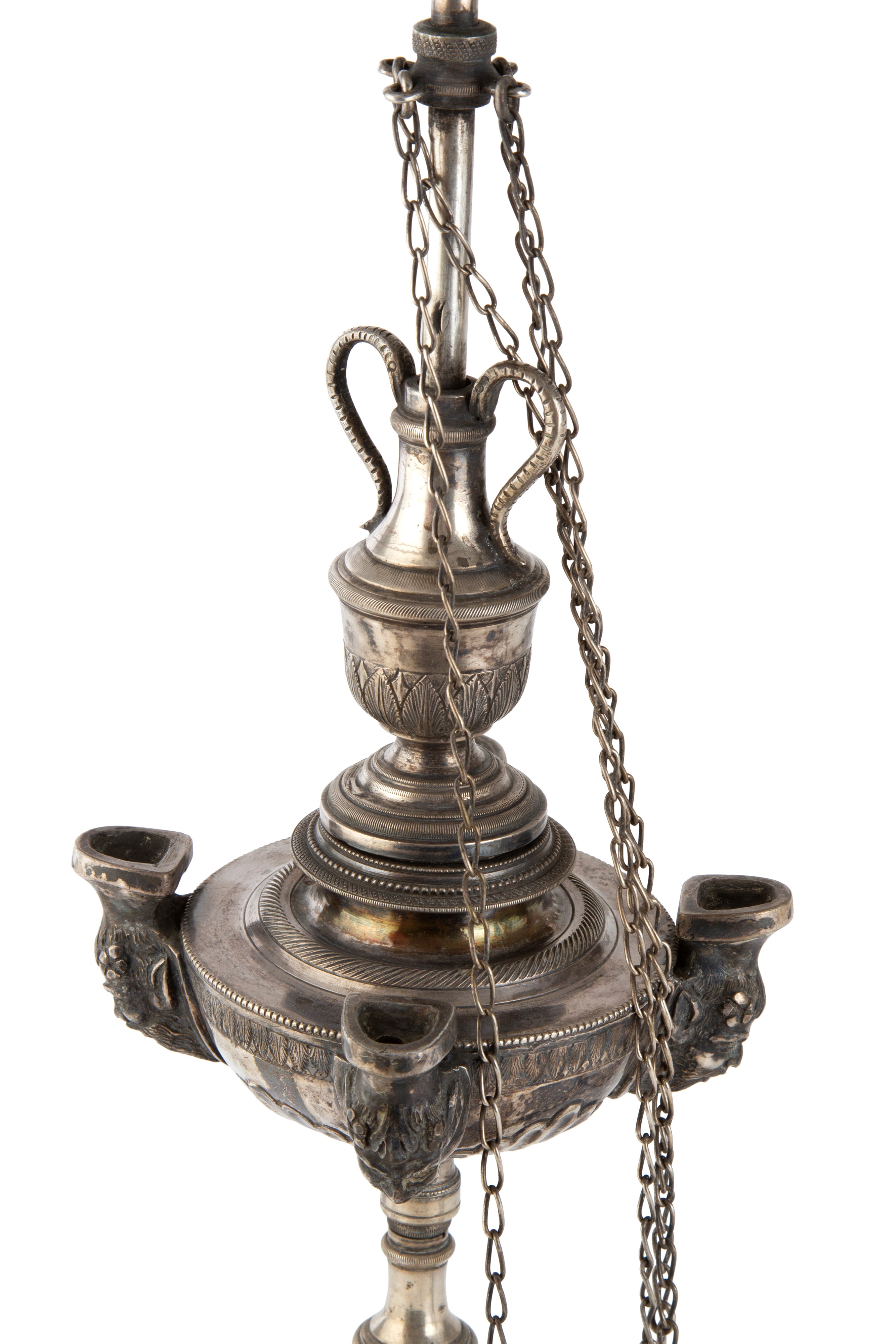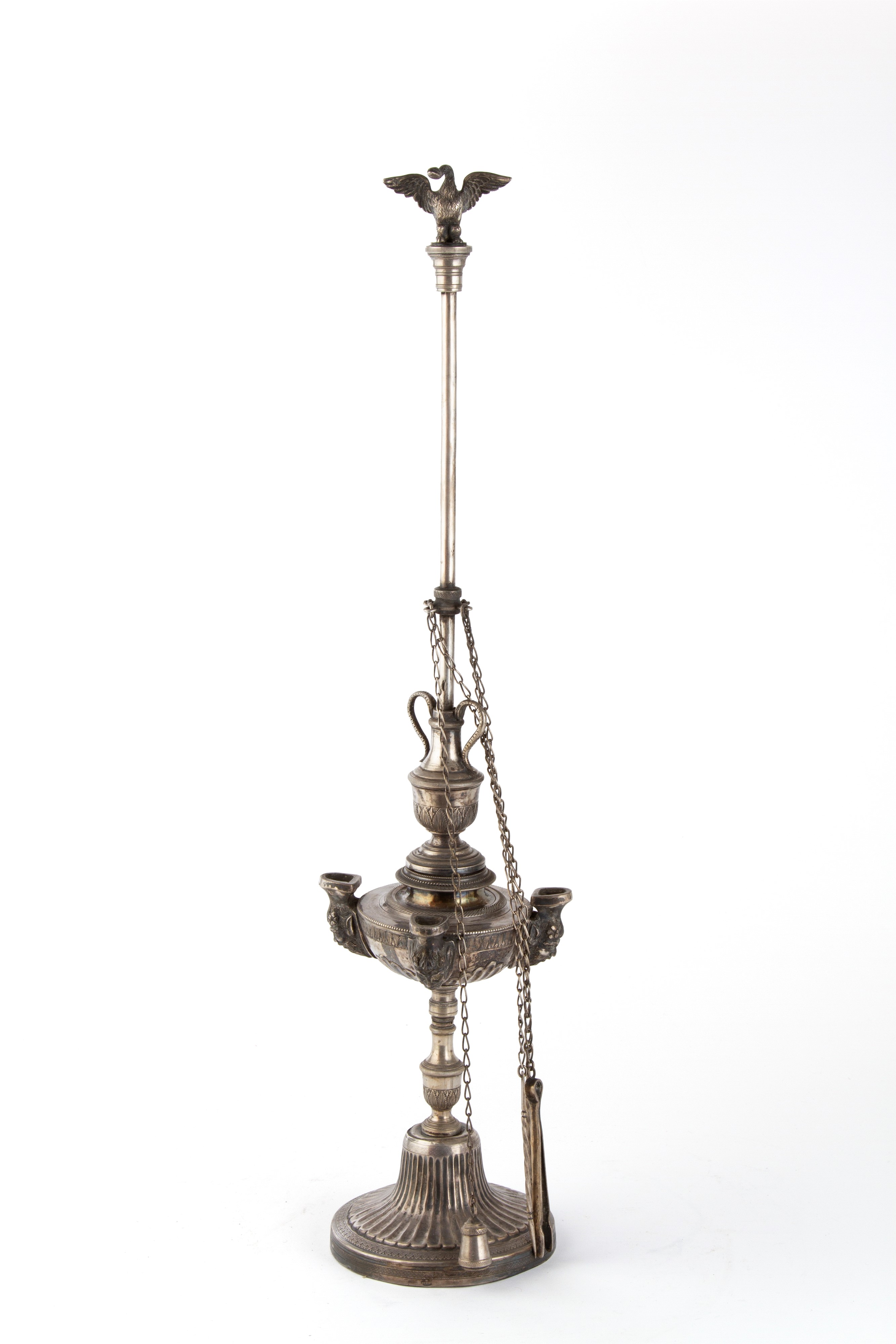 Lampada fiorentina in argento sbalzato e cesellato con cigno alla sommità. Argentiere GABRIELE SISINO, Napoli. Punzoni alla base. Prima metà del XIX secolo.