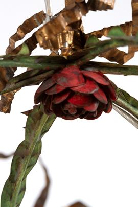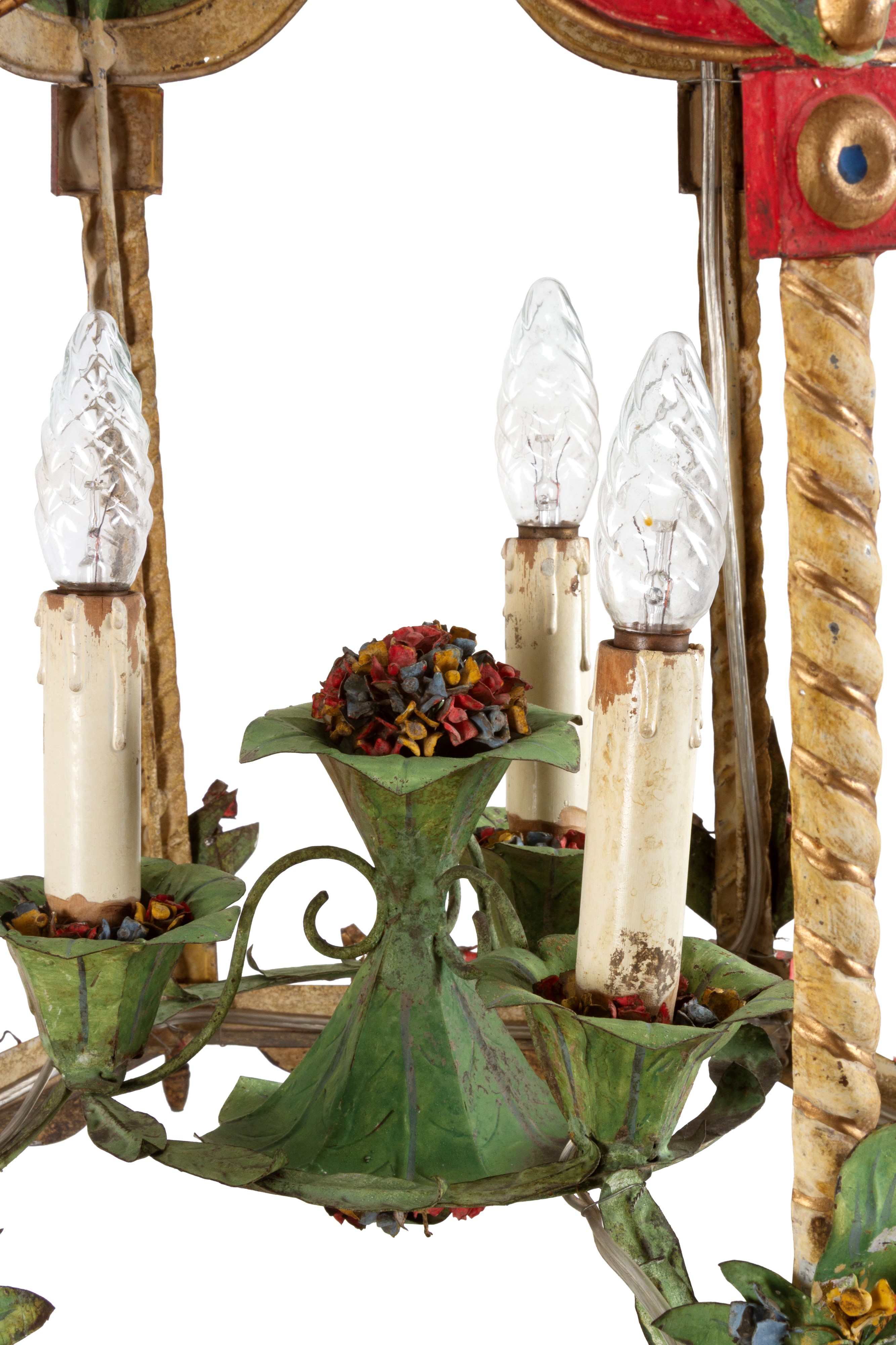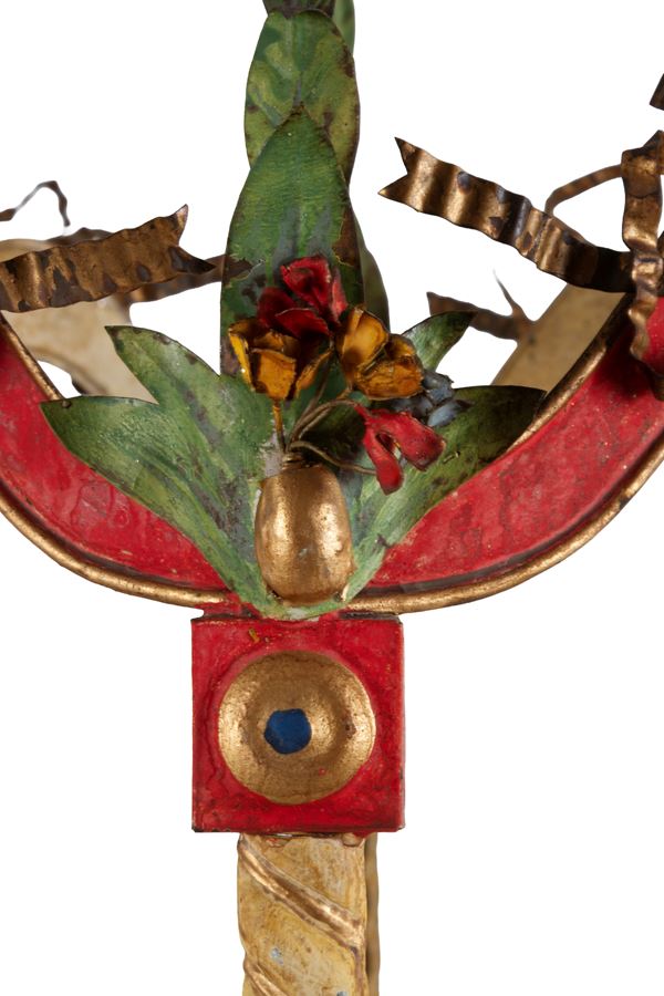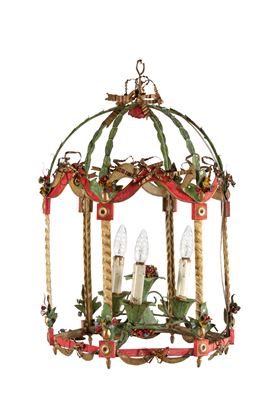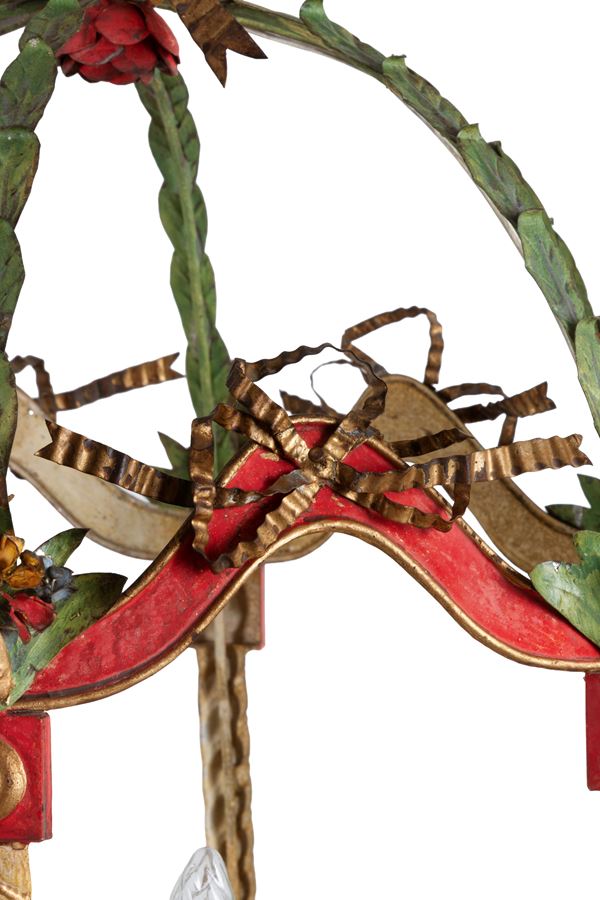 Lampadario tre luci a forma di gazebo in lamierino laccato. XIX secolo. Lievi difetti.