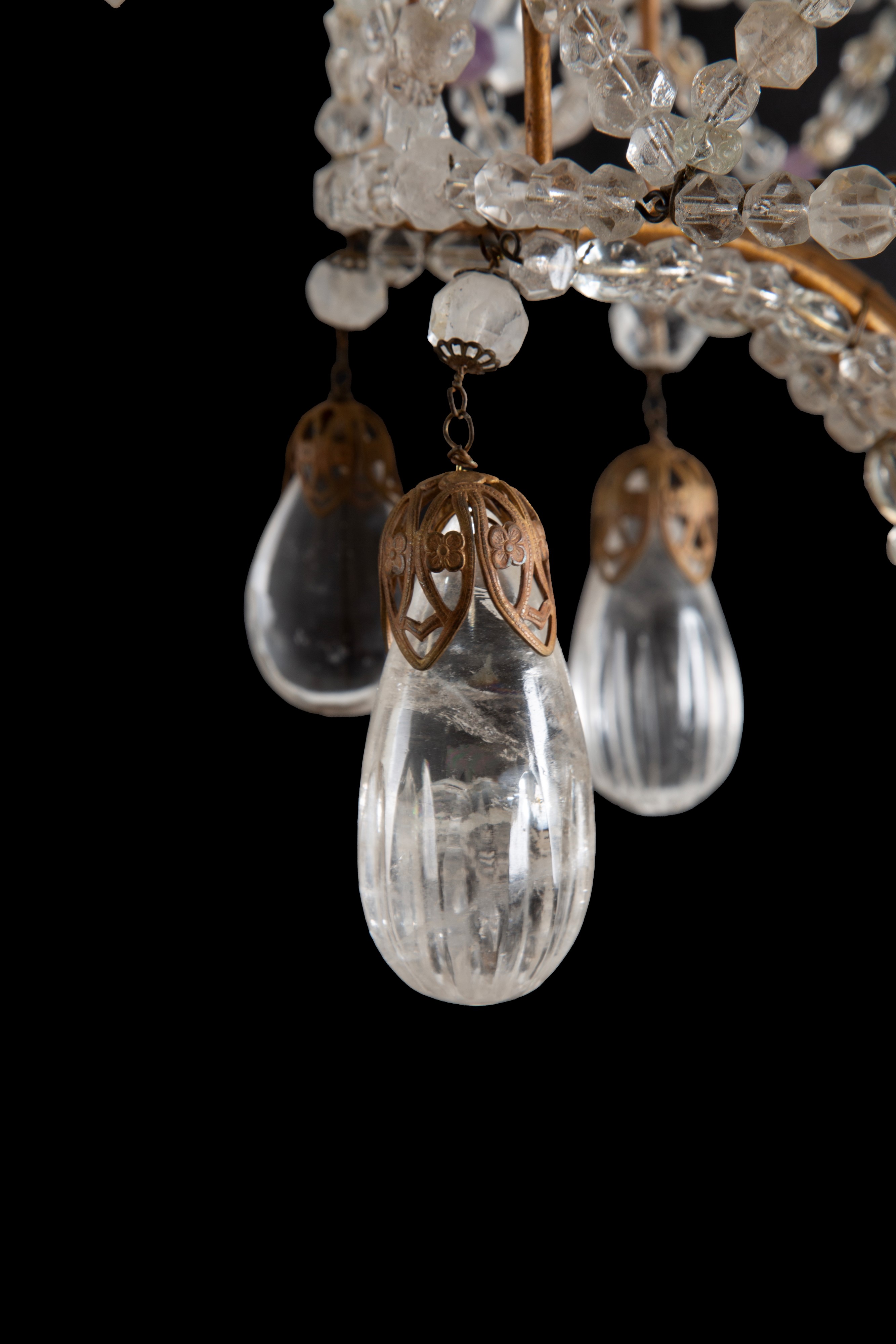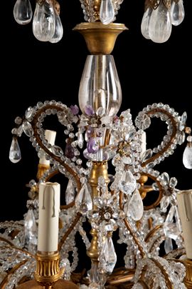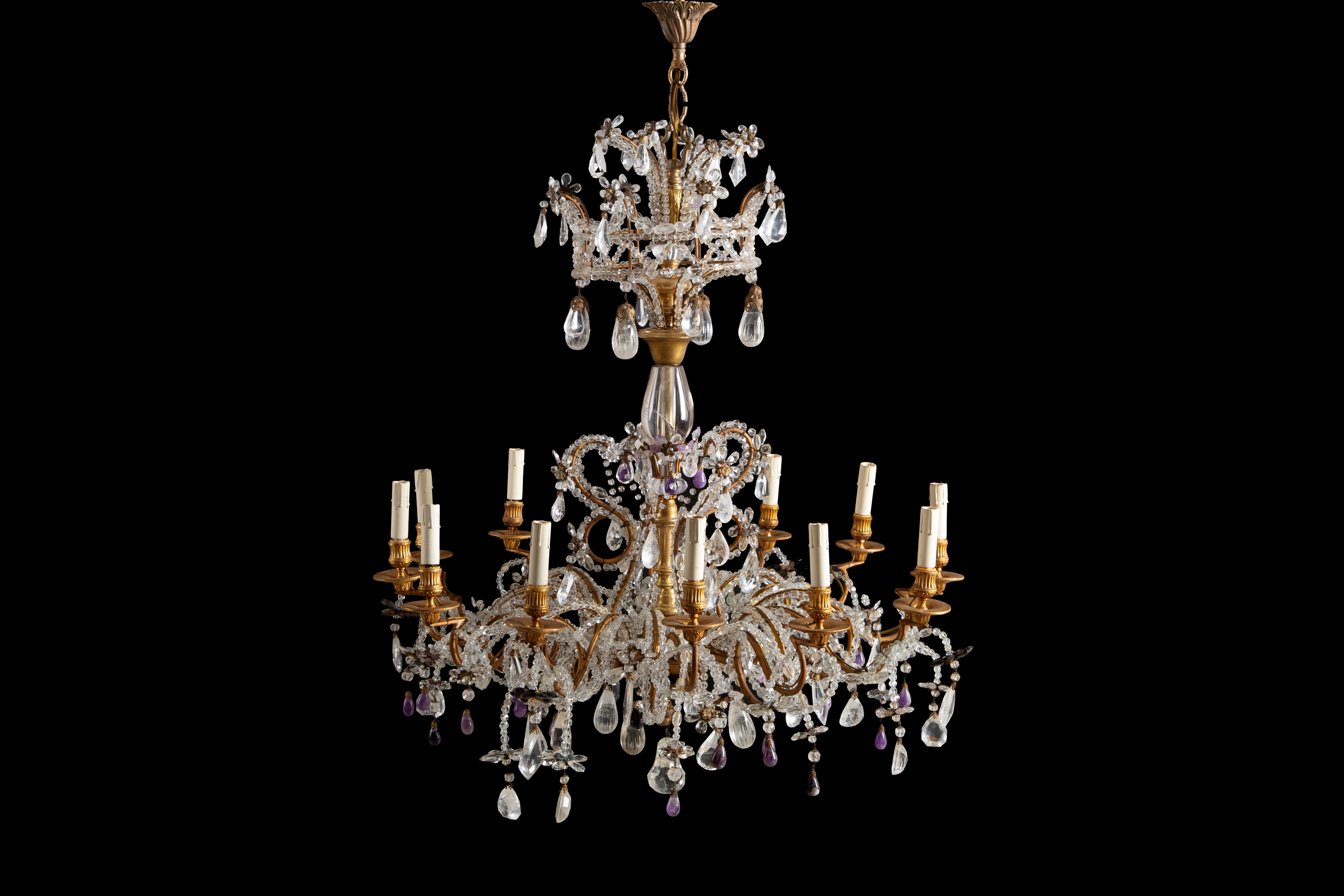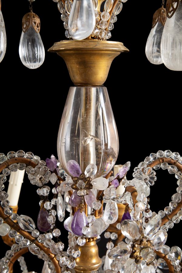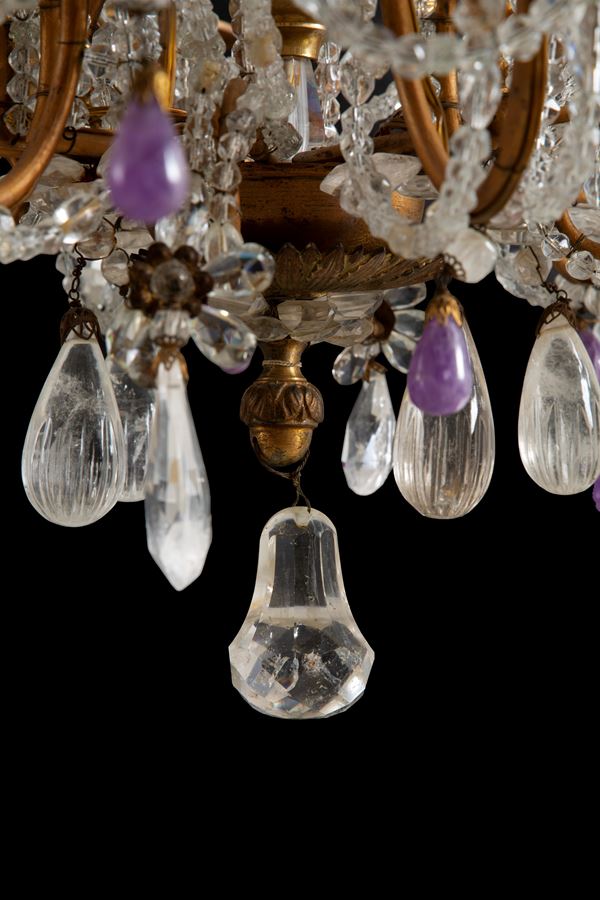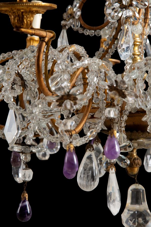 Lampadario dodici luci in bronzo, cristallo, cristallo di rocca e ametista. XIX secolo. Lievi difetti.