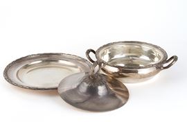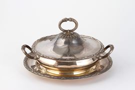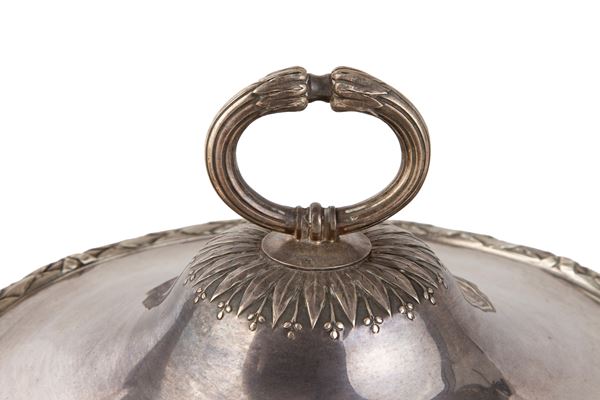 Legumiera con coperchio e vassoio in argento cesellato, gr. 2800 ca. complessivi. Argentiere ODIOT, Paris. Marcata sul fondo.