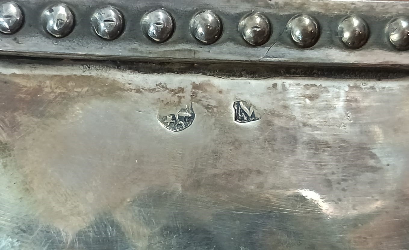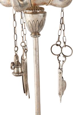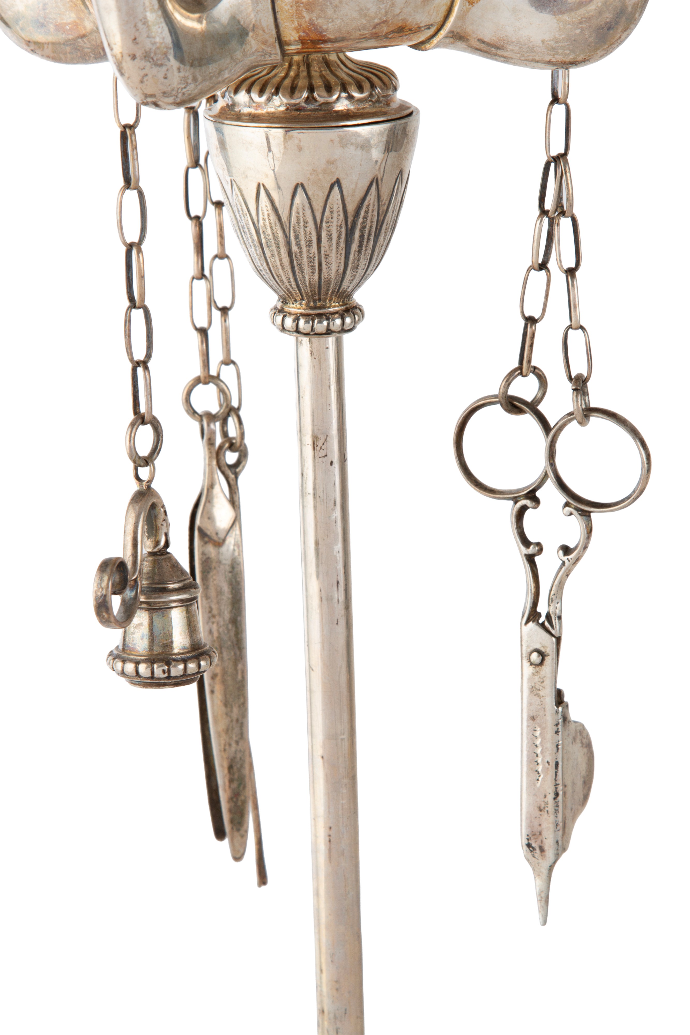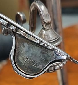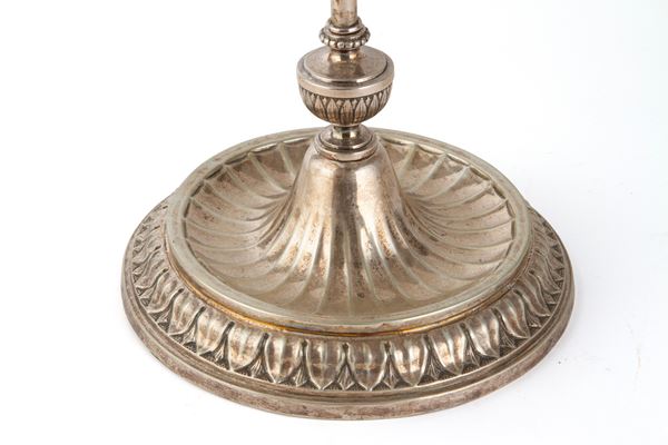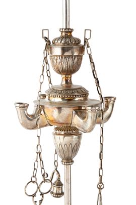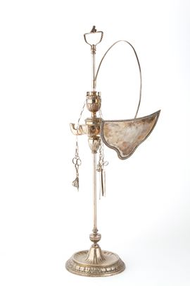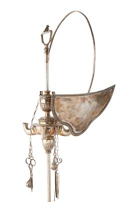 Lucerna romana in argento con ventola paraluce a forma di scudo. Orafo A. MALDURA. Punzoni sulla ventola e in altri punti.
