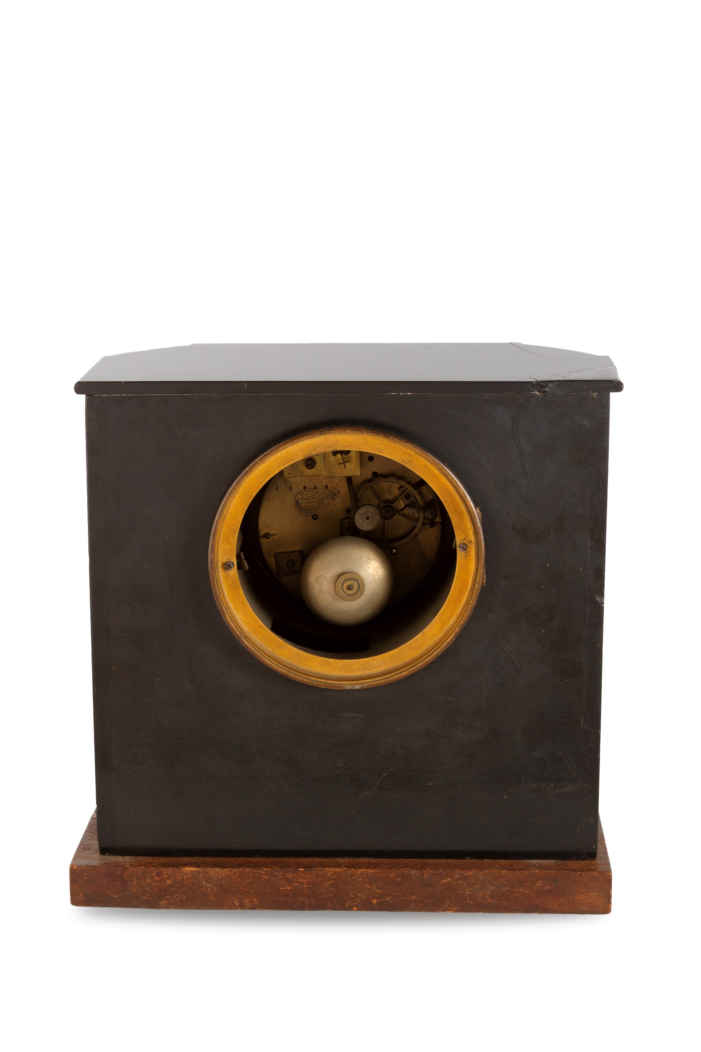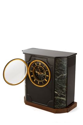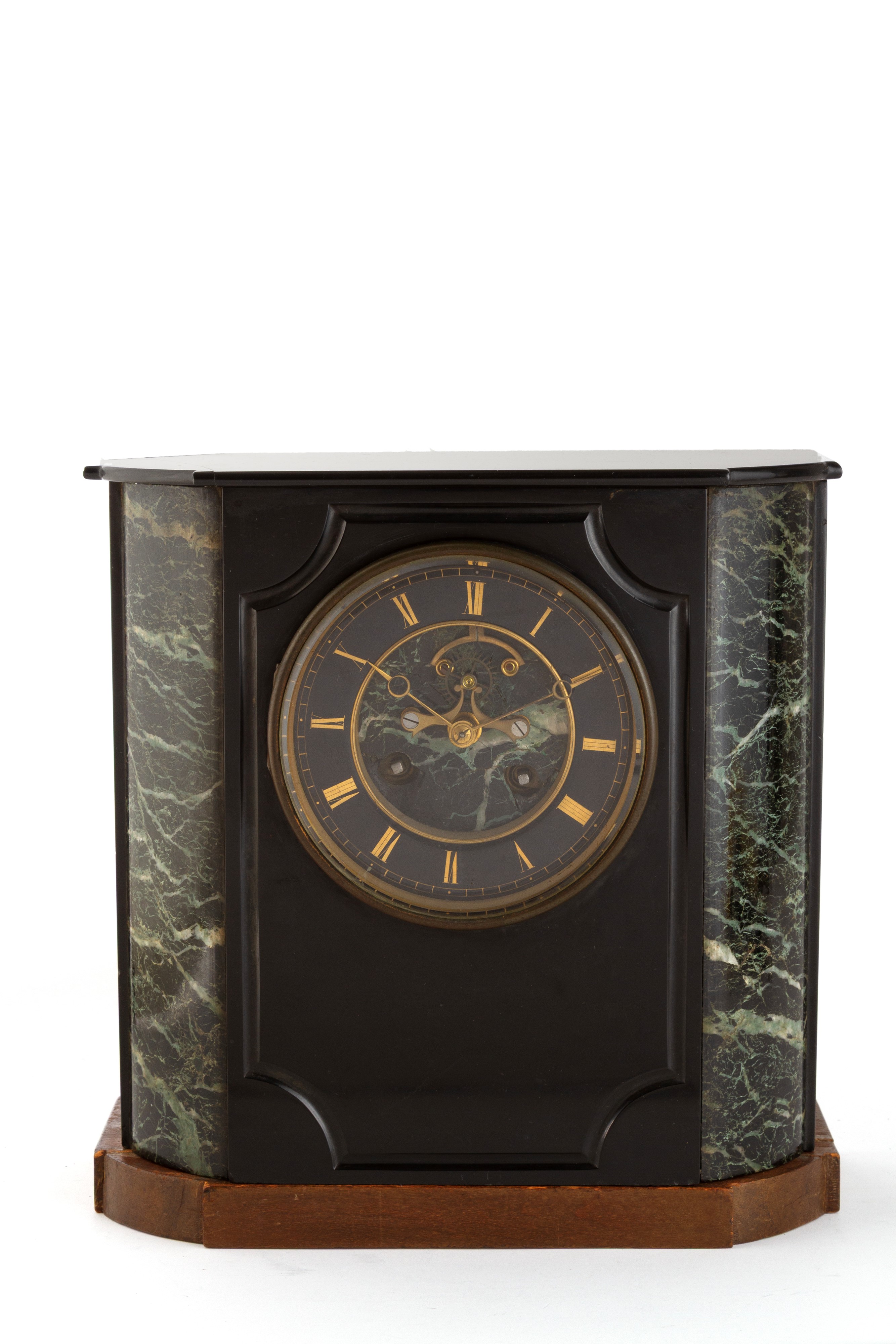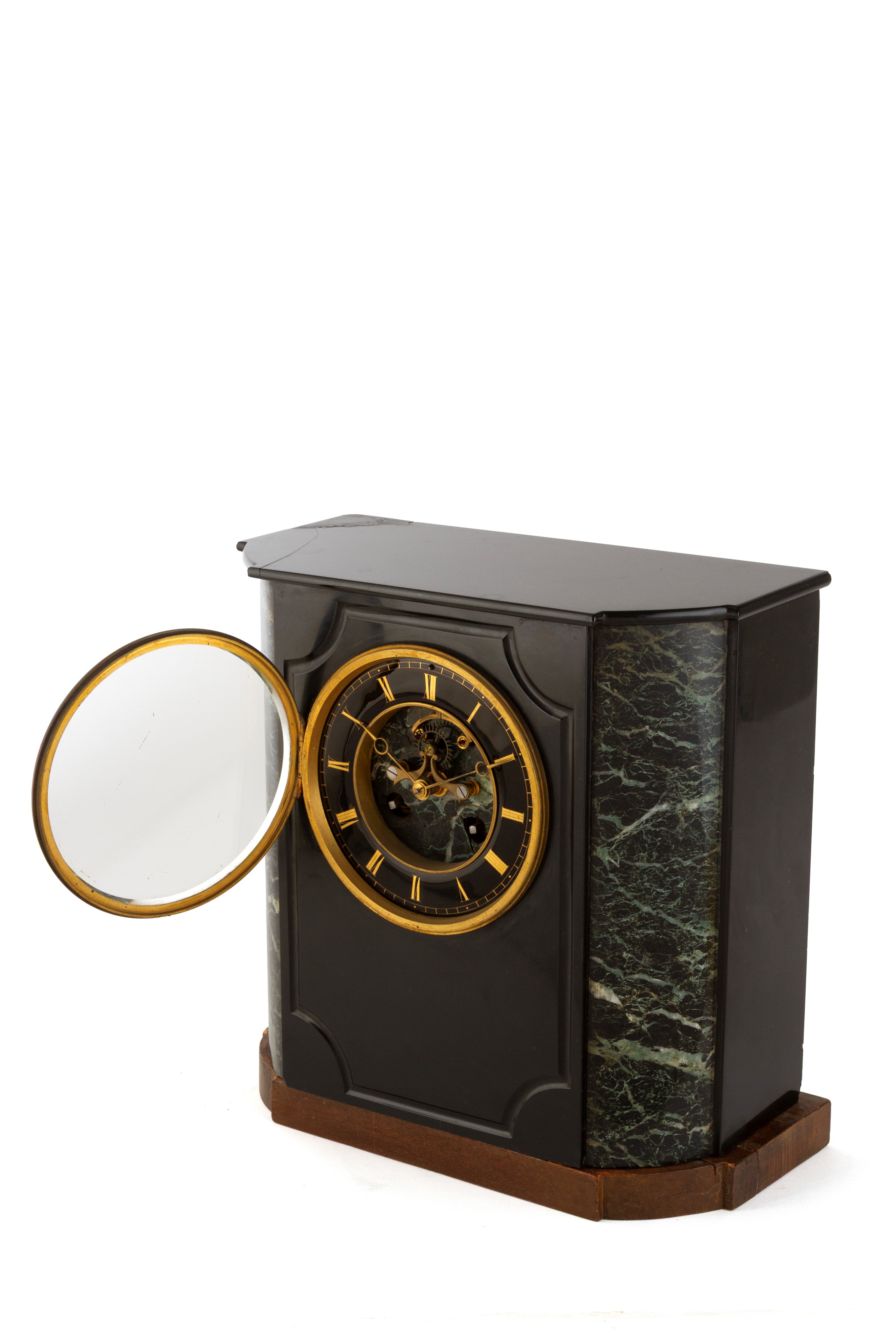 Orologio in marmo nero del Belgio e Verde Alpi. Base in legno. XX secolo.