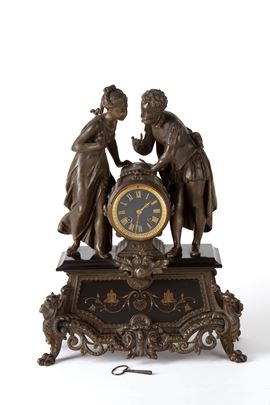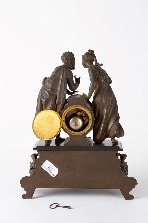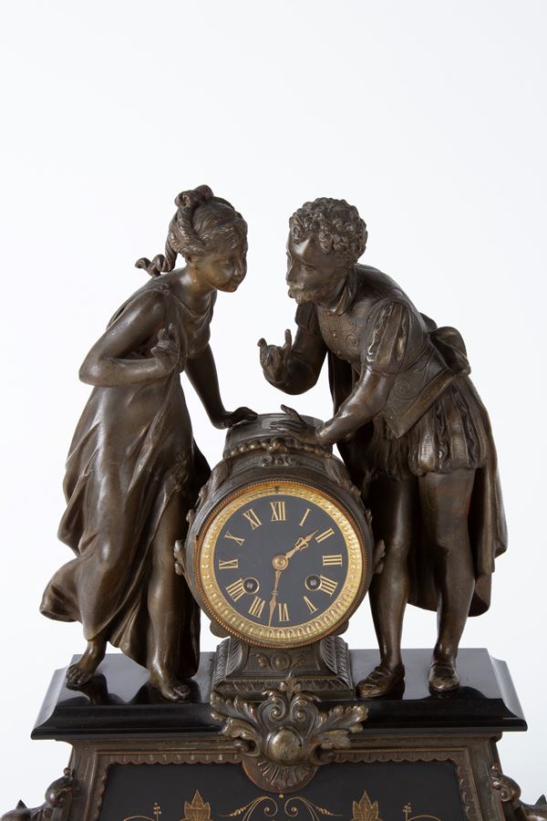 Orologio in marmo nero del Belgio e antimonio, decorato con due personaggi. XX secolo.