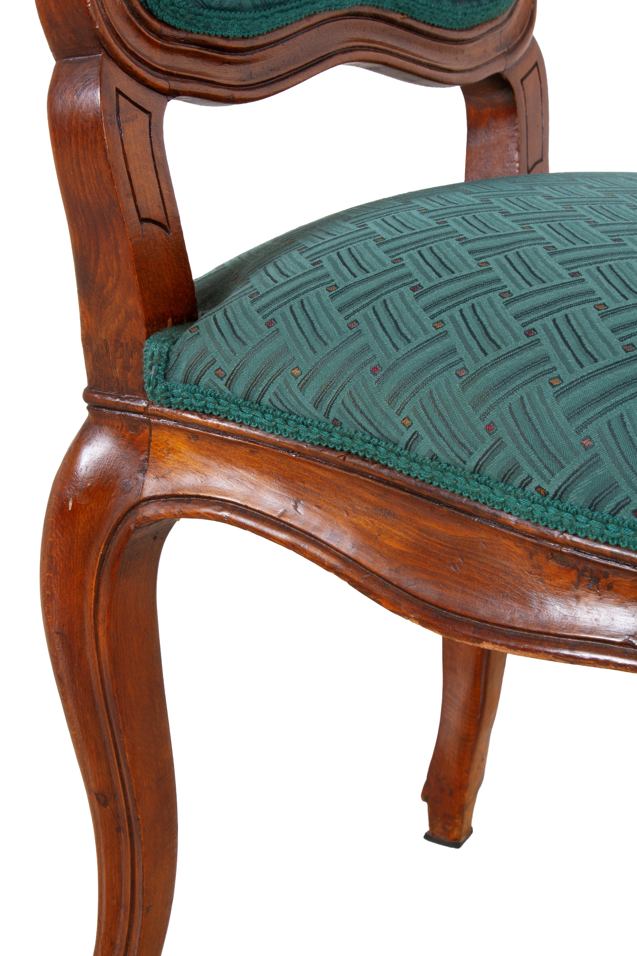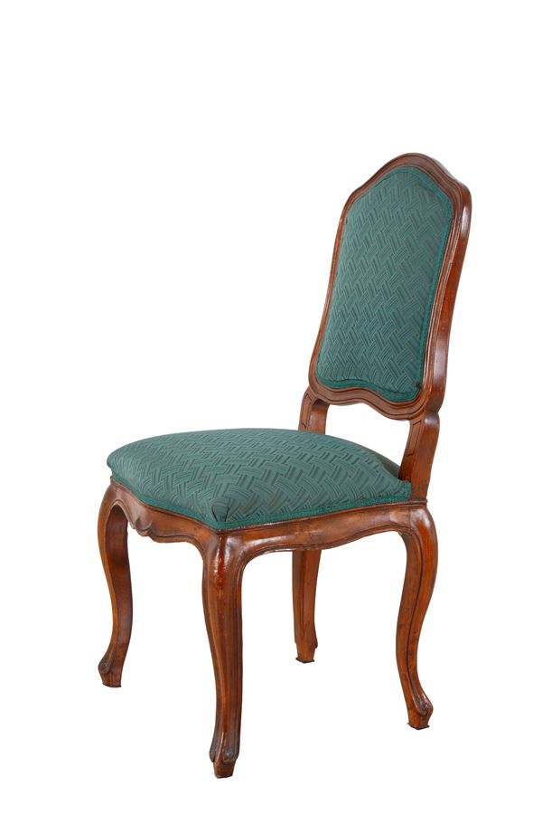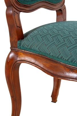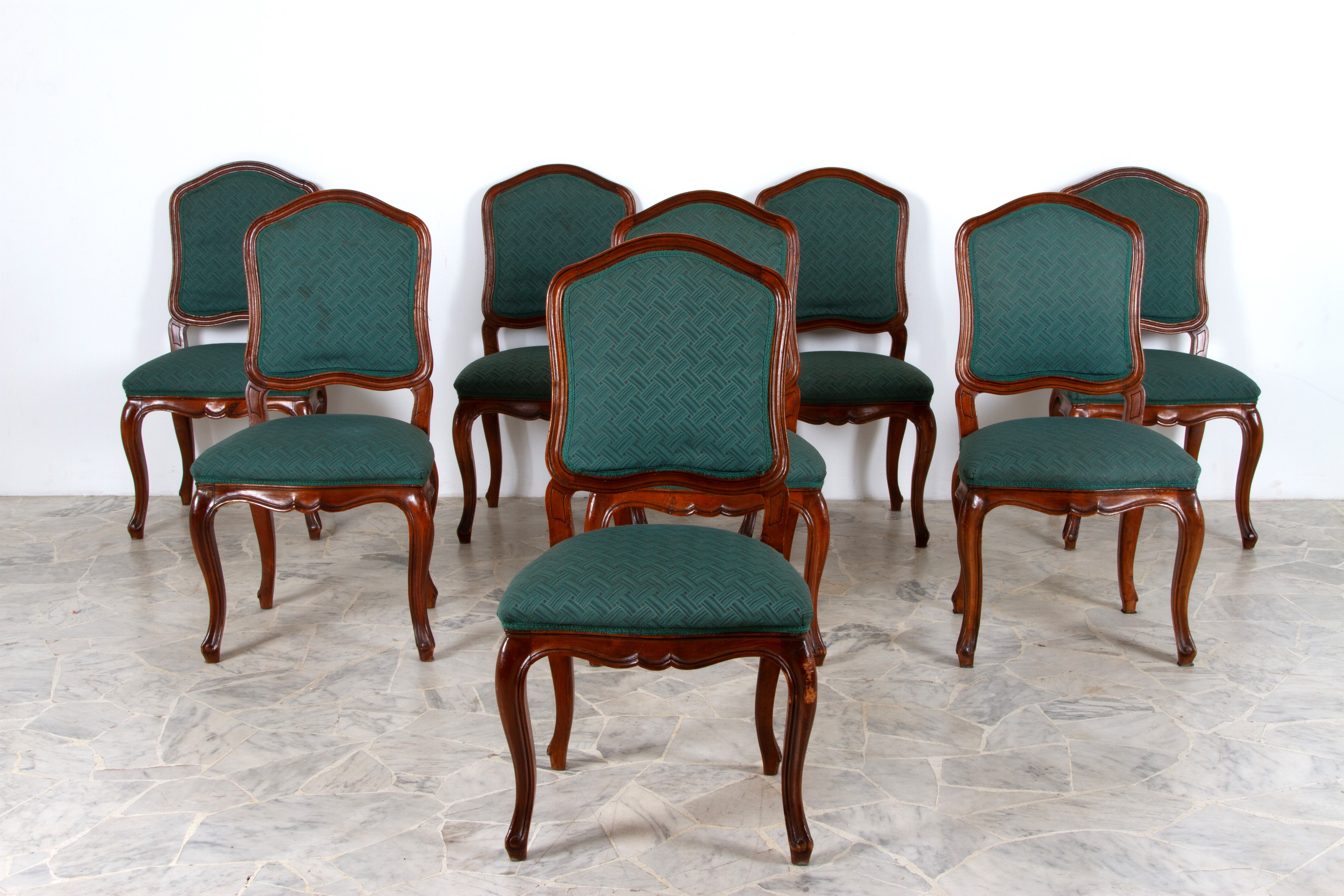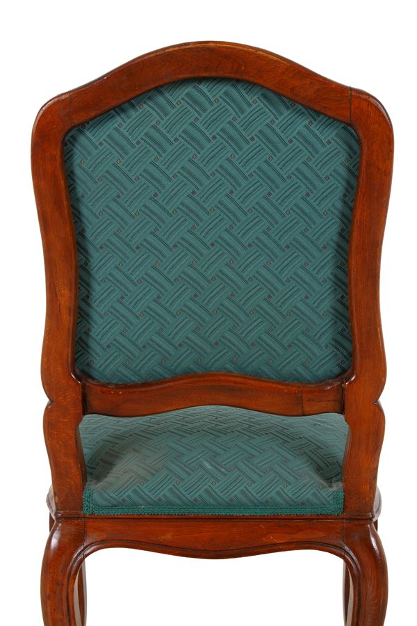 Otto sedie in legno di noce con sedute e schienali imbottiti. XIX secolo. Difetti.