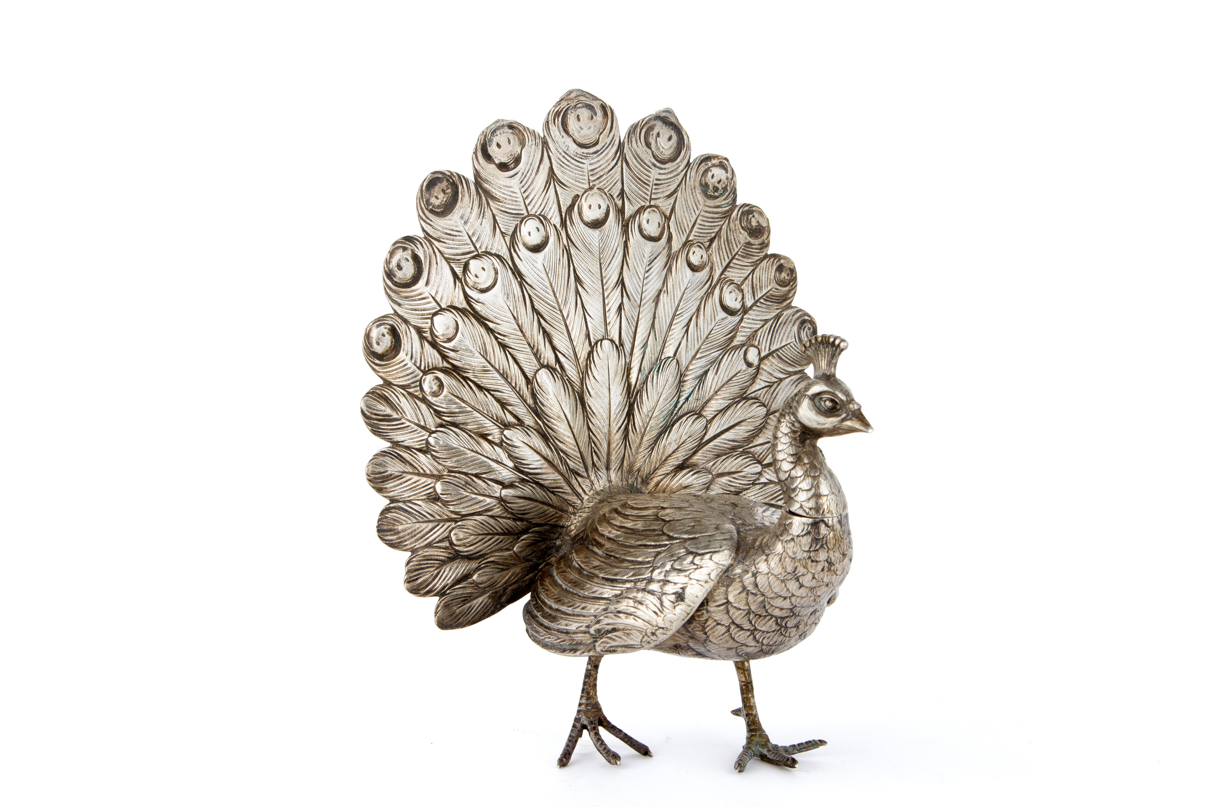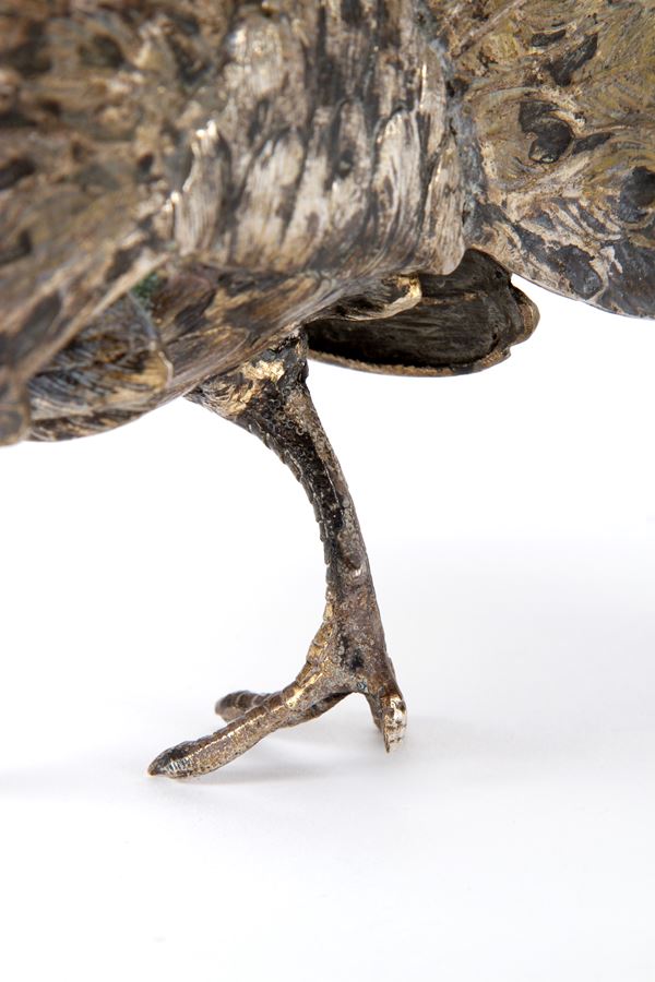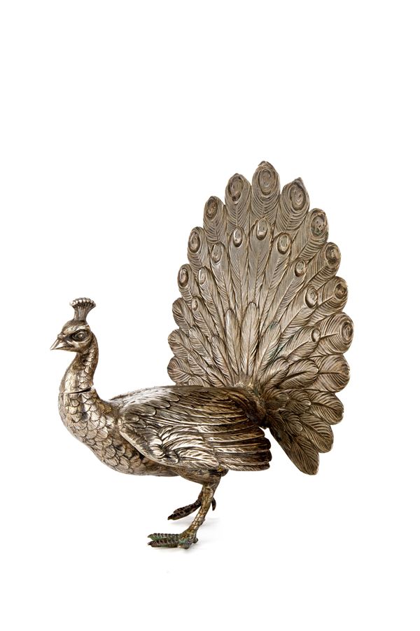 Contenitore a forma di pavone in argento cesellato, gr. 535 ca.
