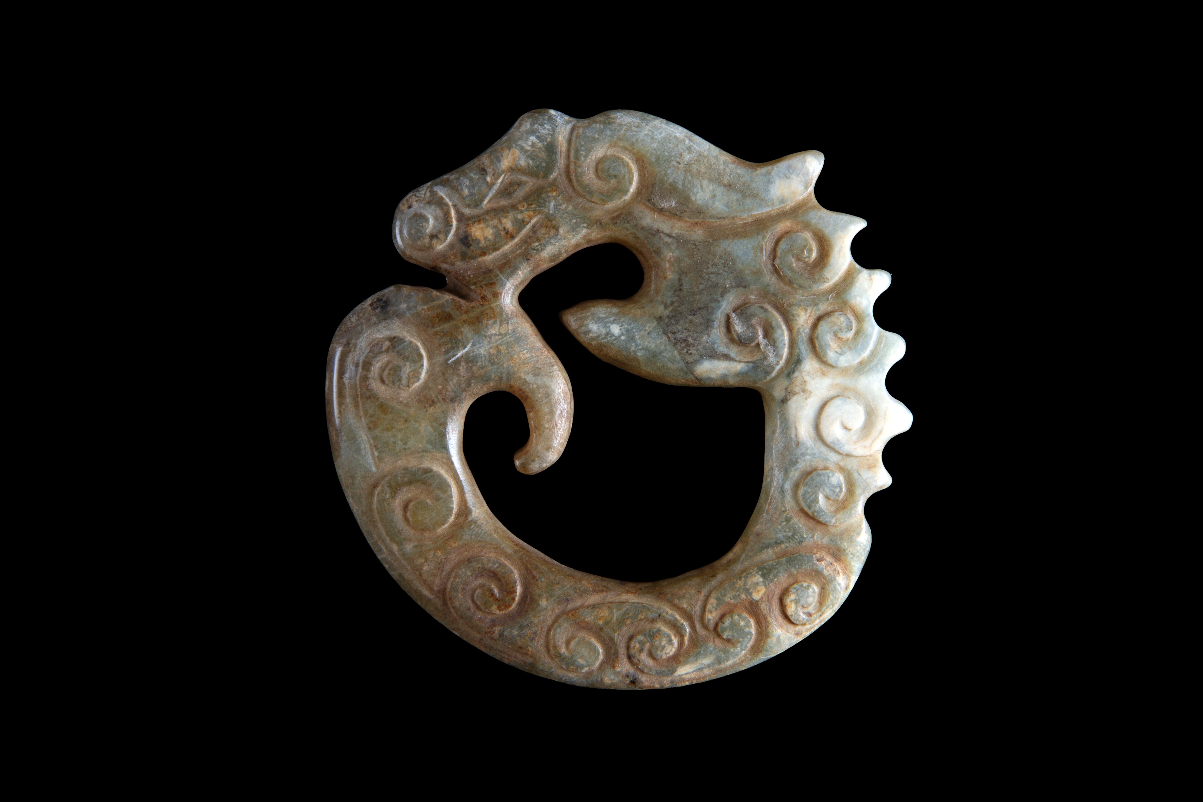 Pendente in giada traforata e intagliata a forma di drago arrotolato. Cina.