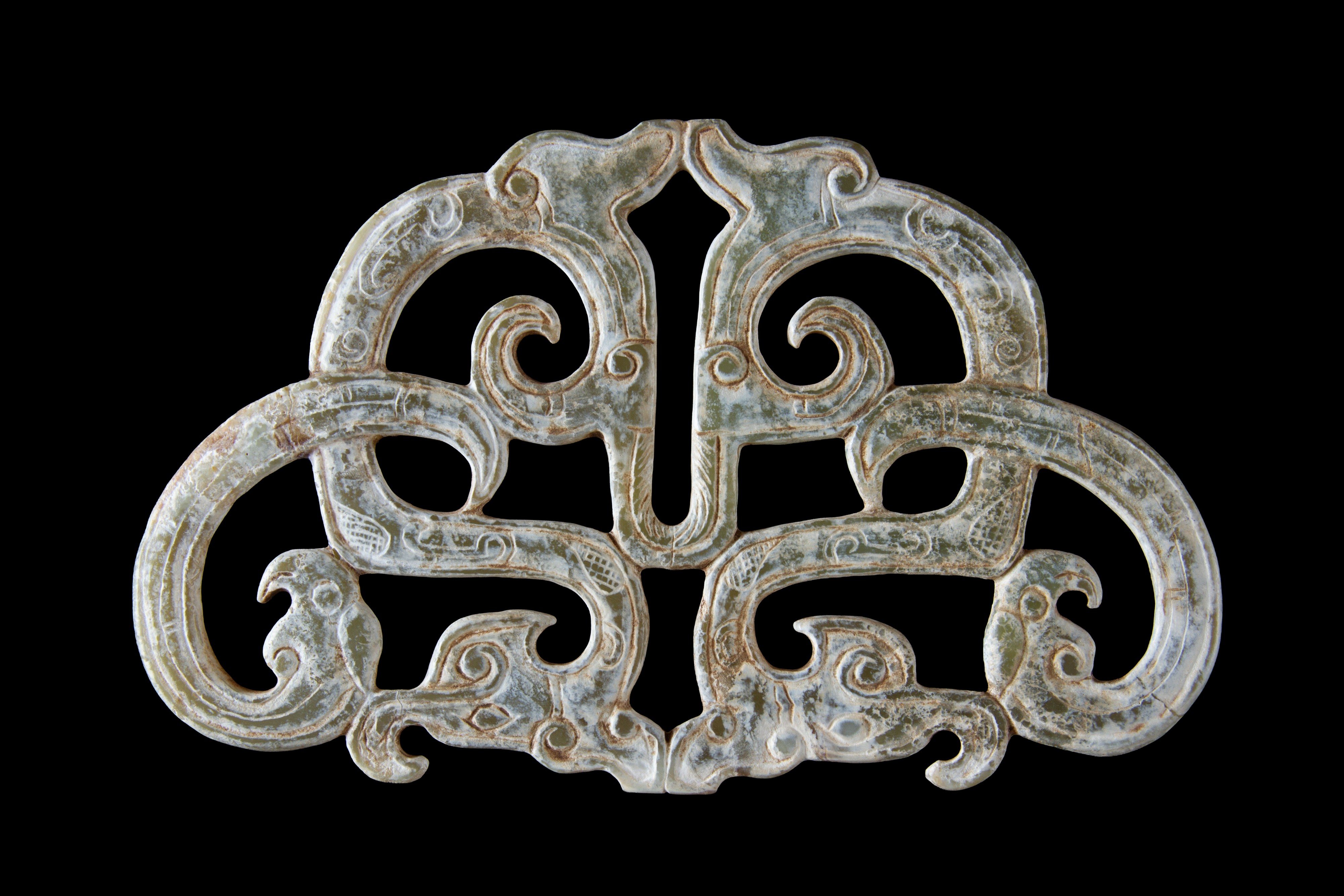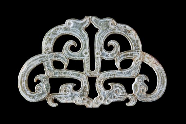 Ciondolo in giada traforata e incisa con due draghi. Cina.