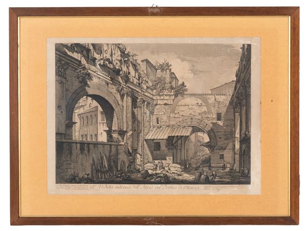 Acquaforte su carta raffigurante "VEDUTA INTERNA DELL'ATRIO DEL PORTICO DI OTTAVIA". Con cartiglio della Galleria Ciranna, Milano sul retro. In cornice. In cornice.