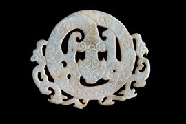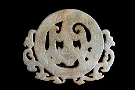 Placca in giada traforata e intagliata raffigurante drago. Cina.