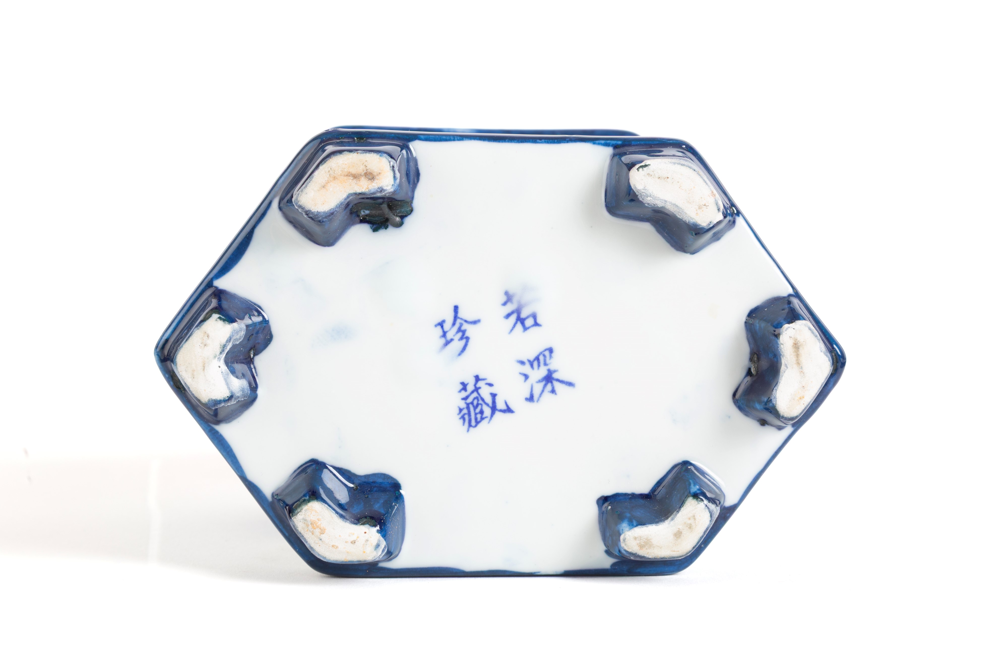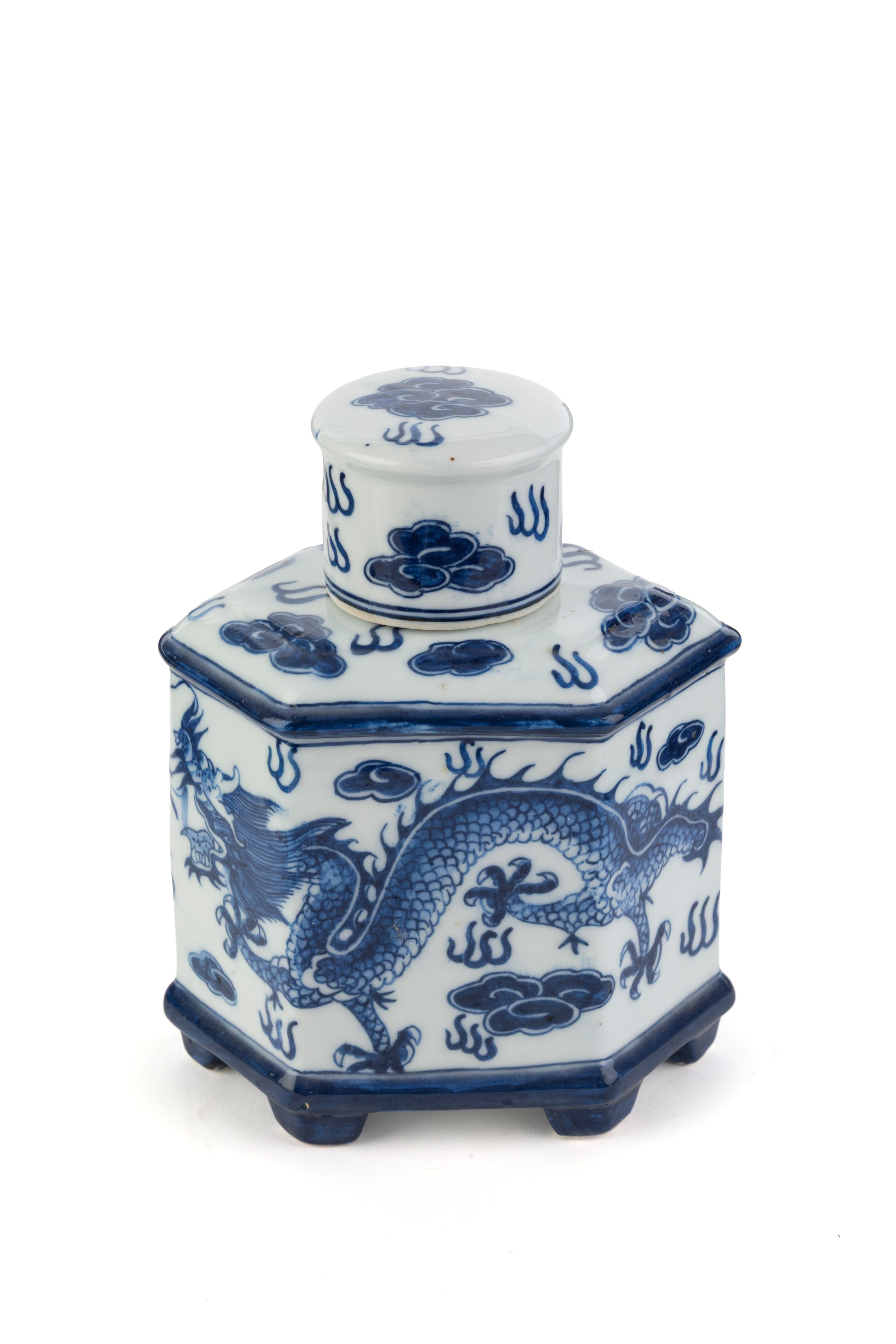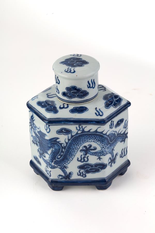 Porta tè in porcellana bianca e blu con dragone. Marcato sul fondo. Cina. Inizi XX secolo.