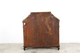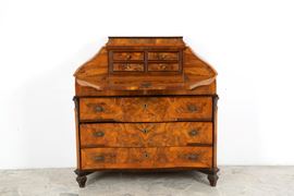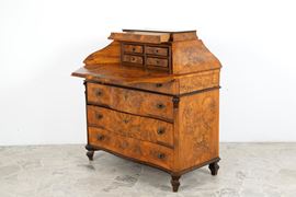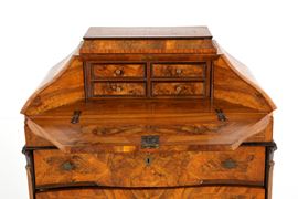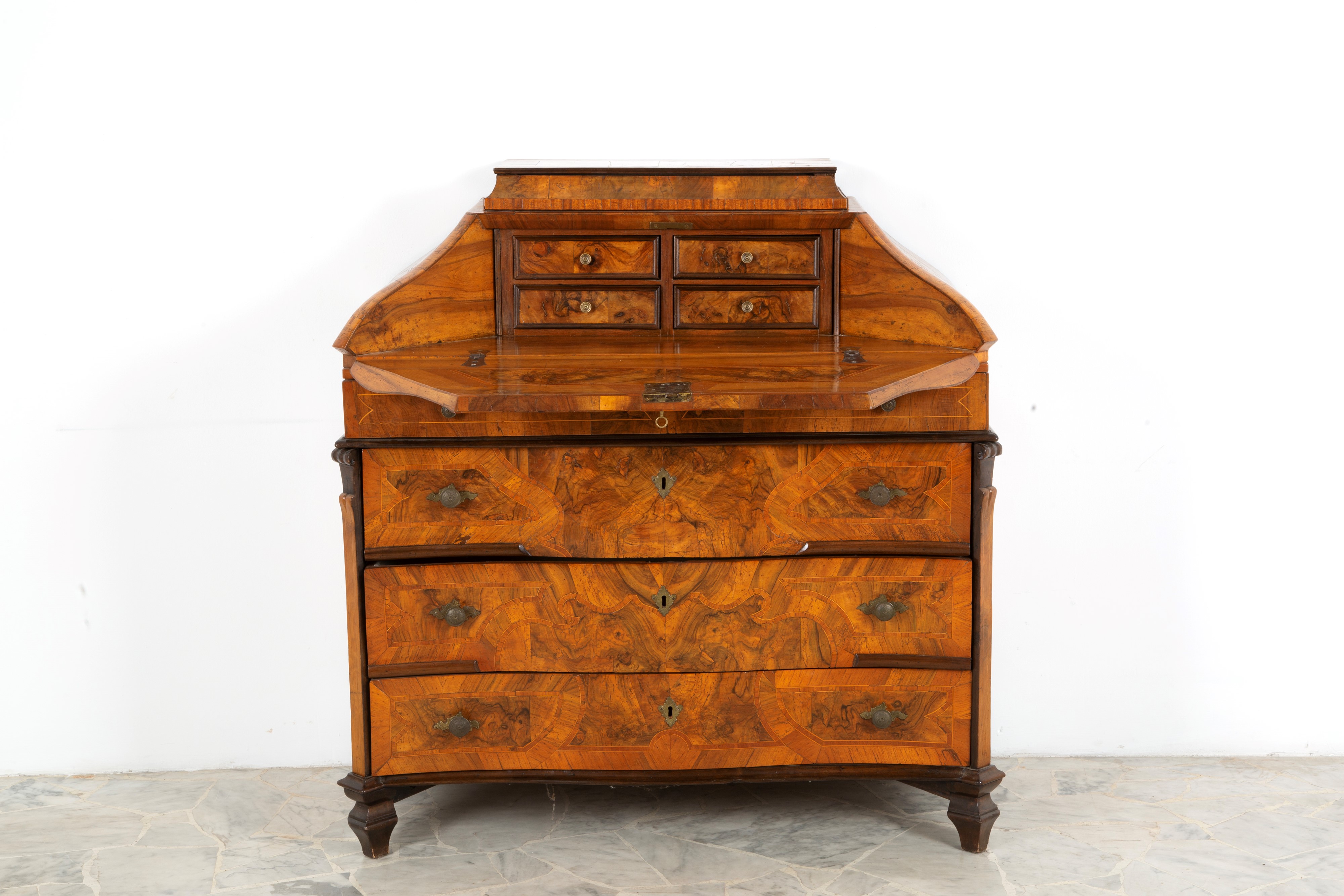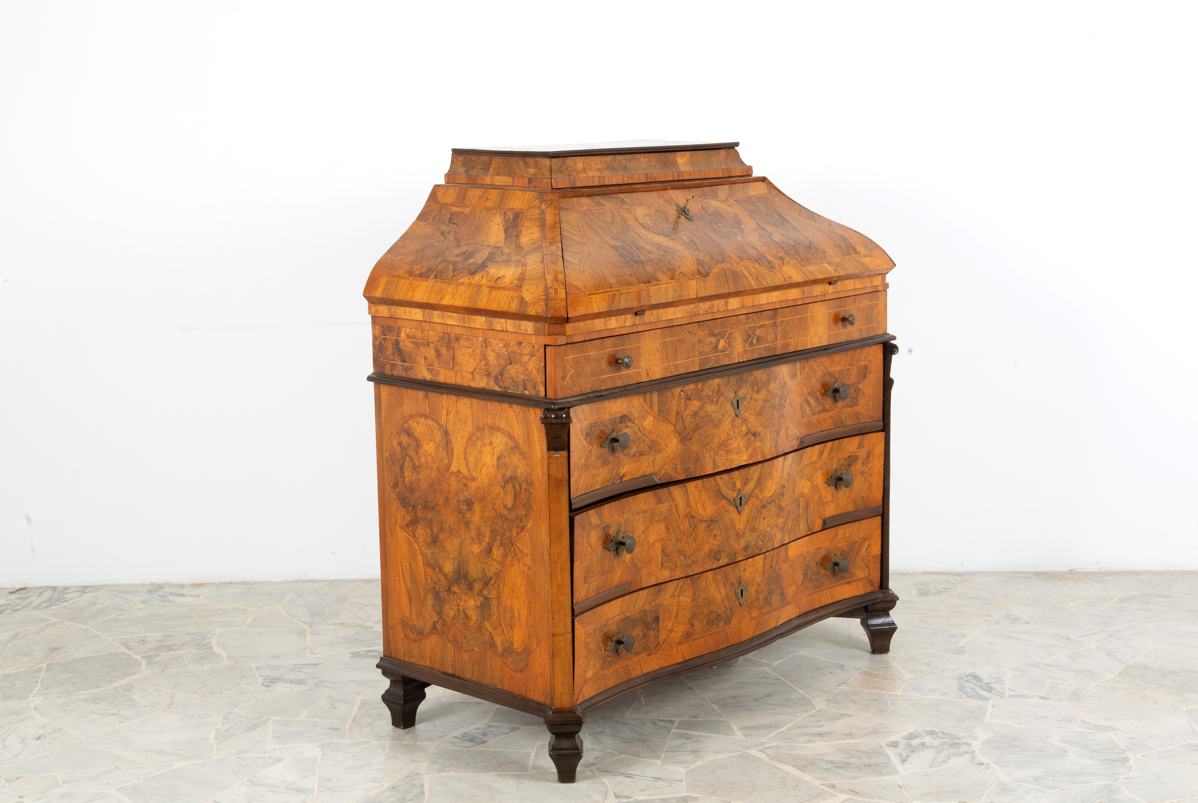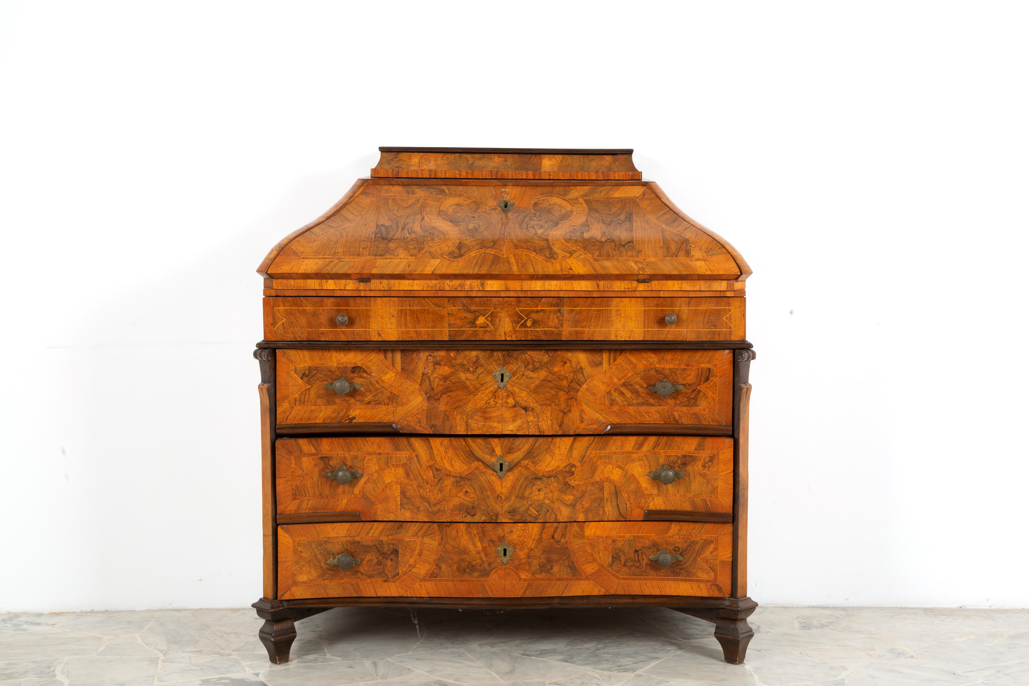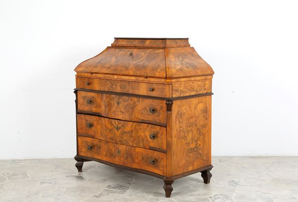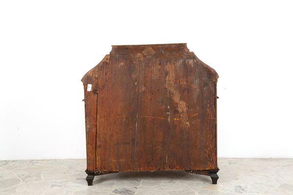 Ribalta mossa lastronata in noce e filettata in legno vari con quattro cassetti. Lombardia. XVIII secolo. Difetti.
