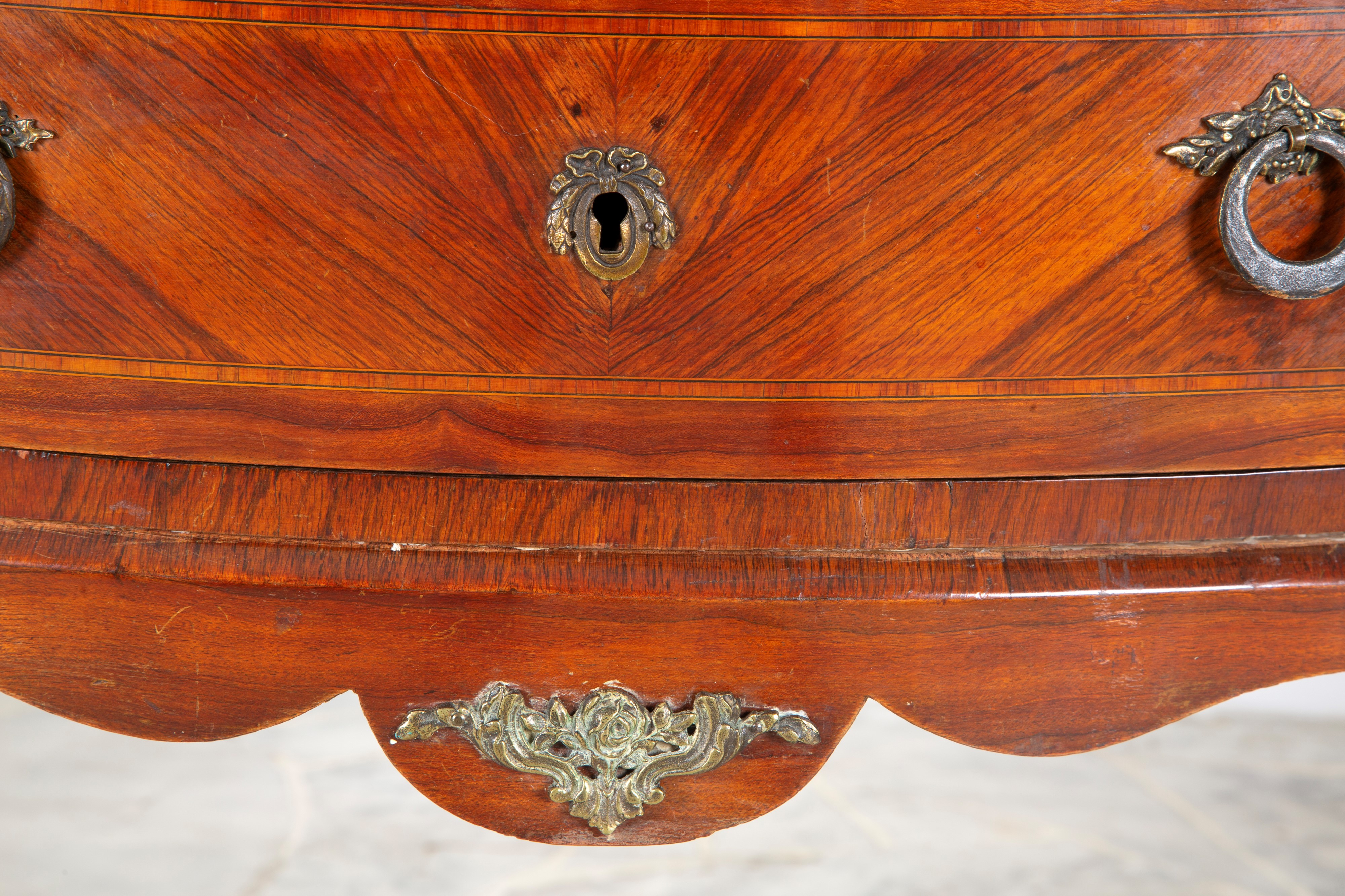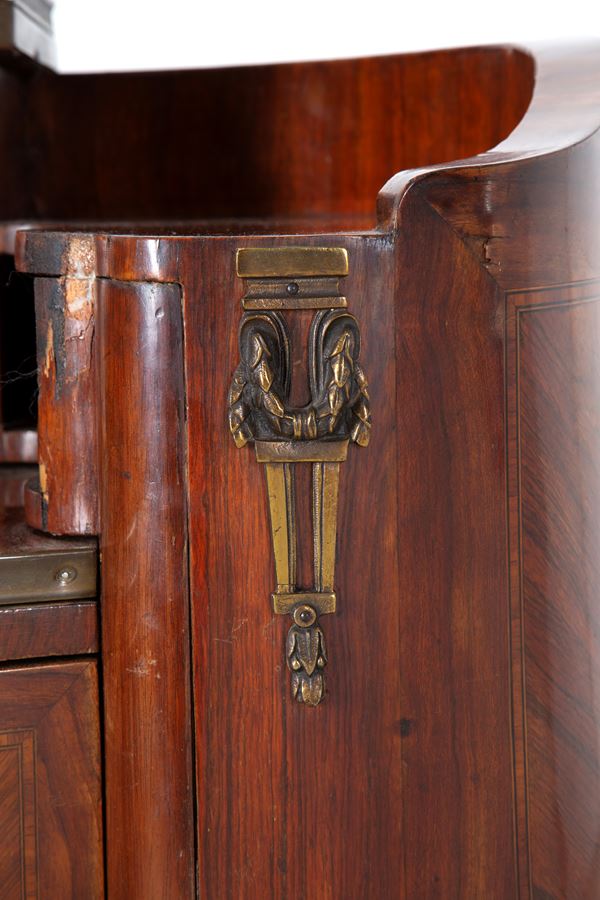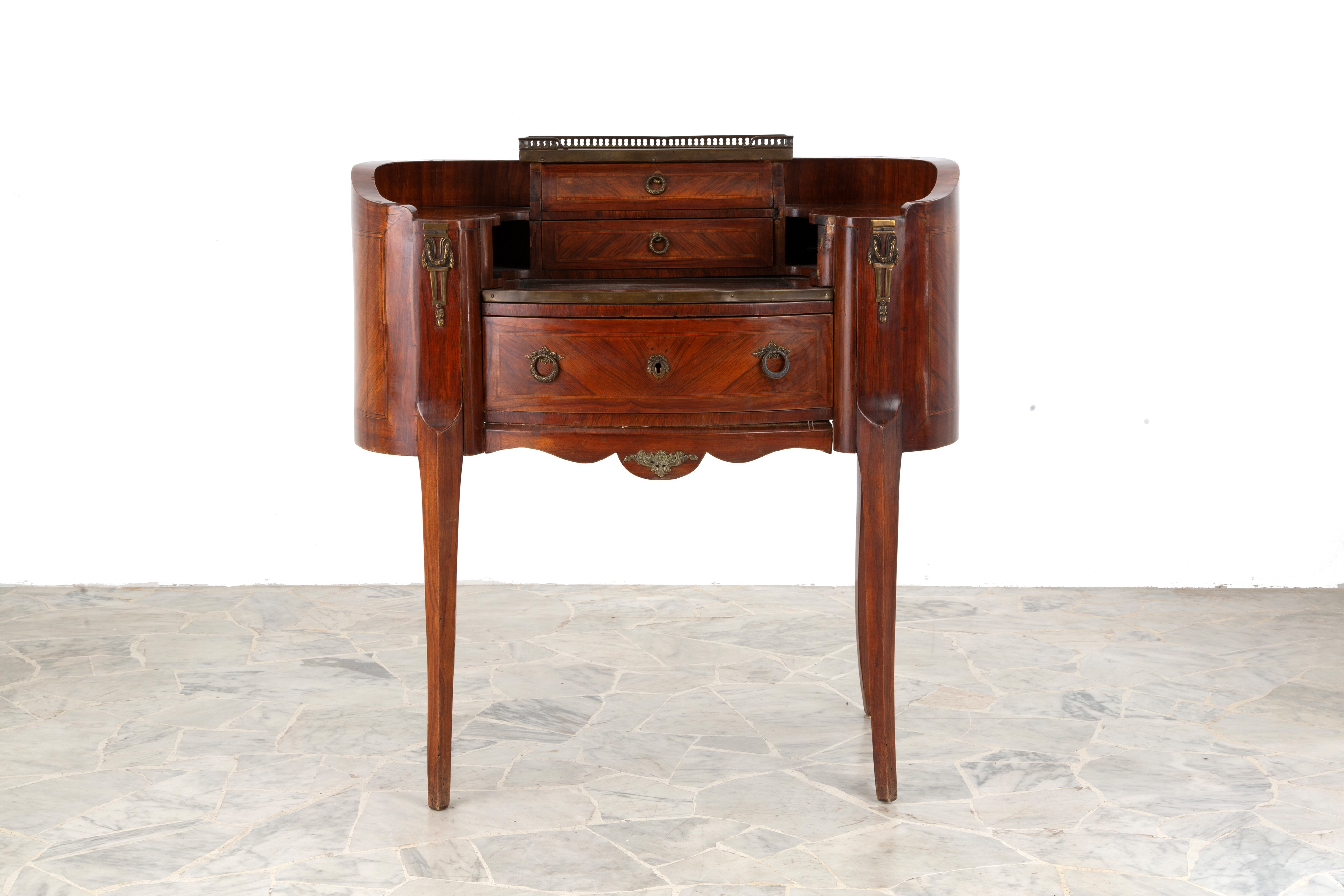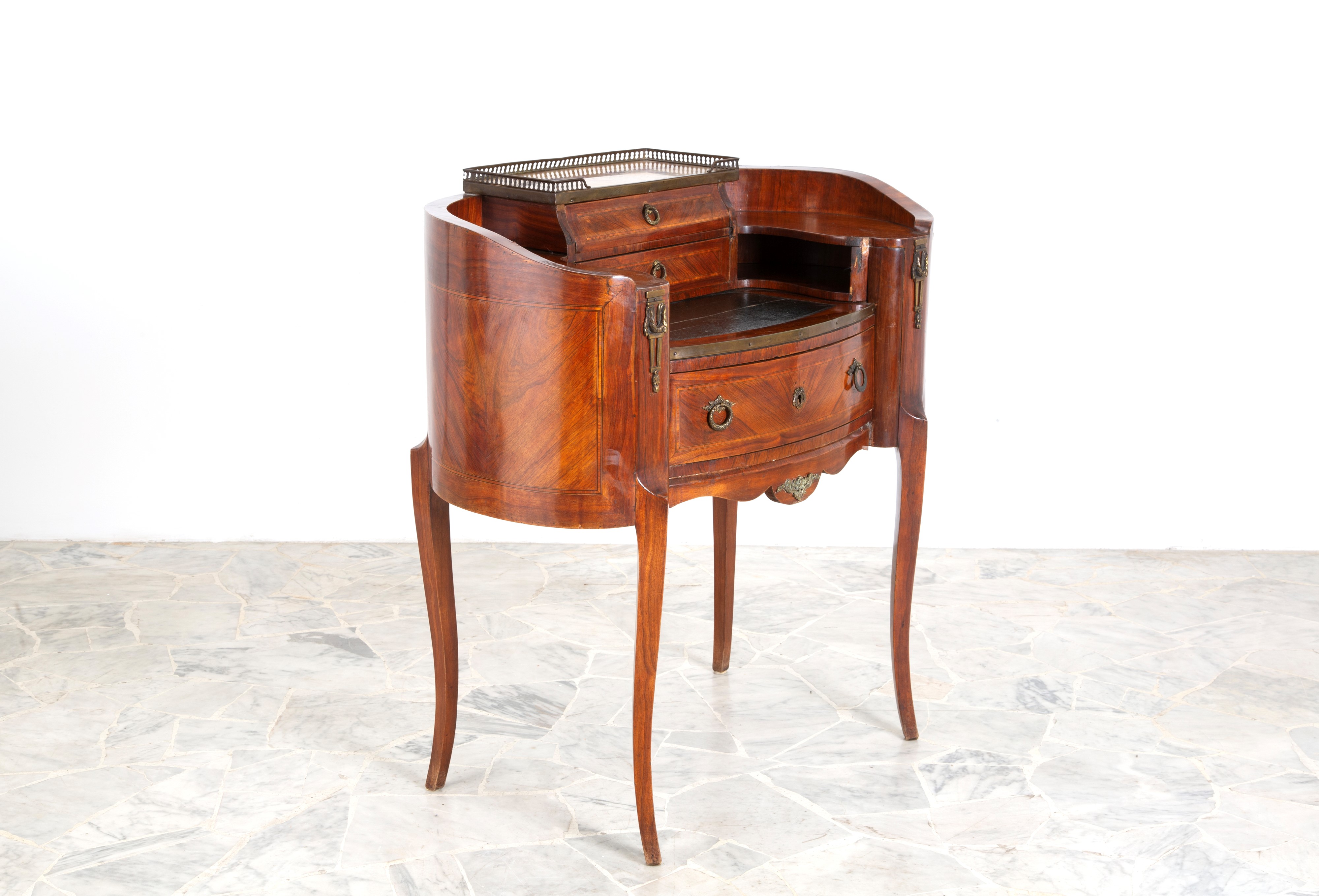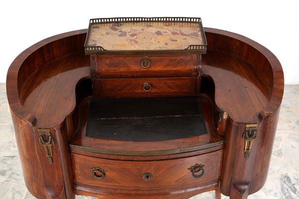 Scrittoio a fagiolo lastronato in legno di noce con piano superiore in marmo e gambe sagomate. XIX secolo. Difetti.
