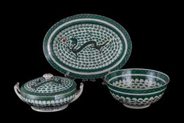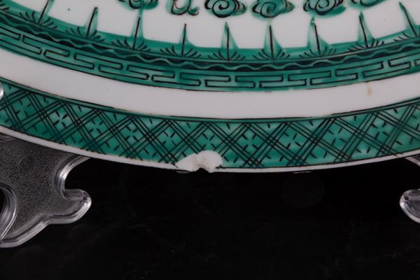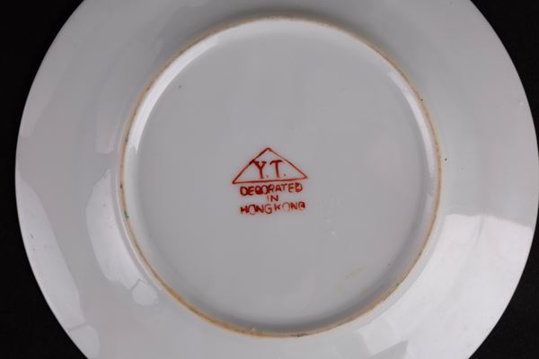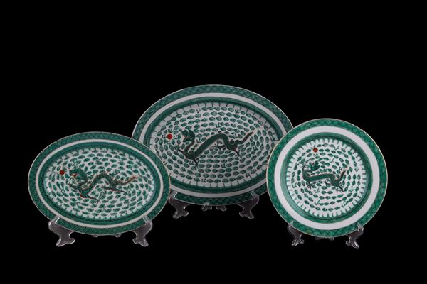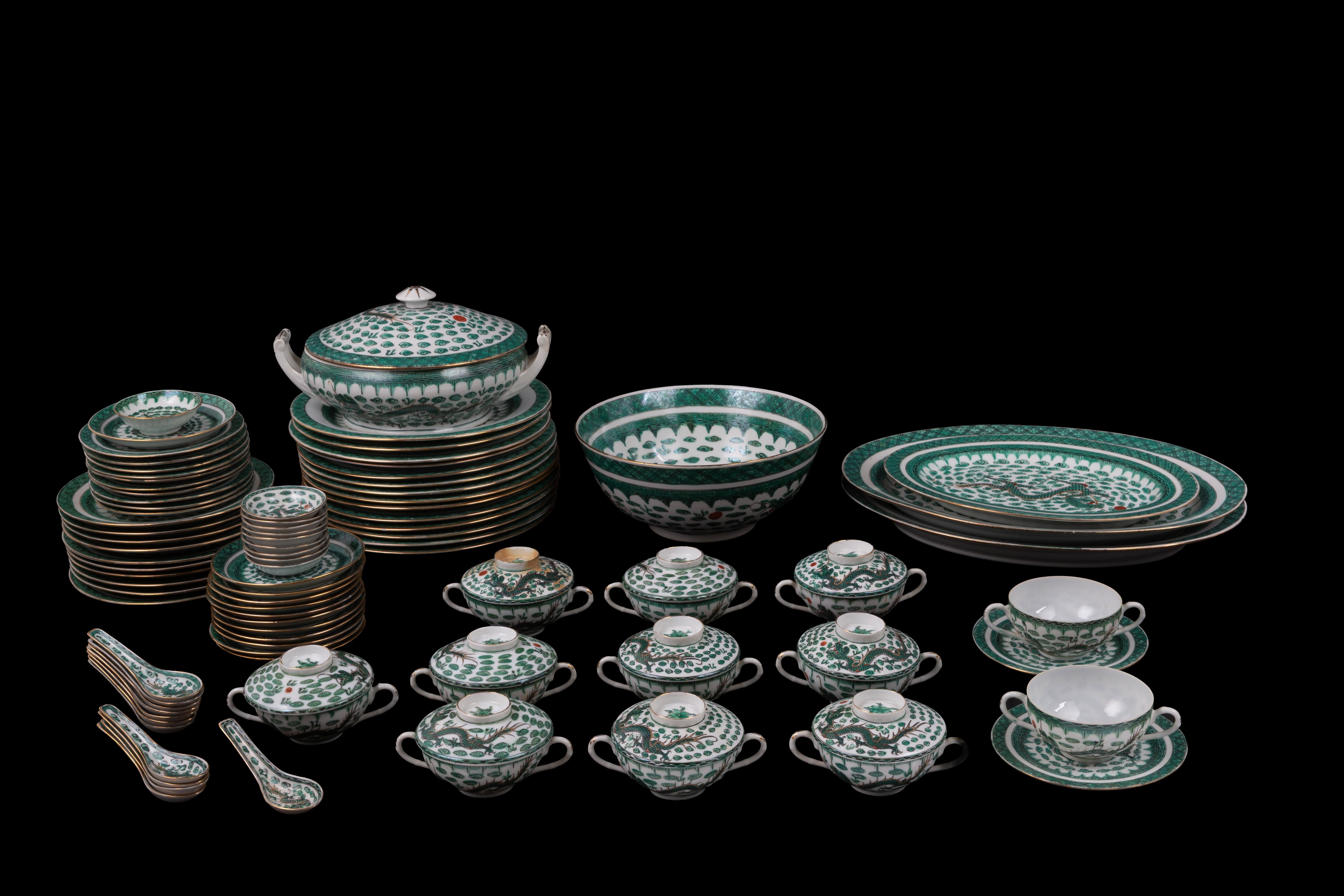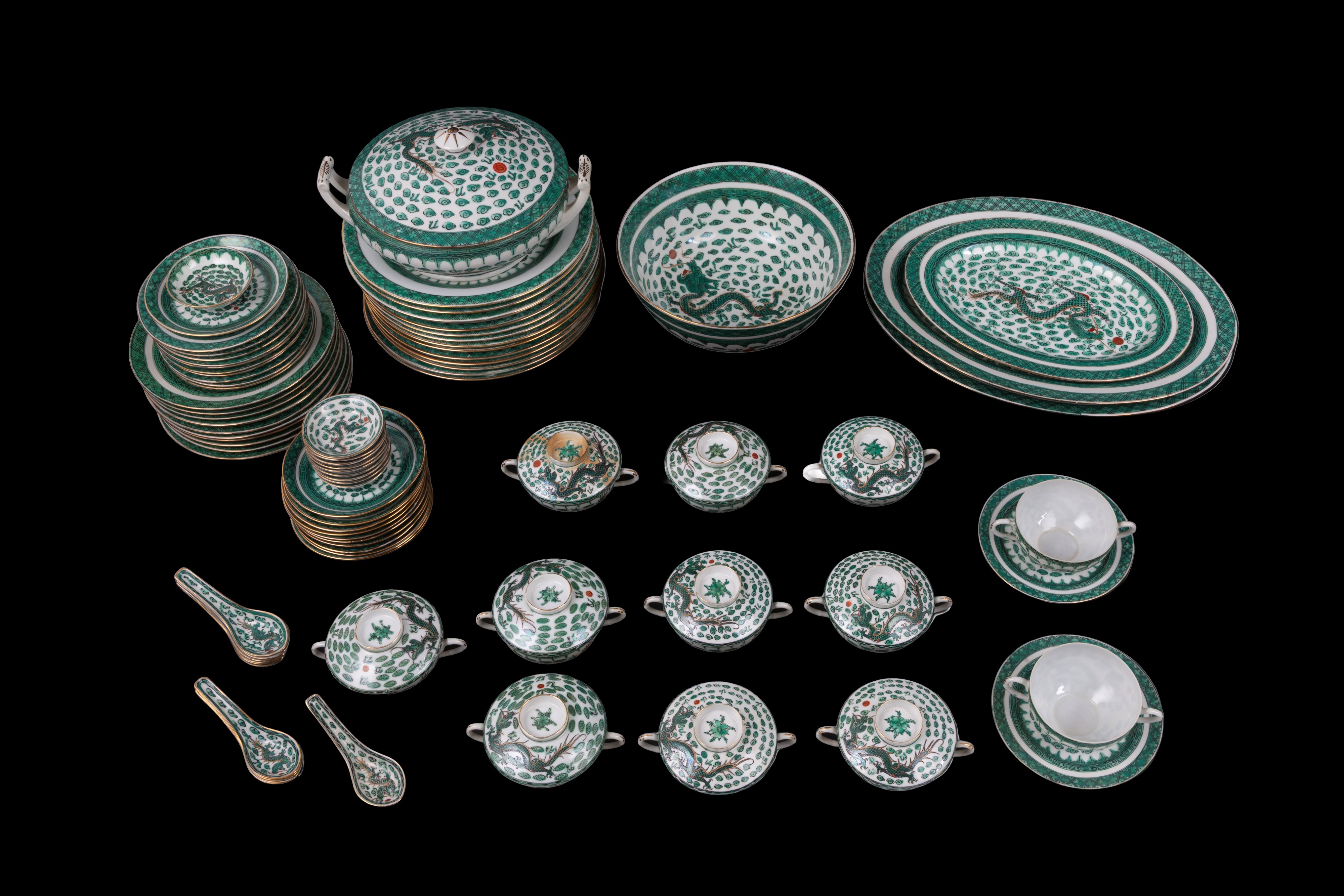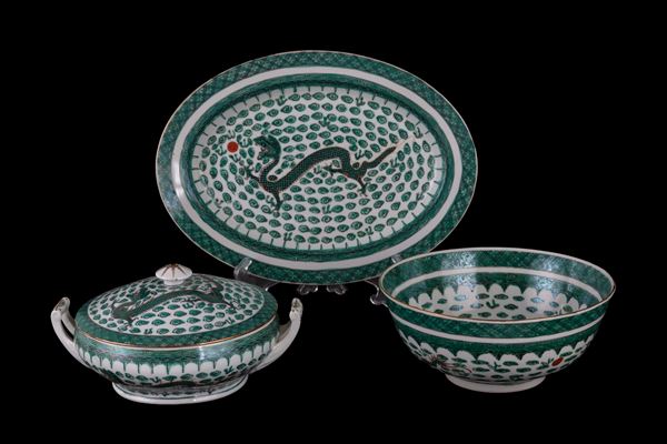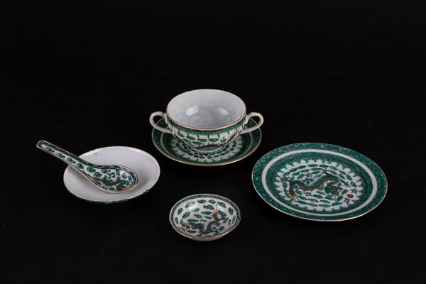 Servizio in porcellana dipinta a motivi di draghi composto da una zuppiera, una ciotola, due piatti ovali da portata, un piatto ovale, quattordici piatti piani, dieci piatti medi, dodici piattini, dodici tazze da brodo con piattini e cucchiai e dieci coperchi, dieci ciotoline di cui una più grande. Marcati sul fondo. Cina. XX secolo. Un piatto sbeccato e una tazza restaurata.