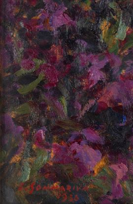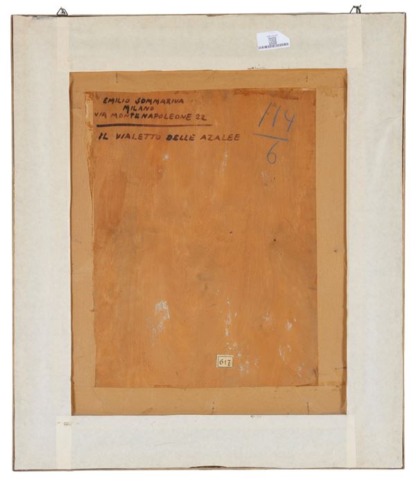 Dipinto olio su tavoletta intitolato "IL VIALETTO DELLE AZALEE" sul retro. Firmato e datato 1956 in basso a sinistra. In cornice in legno dorato.