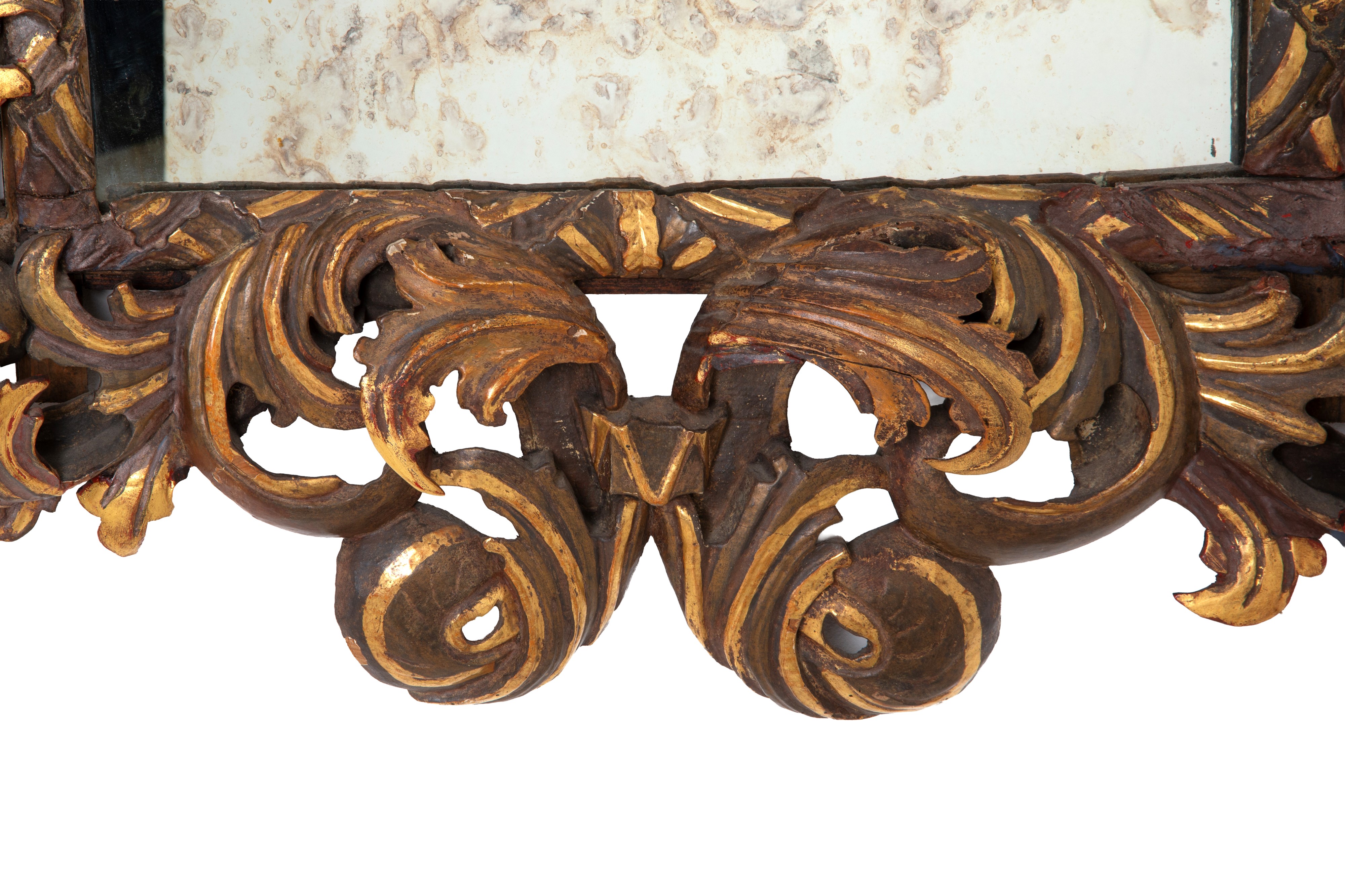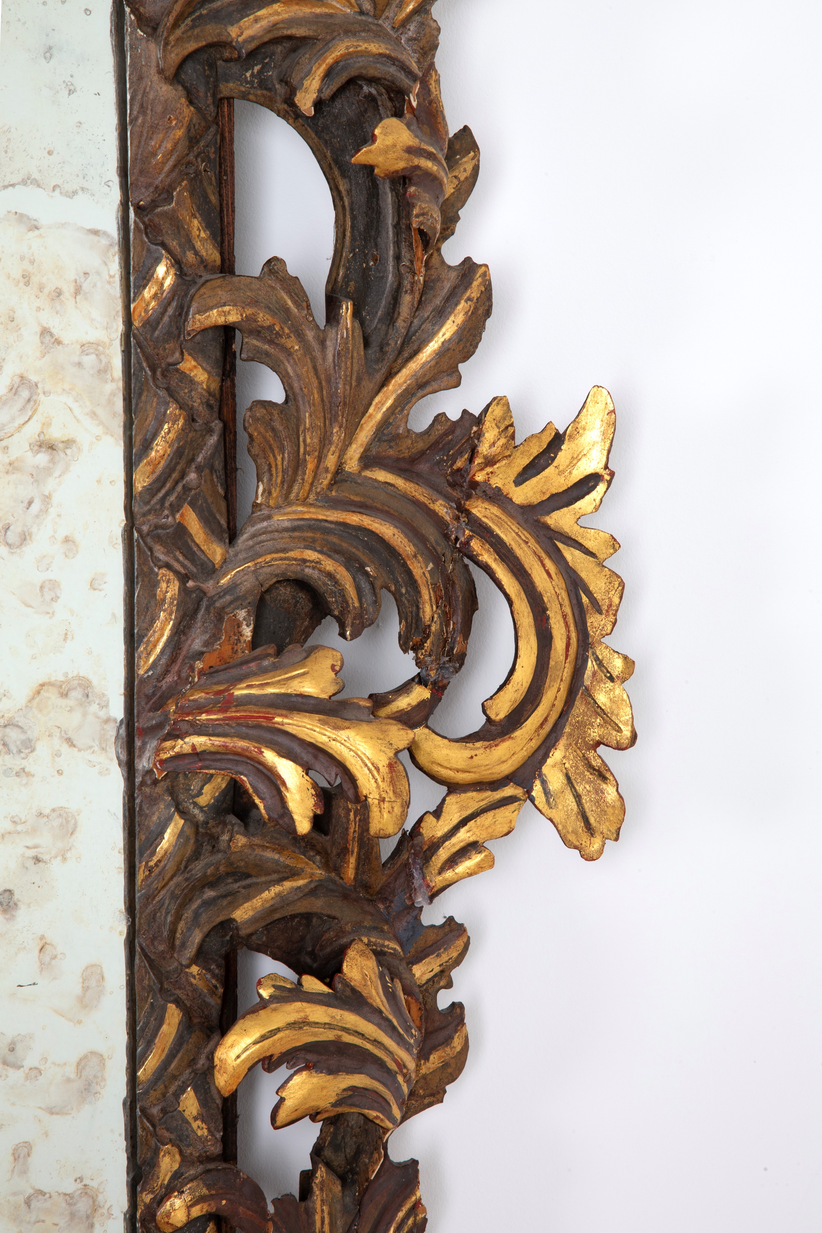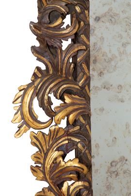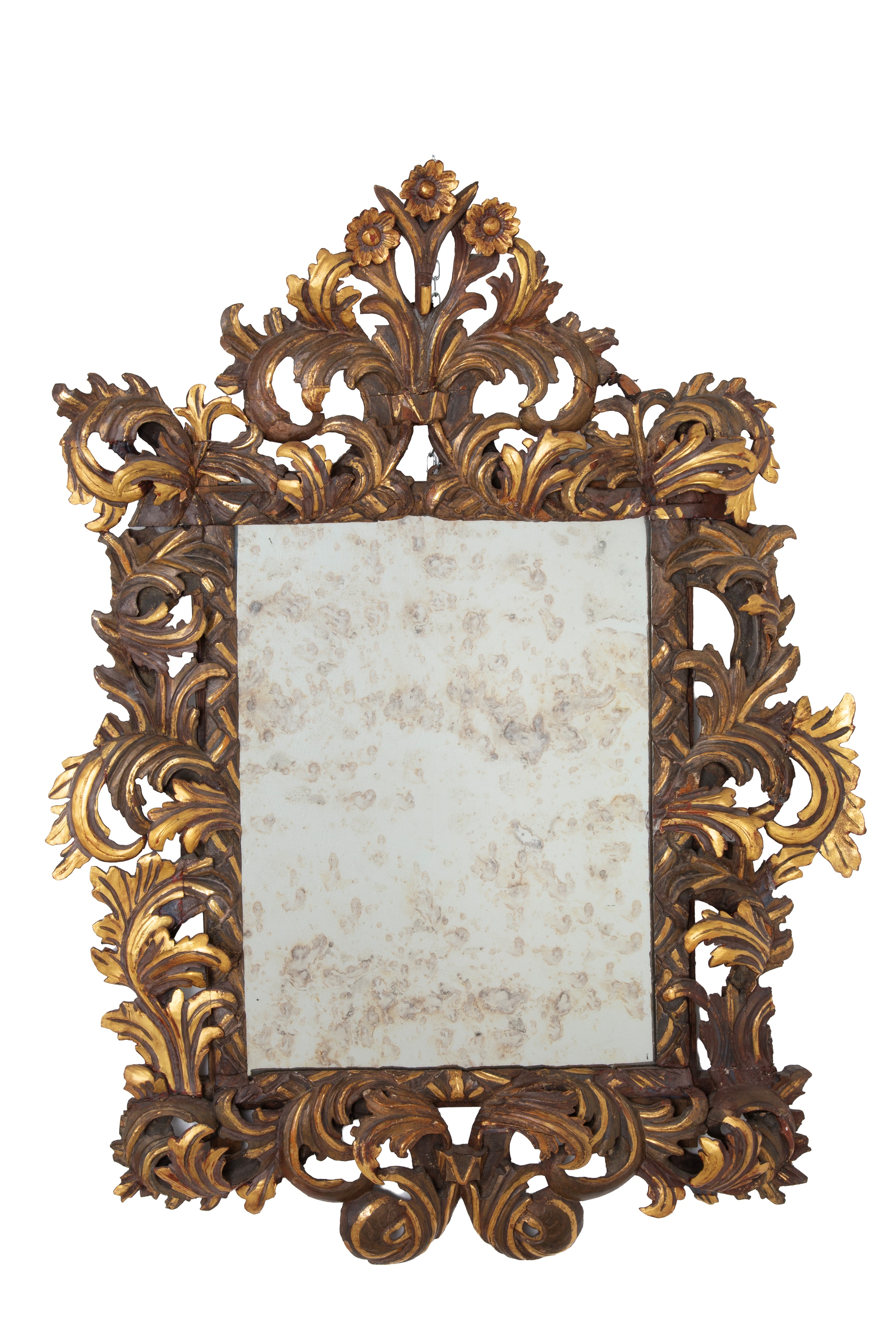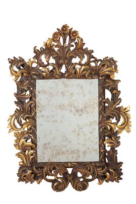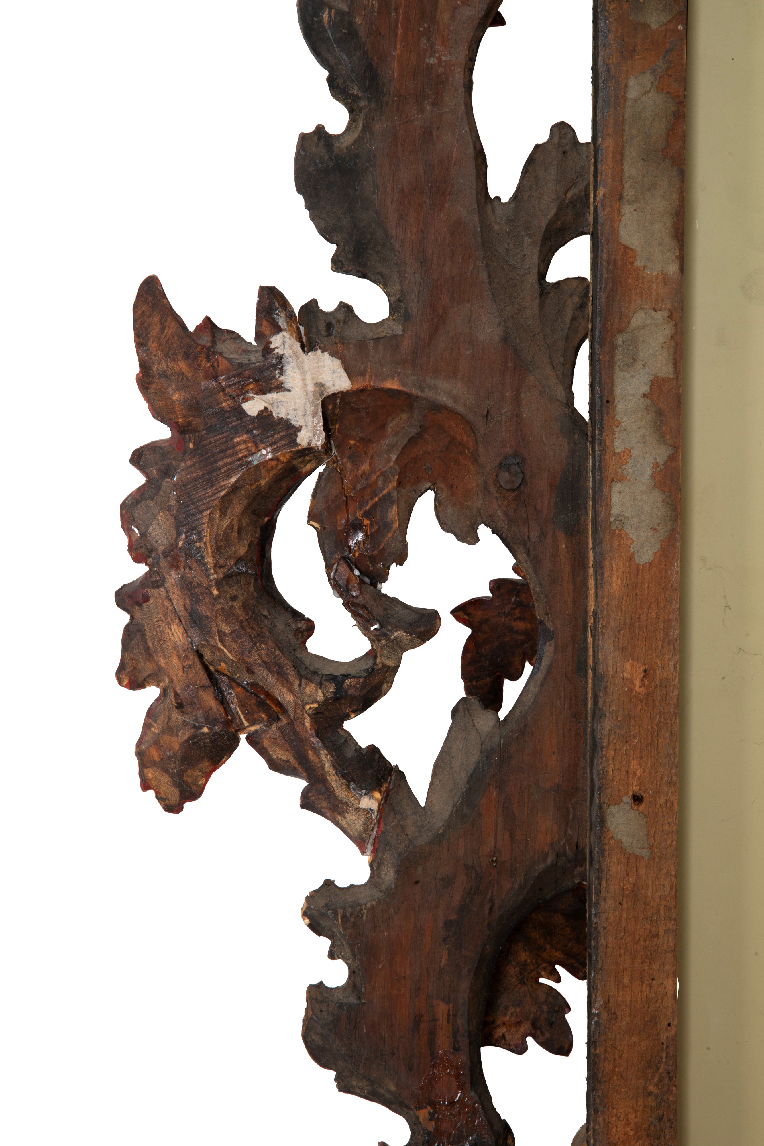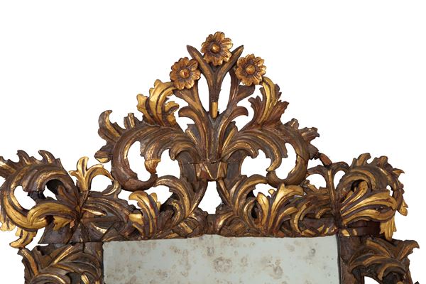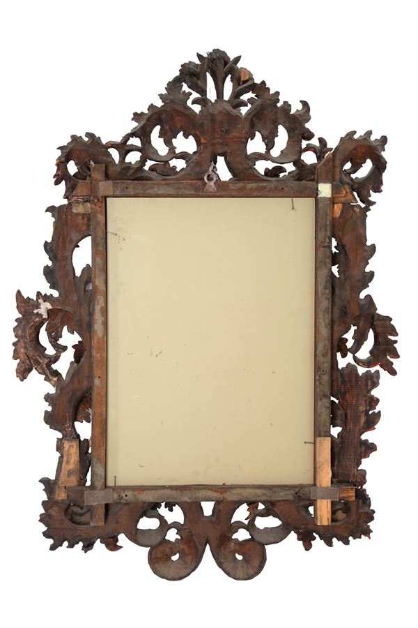 Specchiera in legno intagliato, traforato, laccato e parzialmente dorato. XIX secolo. Difetti.