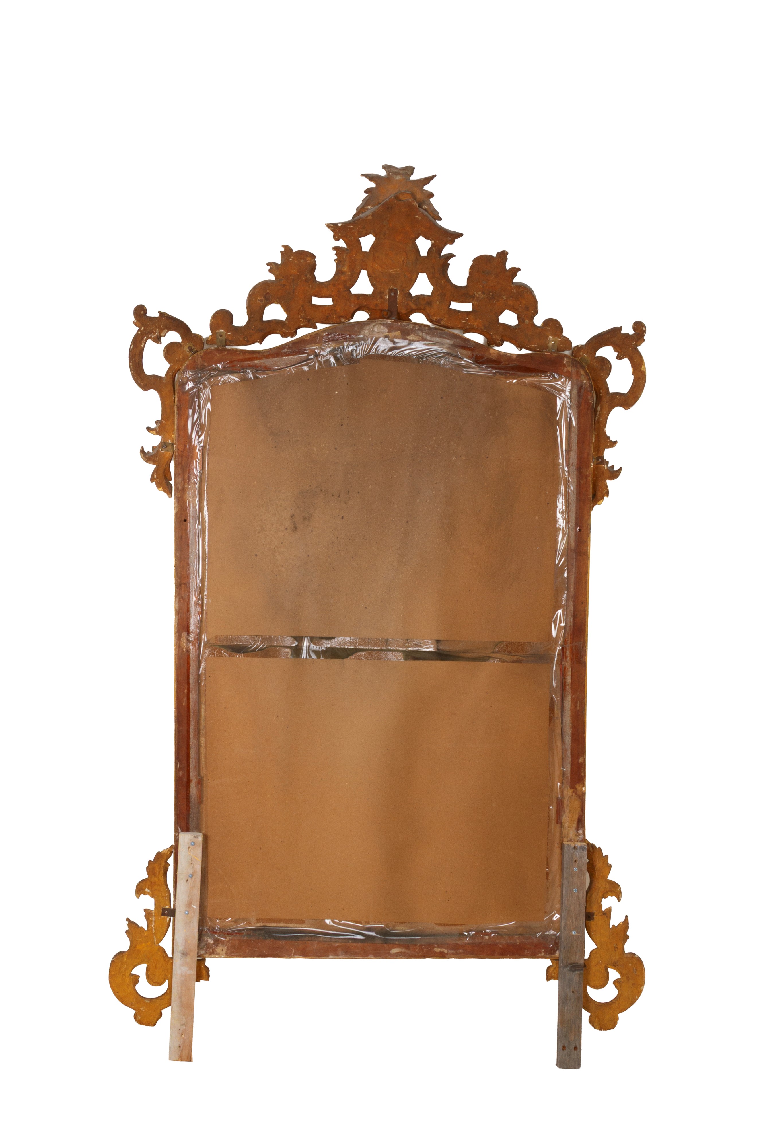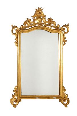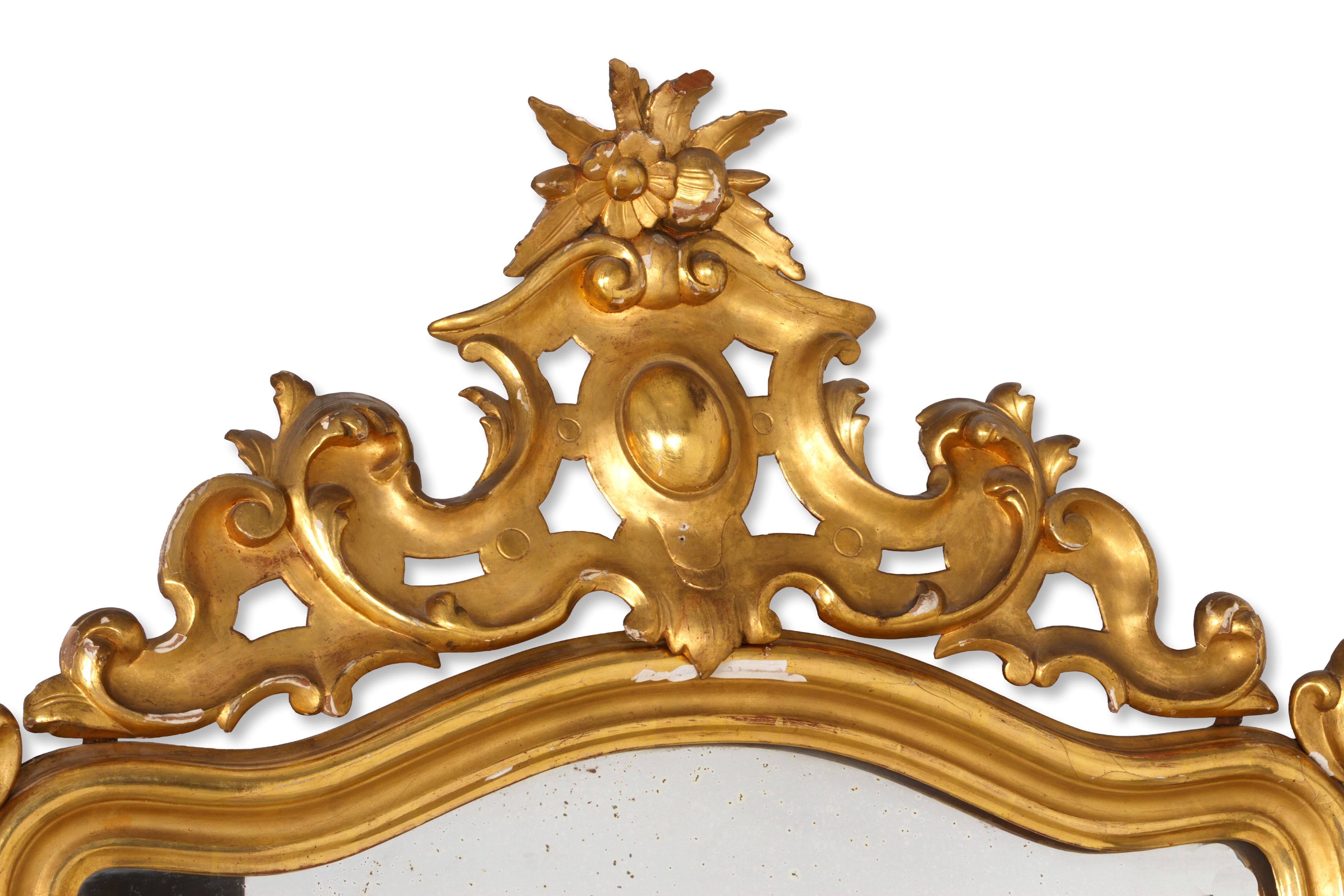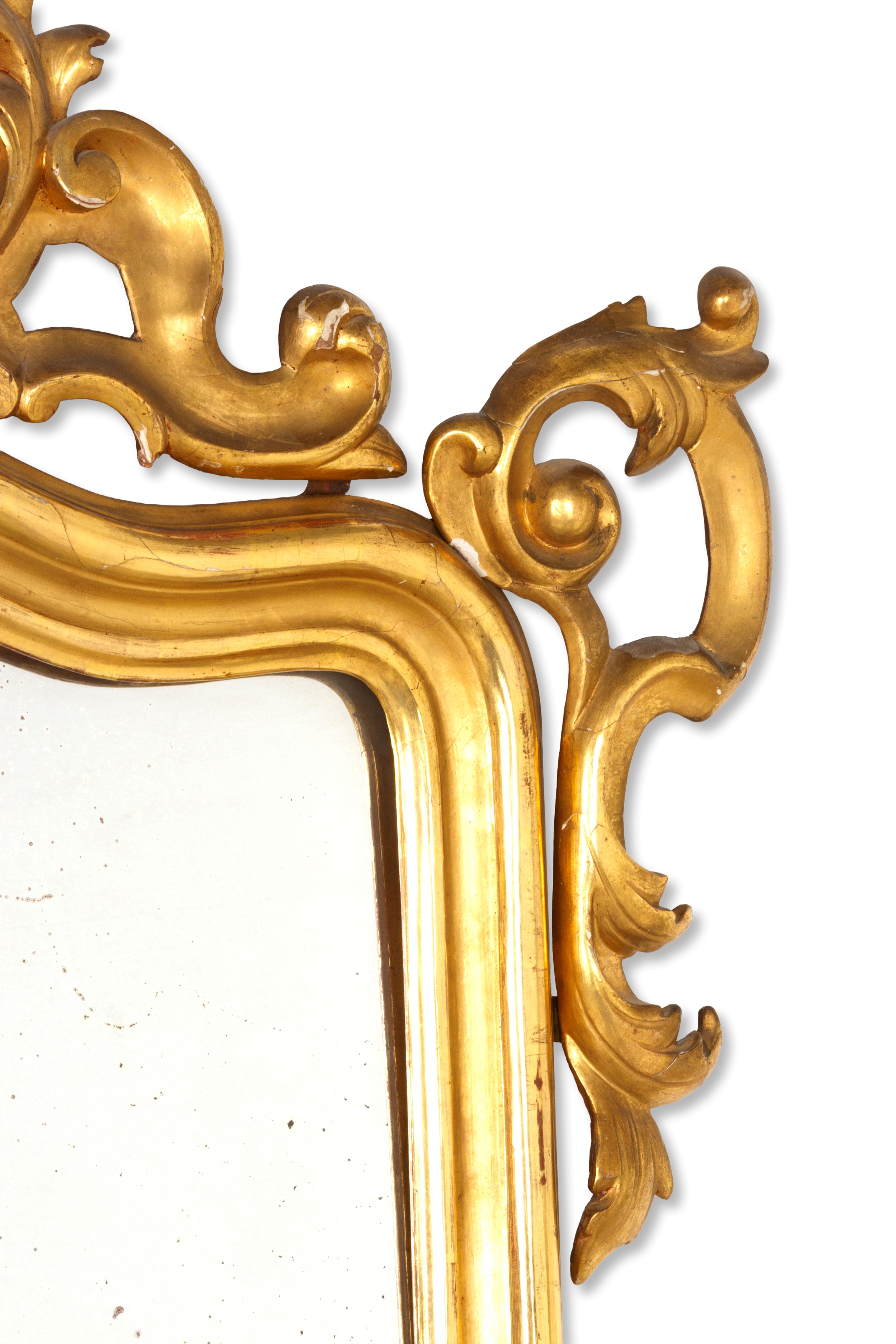 Specchiera in legno intagliato e dorato con cimasa traforata. XIX secolo. Difetti e mancanze.