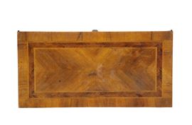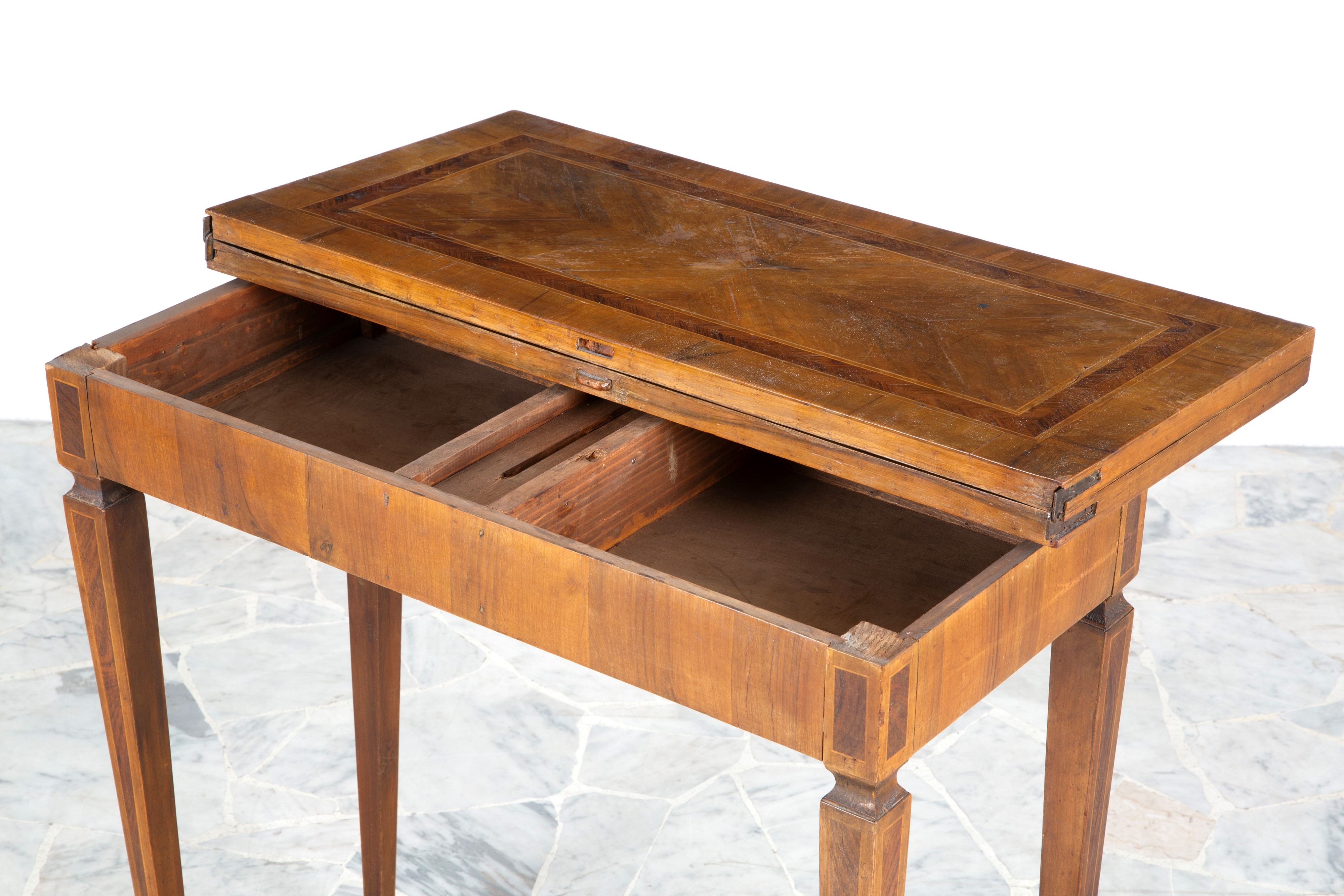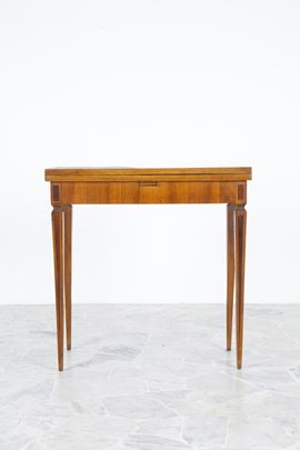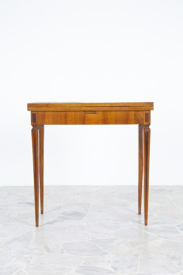 Tavolino da gioco con piano apribile lastronato e filettato in legni vari con gambe piramidali. XIX secolo. Lievi difetti.