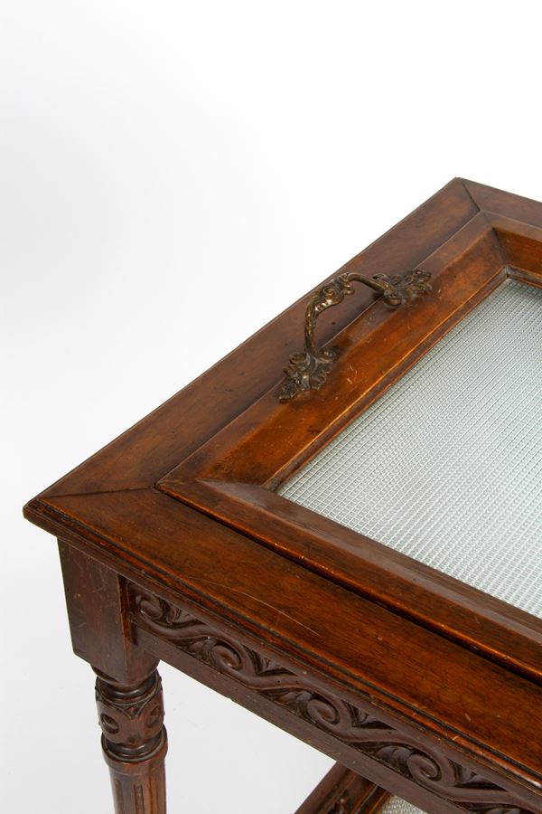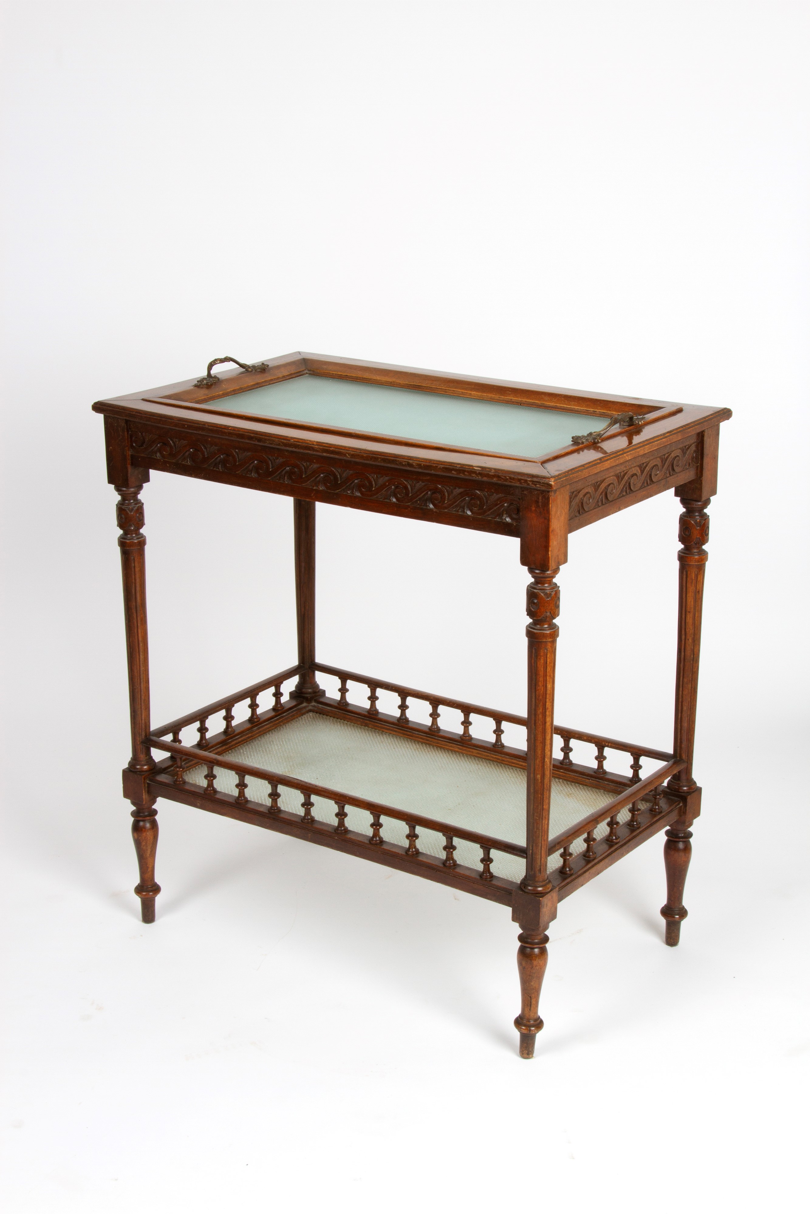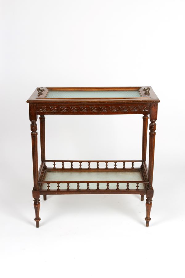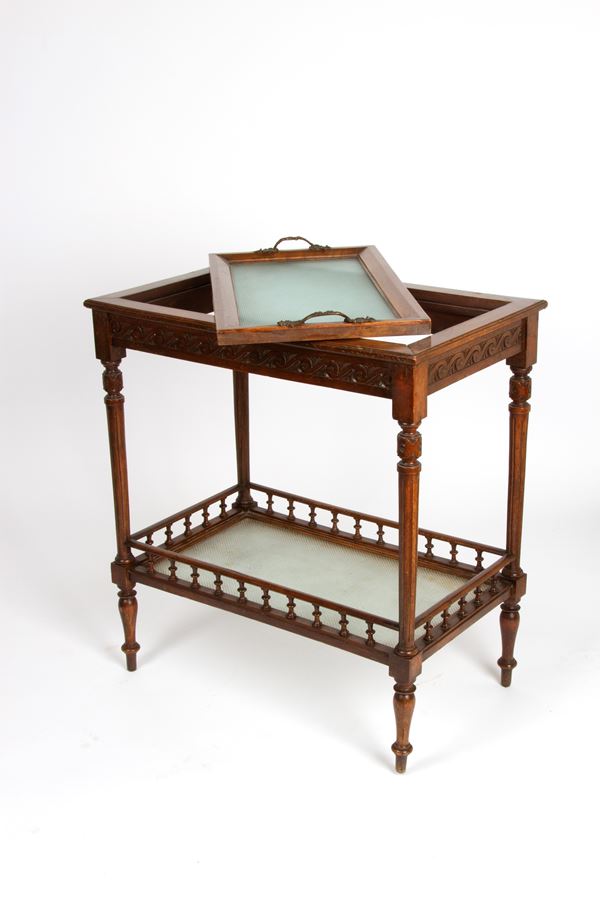 Tavolino porta vassoio in legno intagliato a due ripiani e finiture in bronzo, uno con vassoio estraibile. XX secolo. Lievi difetti.