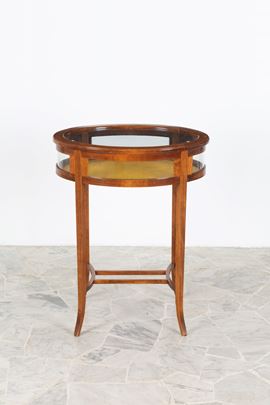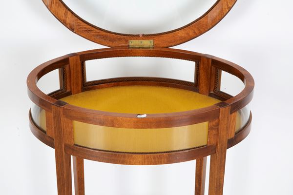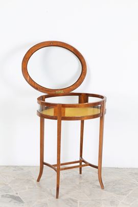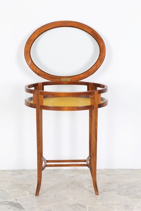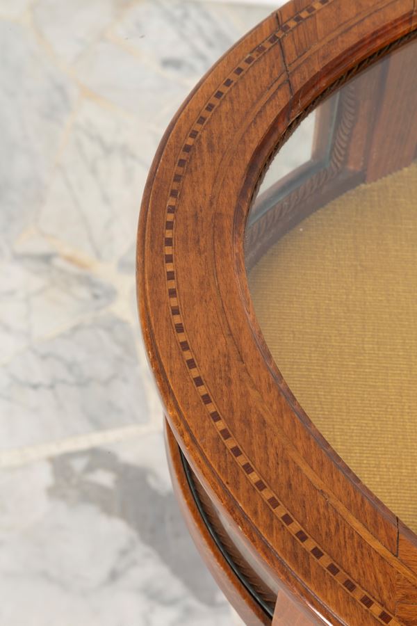 Tavolino vetrinetta lastronato in legno di olmo e filettato. Inizi XX secolo.
