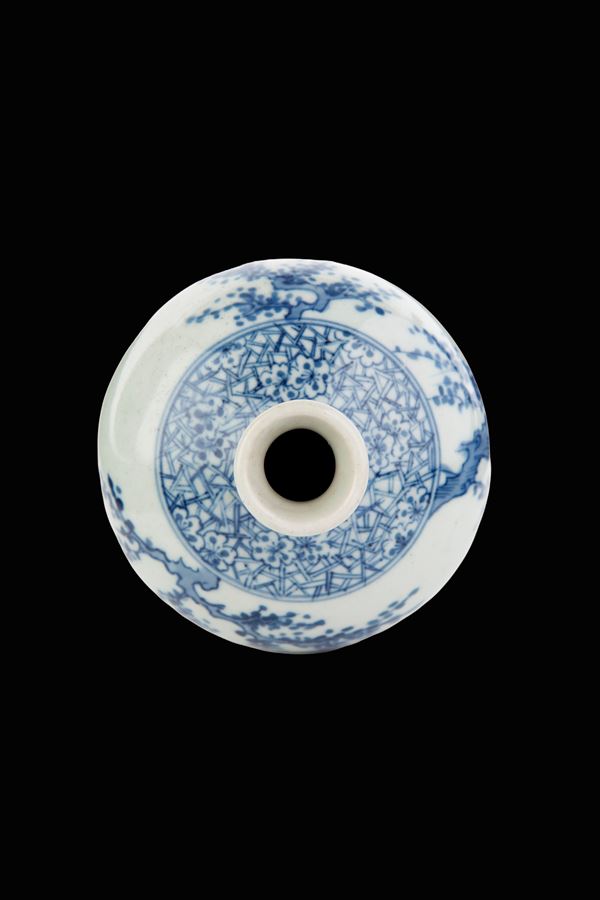 Vasetto in porcellana bianca e blu dipinta con personaggi in un paesaggio. Cina. XIX secolo.