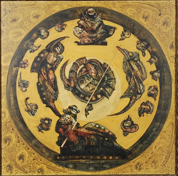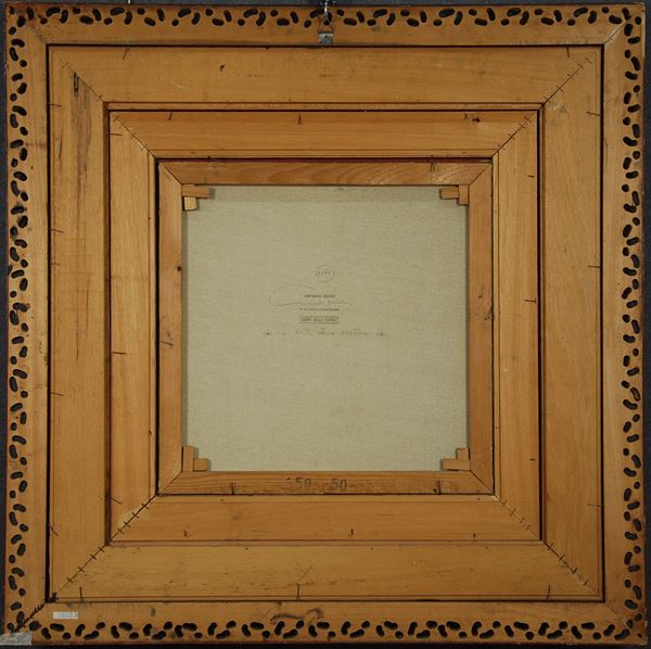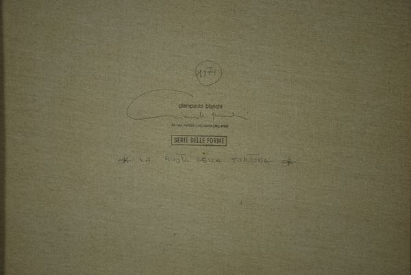 Tecnica mista su tela intitolata "LA RUOTA DELLA FORTUNA". Serie delle Forme. Firmata e datata 1979 in basso al centro. Controfirmata, datata e intitolata sul retro. In bella cornice intagliata.