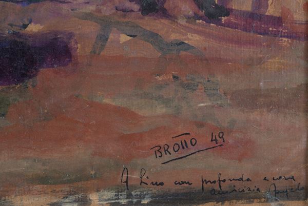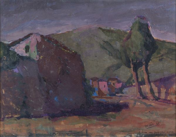 Dipinto olio su carta applicata su tavoletta raffigurante "PAESAGGIO". Firmato, datato 49 e con dedica in basso a destra. In cornice.