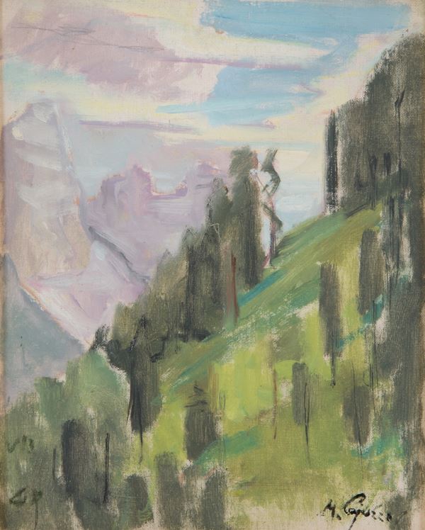 Dipinto tempera su cartone telato raffigurante "BOSCO DI MONTAGNA". Firmato in basso a destra. In cornice.