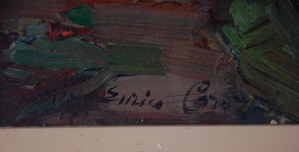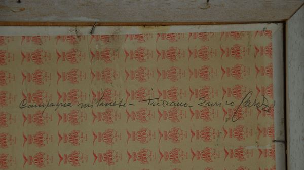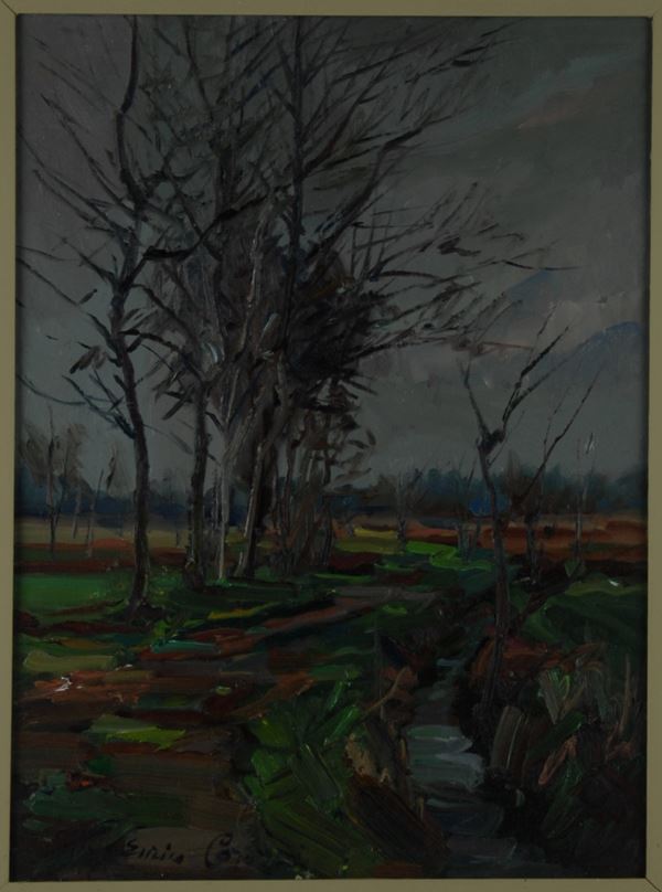 Dipinto olio su cartone telato intitolato ''CAMPAGNE MILANESI - TREZZANO''. Firmato in basso a sinistra. Controfirmato e intitolato sul retro. In cornice.