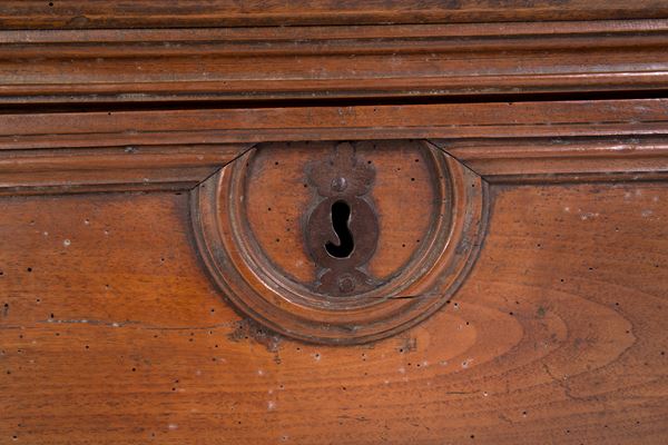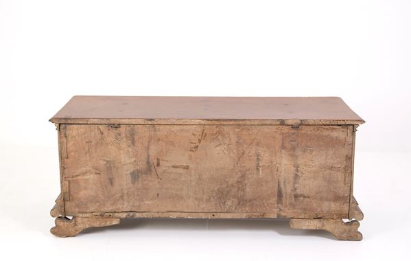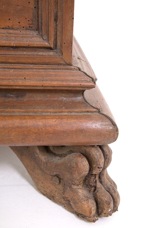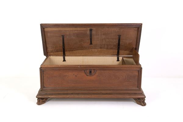 Cassapanca in noce con piedi ferini e maniglie in ferro battuto. XVII secolo.