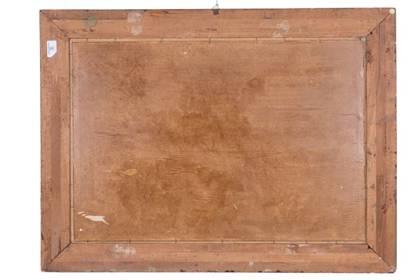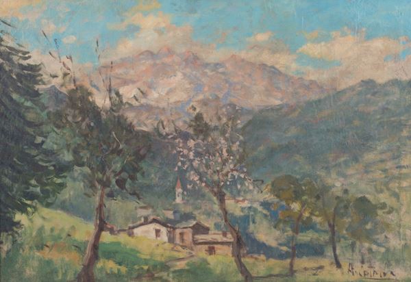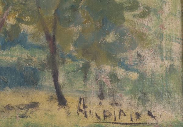 Dipinto olio su tela applicata su tavola raffigurante "PAESAGGIO". Firmato in basso a destra. In cornice.