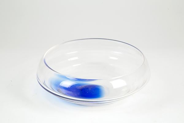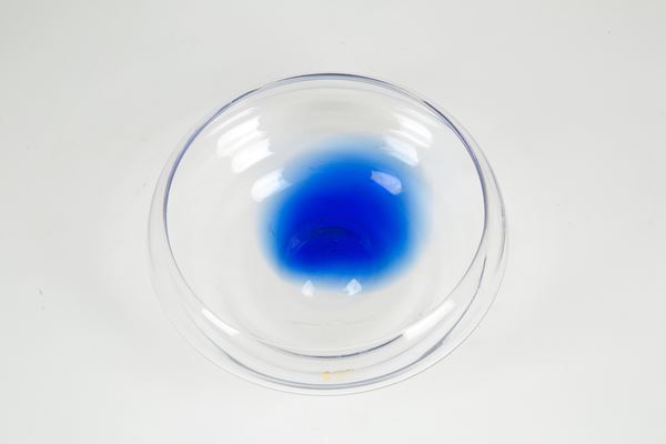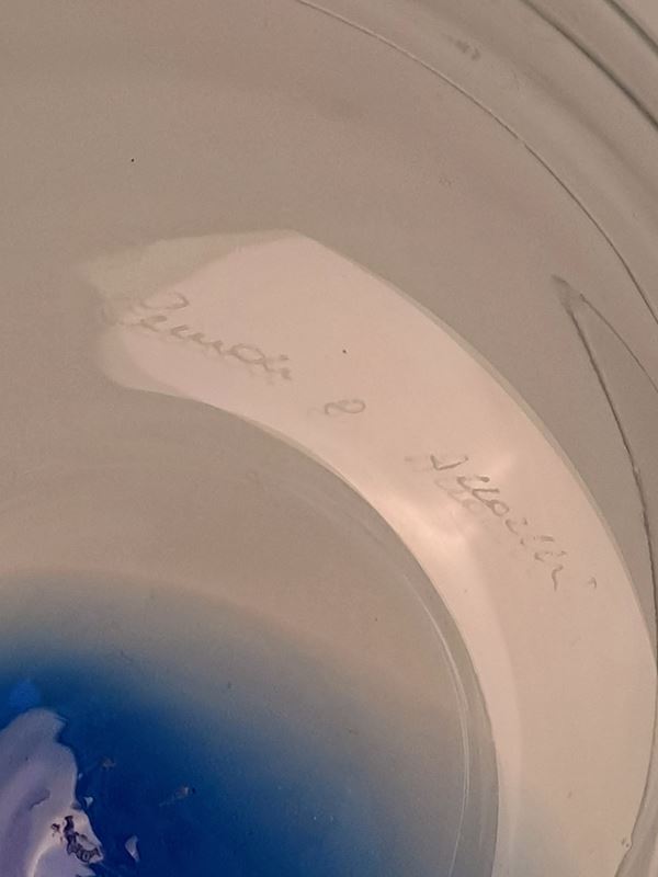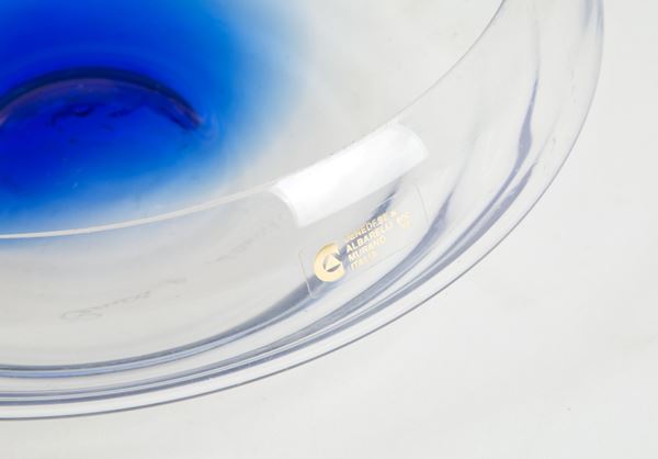 Centrotavola in vetro trasparente con macchia blu. Con etichetta sul lato e firma sul fondo.